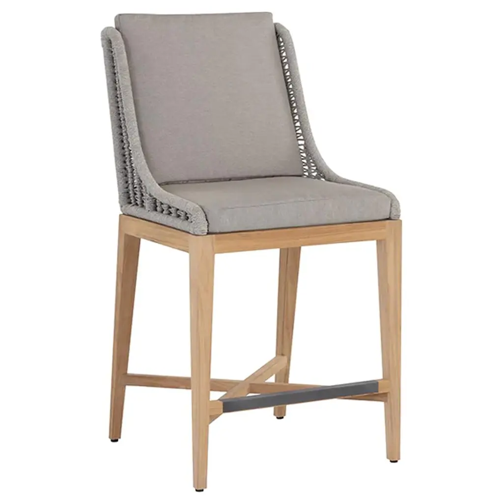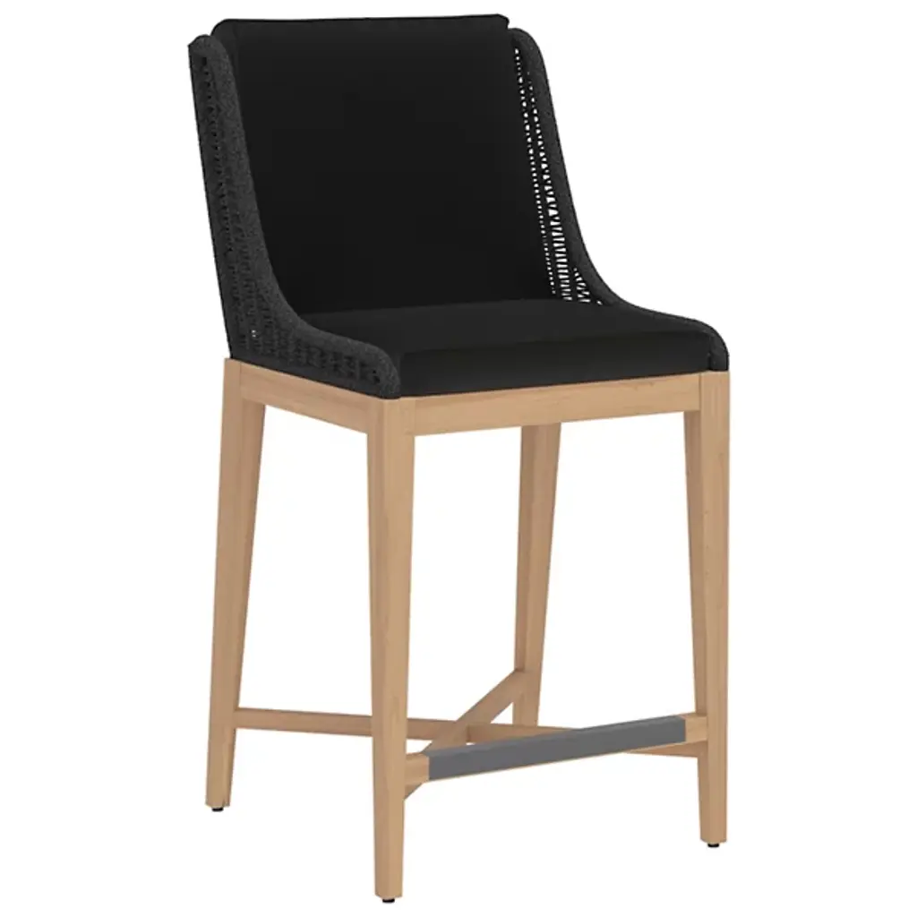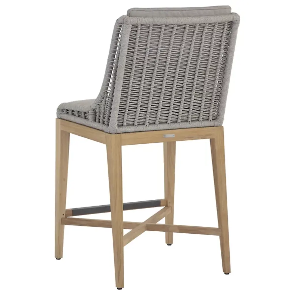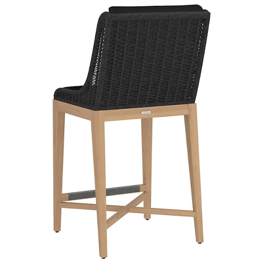 Embark on crafting a chic outdoor dining haven with the Sorrento Outdoor Bar/Counter Stool from Sunpan, a sublime addition to any modern alfresco setting. This elegant barstool boasts a resilient Arashi black fabric seat and a dark greymix weave exterior, perfectly complemented by a sturdy natural teak wood base. As time elapses, the teak wood base gracefully evolves to a lustrous silver-grey hue, owing to its high oil content that imbues it with exceptional outdoor durability. Its weather, UV, and tear-resistant cushions ensure enduring comfort, preserving the timeless allure of this piece, which seamlessly blends Coastal & Nautical Modern aesthetics with contemporary sophistication.