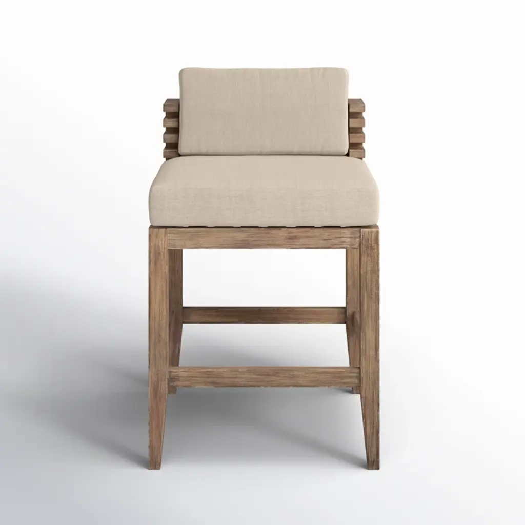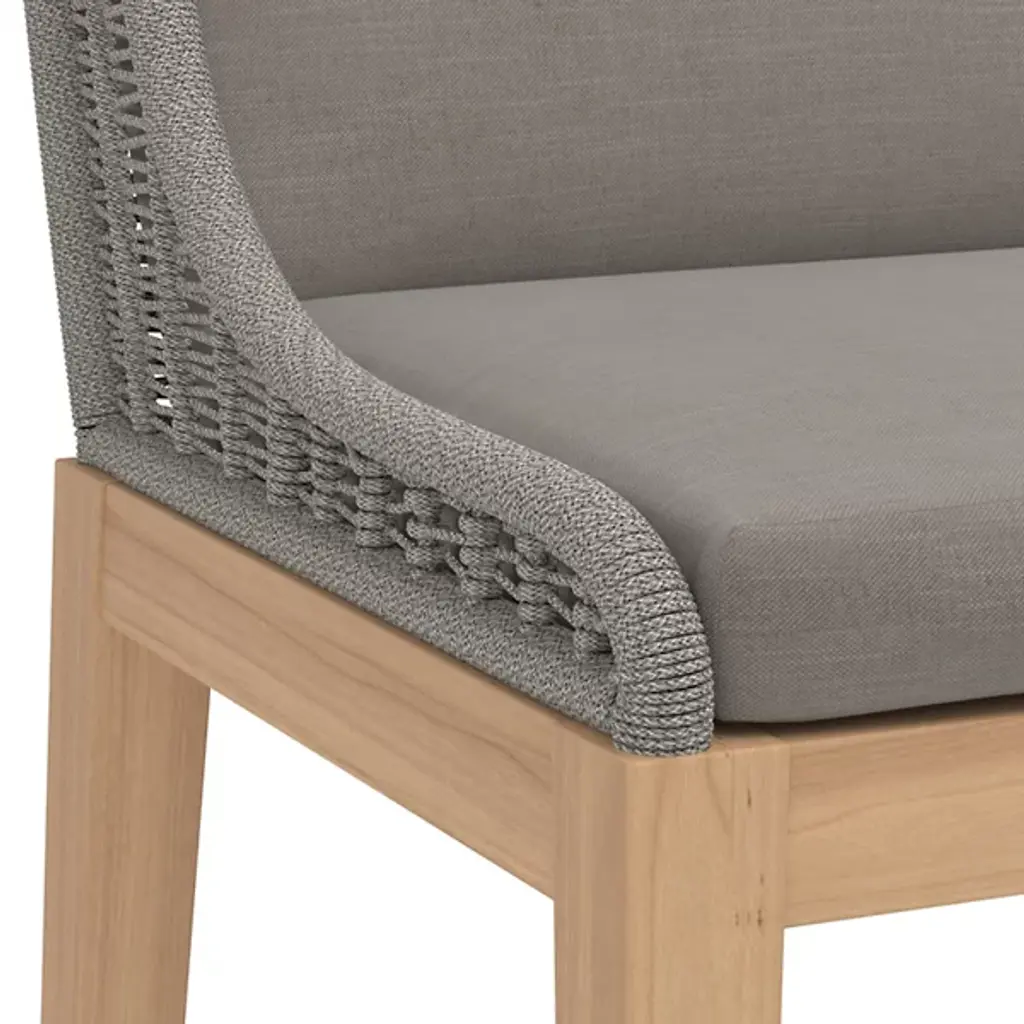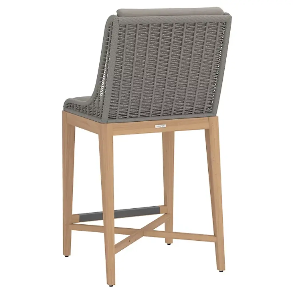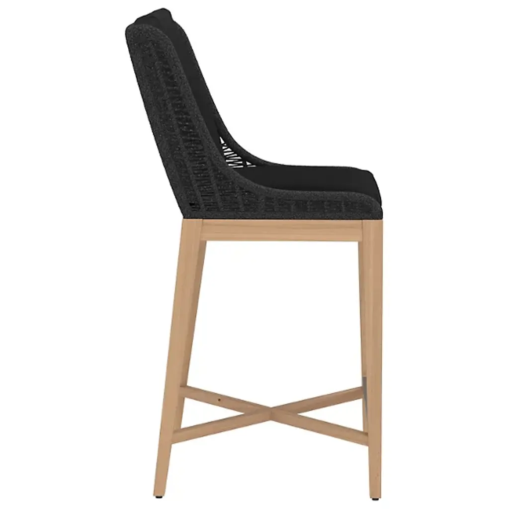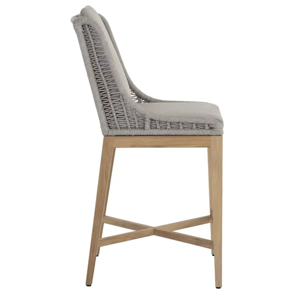 Embark on crafting a chic outdoor dining haven with the Sorrento Outdoor Bar/Counter Stool from Sunpan, a sublime addition to any modern alfresco setting. This elegant barstool boasts a resilient Arashi black fabric seat and a dark greymix weave exterior, perfectly complemented by a sturdy natural teak wood base. As time elapses, the teak wood base gracefully evolves to a lustrous silver-grey hue, owing to its high oil content that imbues it with exceptional outdoor durability. Its weather, UV, and tear-resistant cushions ensure enduring comfort, preserving the timeless allure of this piece, which seamlessly blends Coastal & Nautical Modern aesthetics with contemporary sophistication.