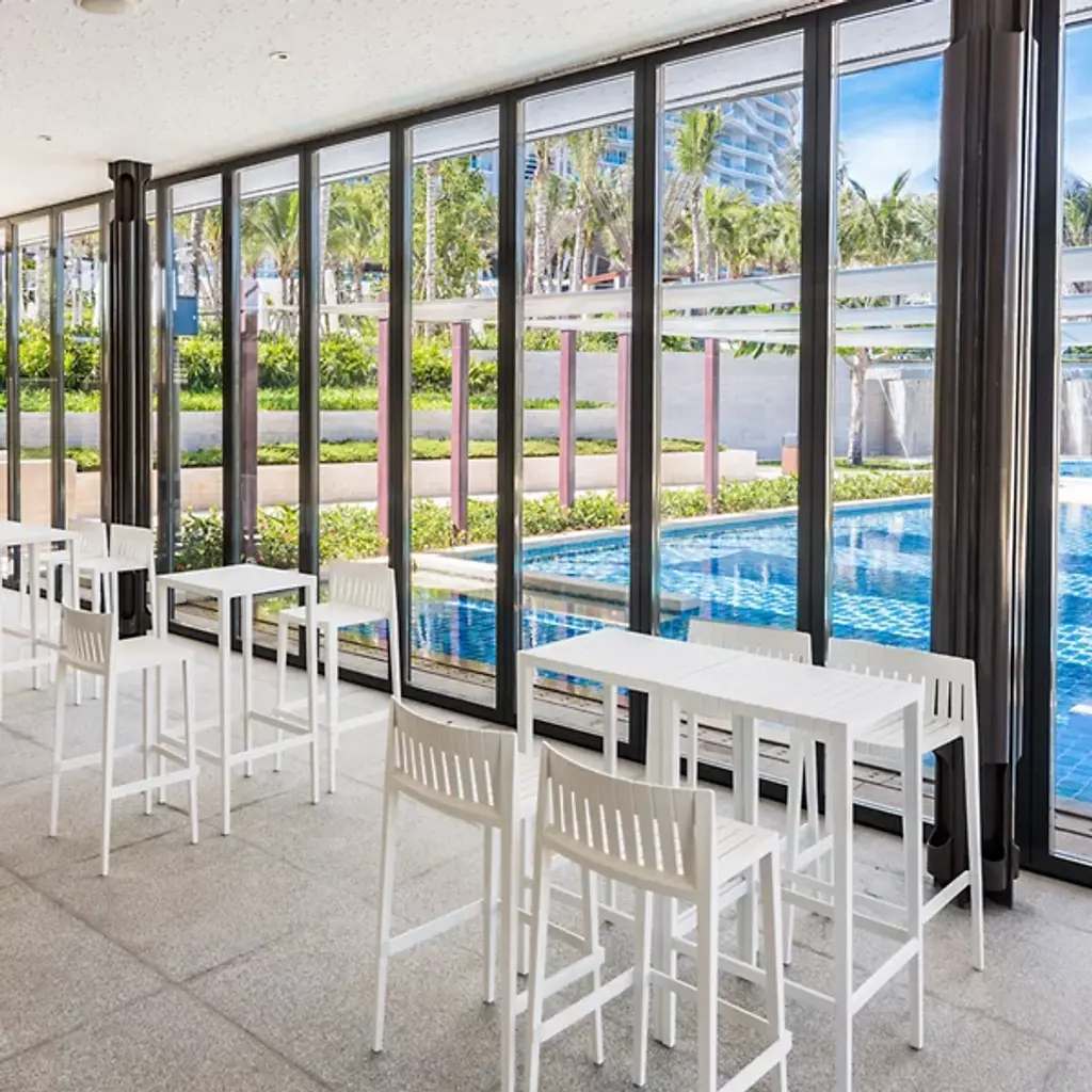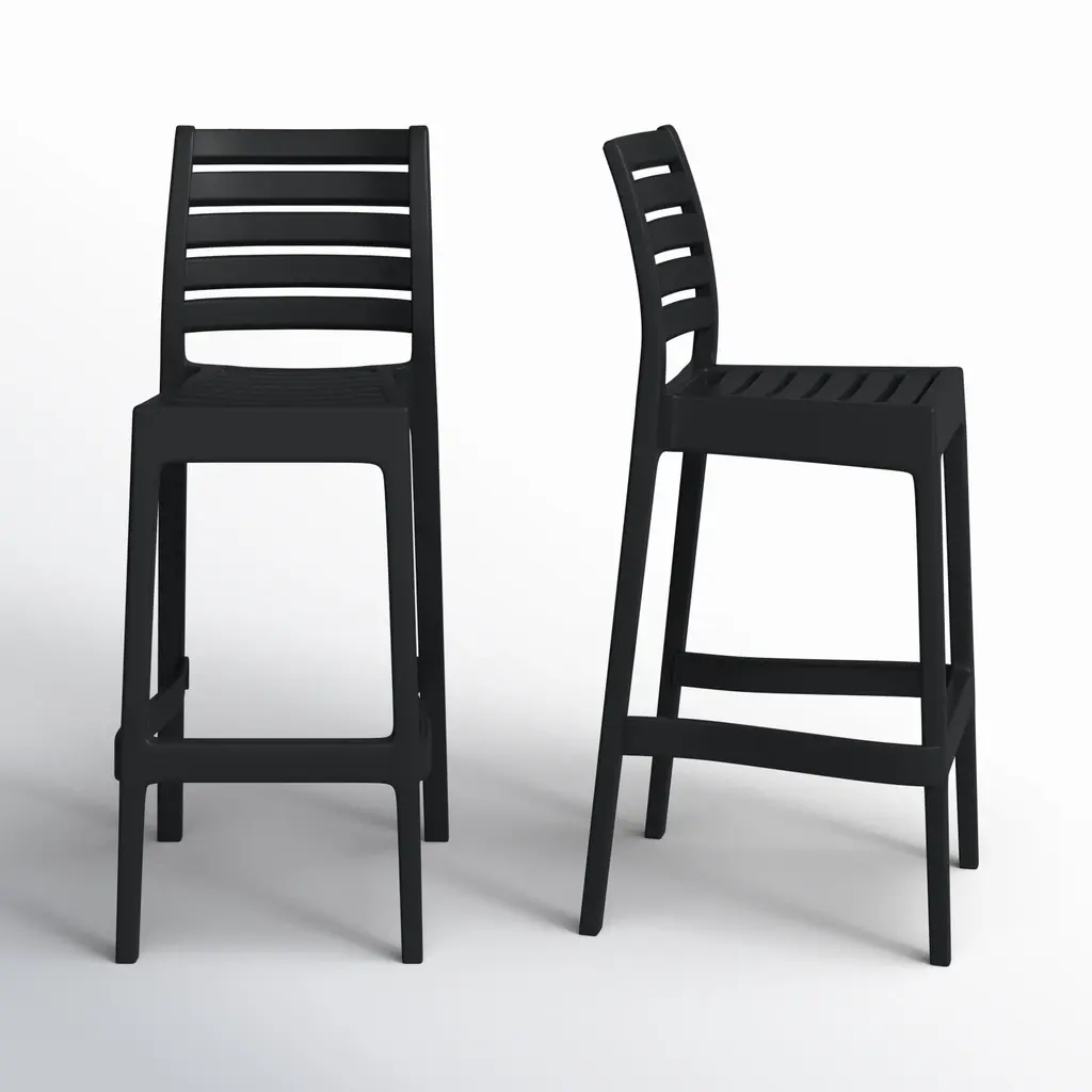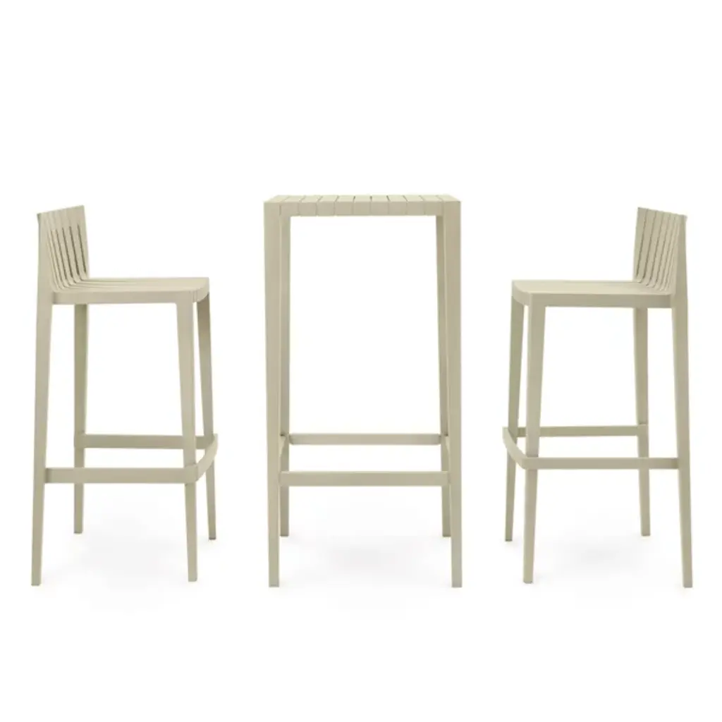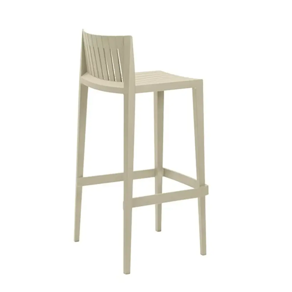 Savor the outdoors and enjoy a citrusy spritz on this comfortable piece. The Spritz Bar Stool from Vondom adds a new, yet familiar personality to your outdoor bar with a wood-fence-inspired design. Its stylish and familiar look mix Northern European and Mediterranean design. The repeating linear pattern of wooden picket fences works into the refined construction of the low-profile back and seat rest. The fine crevices in between make warm days a delight as they allow for the passage of cooling air. The tall base and footrest keep you in a comfortable posture. Made from polypropylene, the bar stool stands out as a weather-resistant piece.