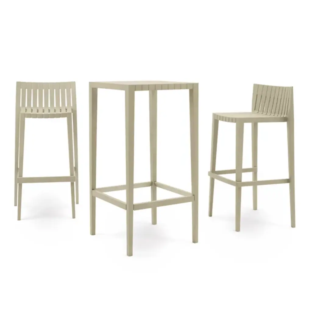 Savor the outdoors and enjoy a citrusy spritz on this comfortable piece. The Spritz Bar Stool from Vondom adds a new, yet familiar personality to your outdoor bar with a wood-fence-inspired design. Its stylish and familiar look mix Northern European and Mediterranean design. The repeating linear pattern of wooden picket fences works into the refined construction of the low-profile back and seat rest. The fine crevices in between make warm days a delight as they allow for the passage of cooling air. The tall base and footrest keep you in a comfortable posture. Made from polypropylene, the bar stool stands out as a weather-resistant piece.