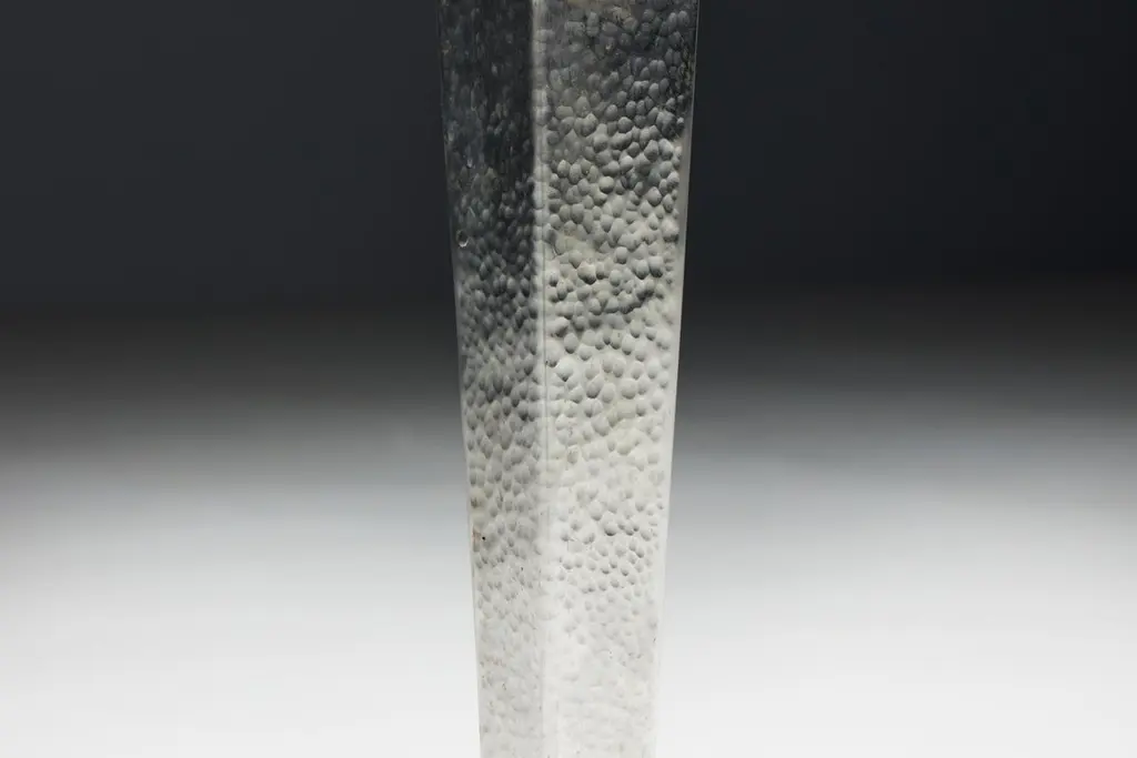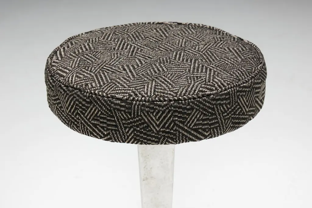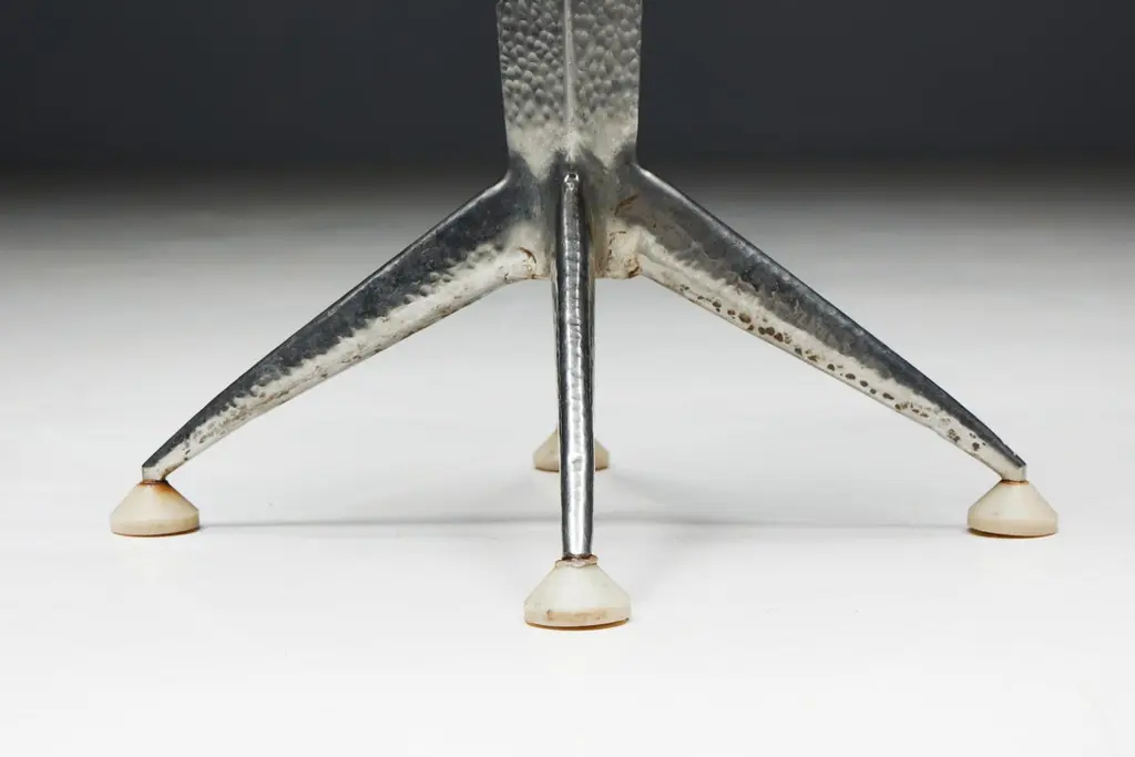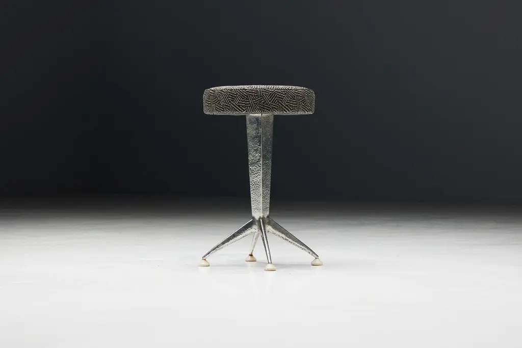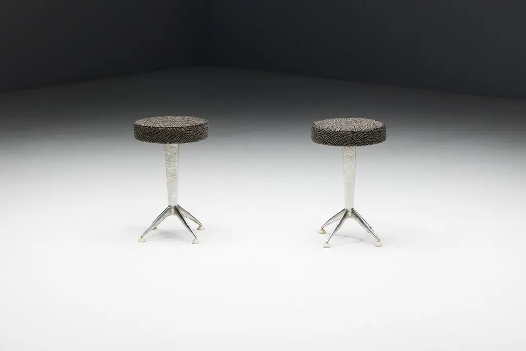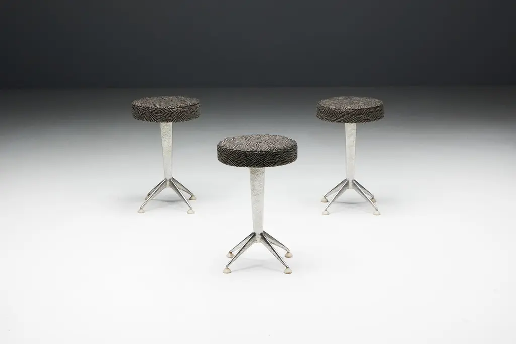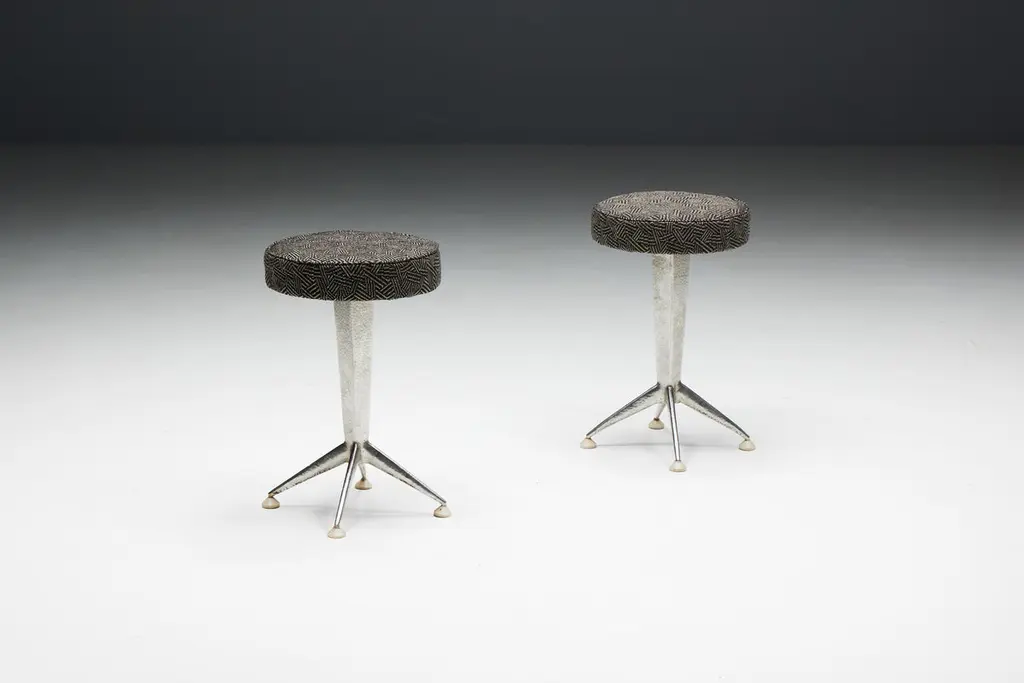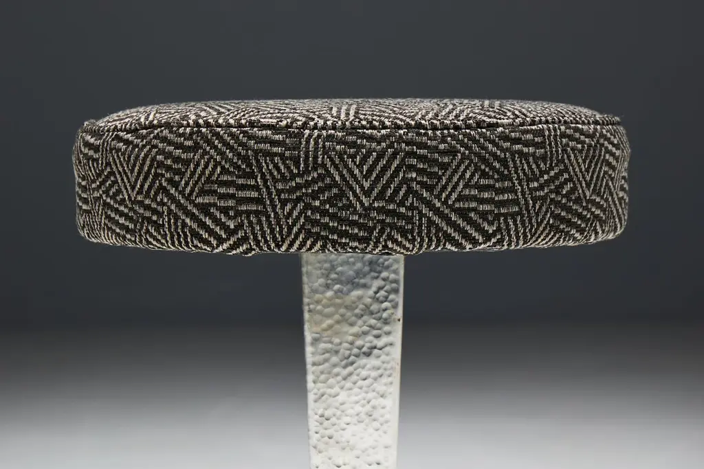 Hammered steel bar stools, inspired by the sleek lines and geometric patterns of Art Deco design. These stools feature round fabric seating in an Art Deco print atop hammered steel legs, embodying the sophistication and glamour reminiscent of the Expo 58 era. Whether you're hosting a chic cocktail party or enjoying a casual breakfast, these stools promise to elevate any space with their timeless elegance. Priced per piece.