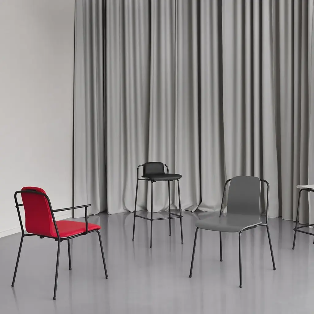 There is something virtually graphic about the way the slender steel frame grows out below the Studio chair's seat and back, framing the molded shell in an airy design. The flowing lines stand out in an eye-catching silhouette, like a line drawing or a pictogram, just as the empty spaces between the frame and the back act to define the shape. The simple construction in veneer and steel tubing directs one's thoughts towards older French factory chairs, giving Studio its industrial notes. A design that attracts attention, but glows with pure simplicity. The multi-purpose Studio chair series is designed for use in both domestic and public spaces. The series includes chairs, armchairs and barstools in two heights. All models are stackable, making the range suitable for restaurants and educational facilities with the need for transformable areas. The steel frame makes it easy to grab hold of the chairs and move them around as required.