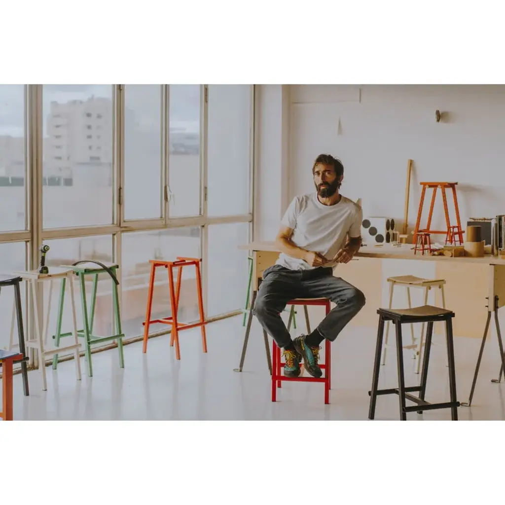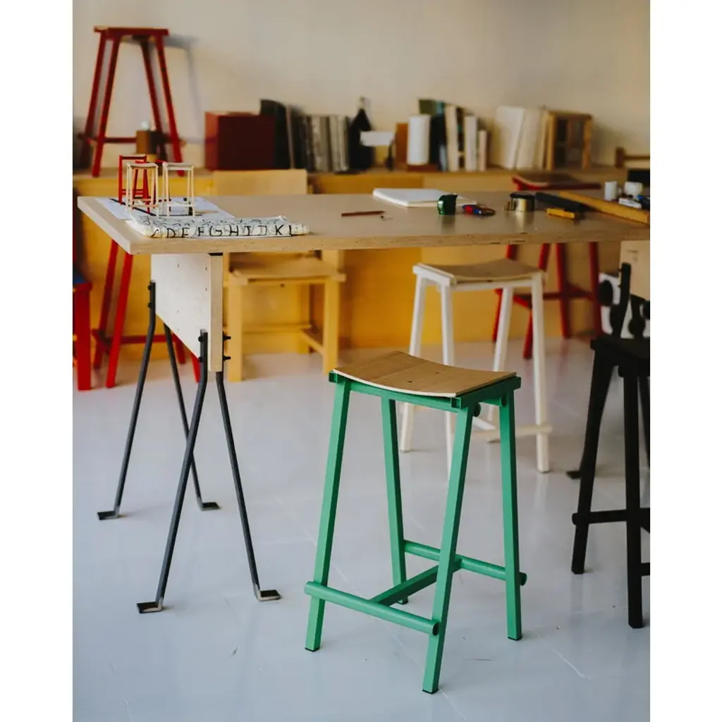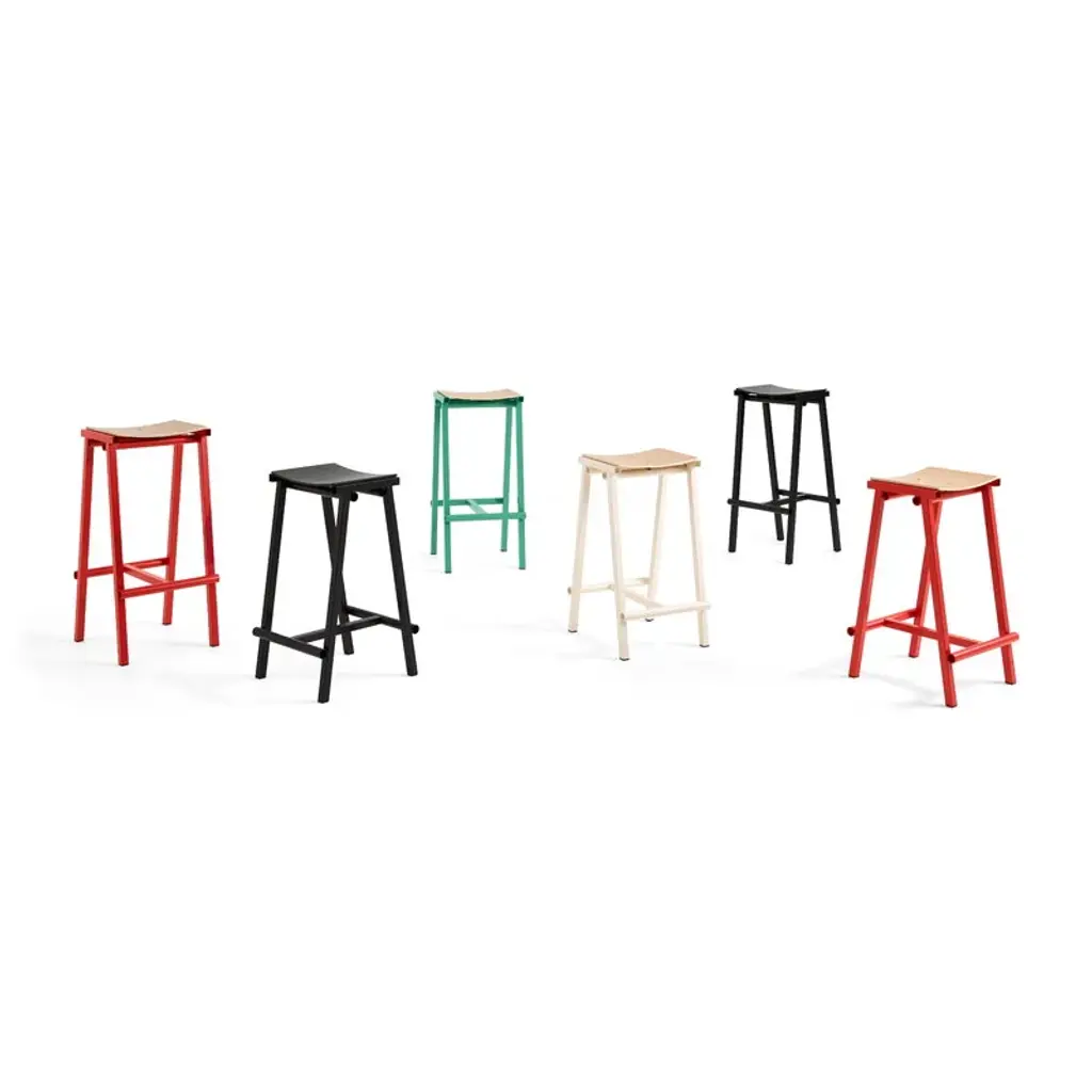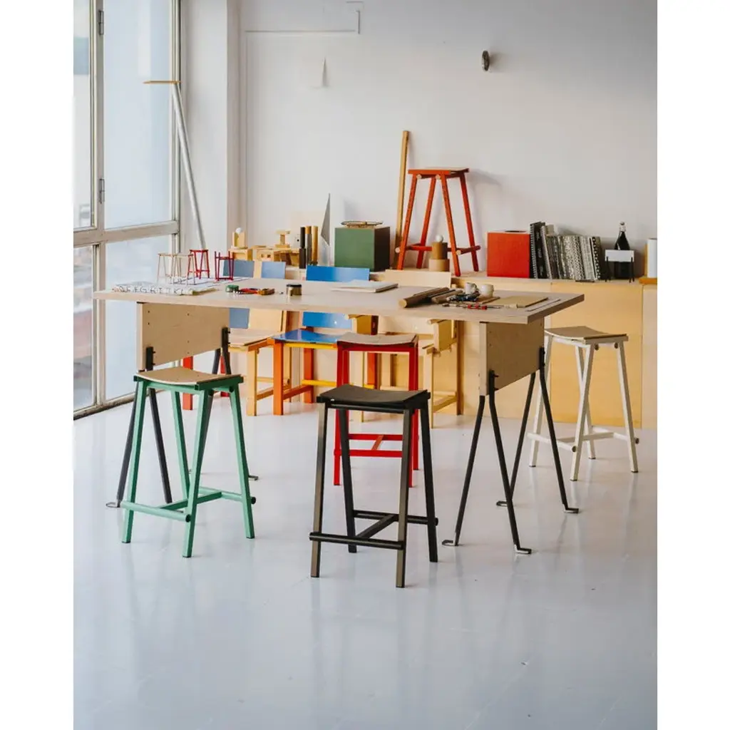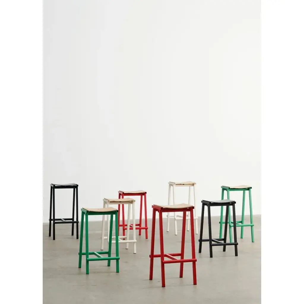 HAY's Taburete 8 is a simple yet expressive bar stool that brings a touch of joy around any kitchen island, bar counter or meeting table. The industrial-style frame and standout footrests of the Taburete 8 bar stool are crafted from painted steel tubes. The oak veneered seat adds a cozy contrast with its gracefully curved design, achieved by simply fastening it to the steel frame under pressure. Introduced by HAY in 2024, Taburete 8 is part of the Familia 8 chair collection by Spanish designer Marc Morro. It is available in two different heights and several color options ranging from neutral tones to vibrant hues, perfect for mixing and matching. If you enjoy a splash of color, these hues combine beautifully to create a lively look!