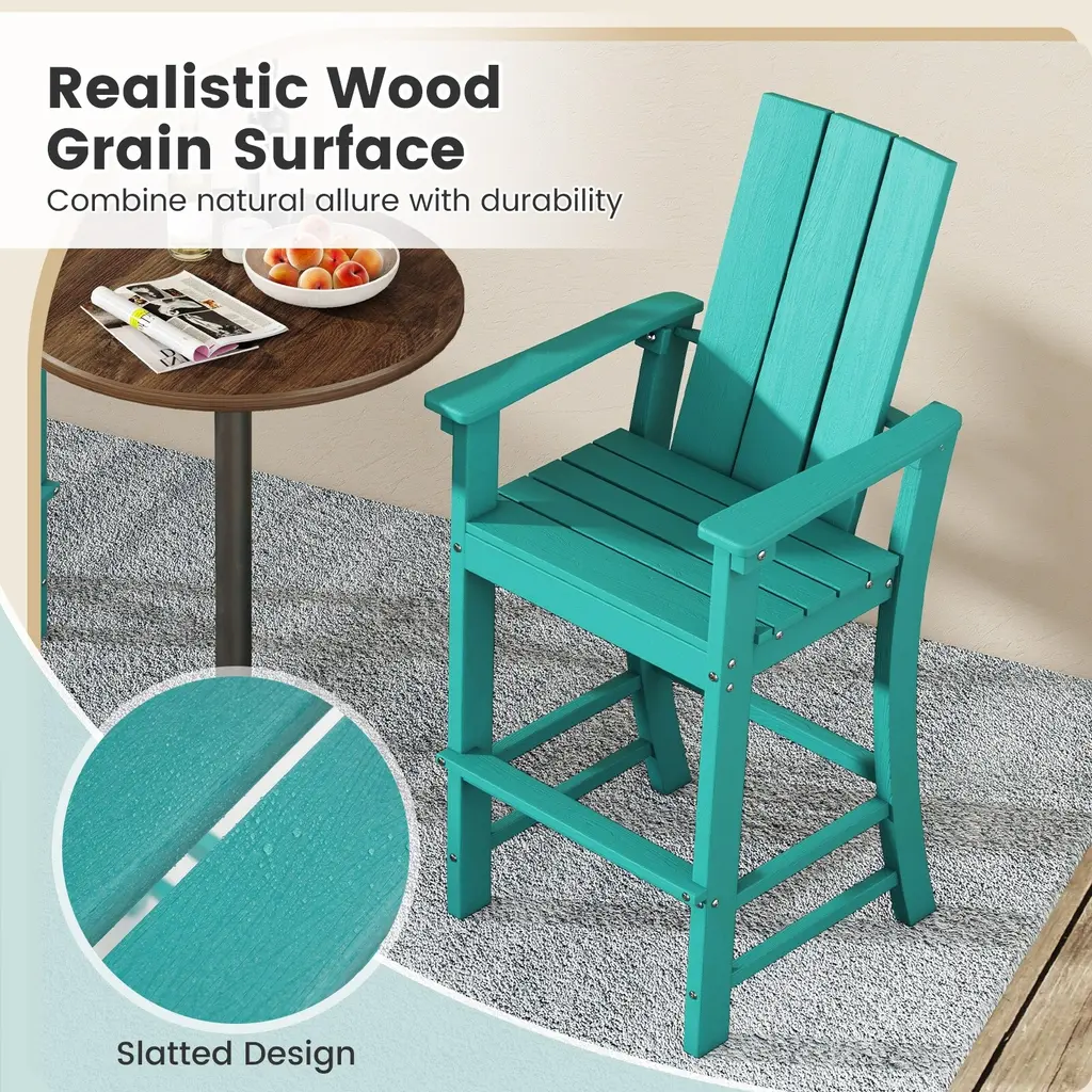 Specifications:Description:This tall Adirondack chair is crafted for outdoor use, combining style, comfort, and durability. Made from weather-resistant HDPE material with stainless steel hardware, it is built to withstand outdoor conditions without damage. Its realistic wood grain texture adds a natural look, while the ergonomic design with a 104° reclined backrest, wide armrests, and a built-in footrest ensures a comfortable lounging experience. The reinforced frame supports up to 330 lbs, providing stability for various outdoor spaces like patios, decks, and pool areas. With a 30-inch seat height, it pairs perfectly with most bar tables and counters. Easy to assemble with minimal tools and low maintenance, this bar height chair is designed for hassle-free enjoyment. Available in Black, Grey, Navy Blue, and Turquoise.Key Features● Weather-Resistant Durability: Made from all-weather HDPE material and equipped with stainless steel hardware, the tall Adirondack chair is ready to withstand the elements without damage or rust. The exquisite and realistic wood grain texture will bring a touch of natural elegance.● Comfort-Oriented Design: The outdoor bar height stool features an ergonomic design with a 104° reclined backrest for maximum relaxation. Its wide armrests bring added comfort, and a built-in footrest complements for a truly lounging experience.● Craftsmanship Meets Strength: The tall patio chair boasts exquisite craftsmanship with sleek burr-free surface. Designed for your peace of mind, it also features sturdy construction with a reinforced frame for enhanced stability, supporting up to 330 lbs.● Bar Seating Height: With a 30-inch tall seat, the tall Adirondack chair for outside is well-suited for most counters and bar tables. It is a versatile addition to different outdoor settings, including patios, decks, and pool sides.● User-Friendly Assembly and Maintenance: Designed for easy installation with clear instructions and minimal required tools, the high back bar chair gets you sitting comfortably in no time! Additionally, its sleek and waterproof surface requires low maintenance.