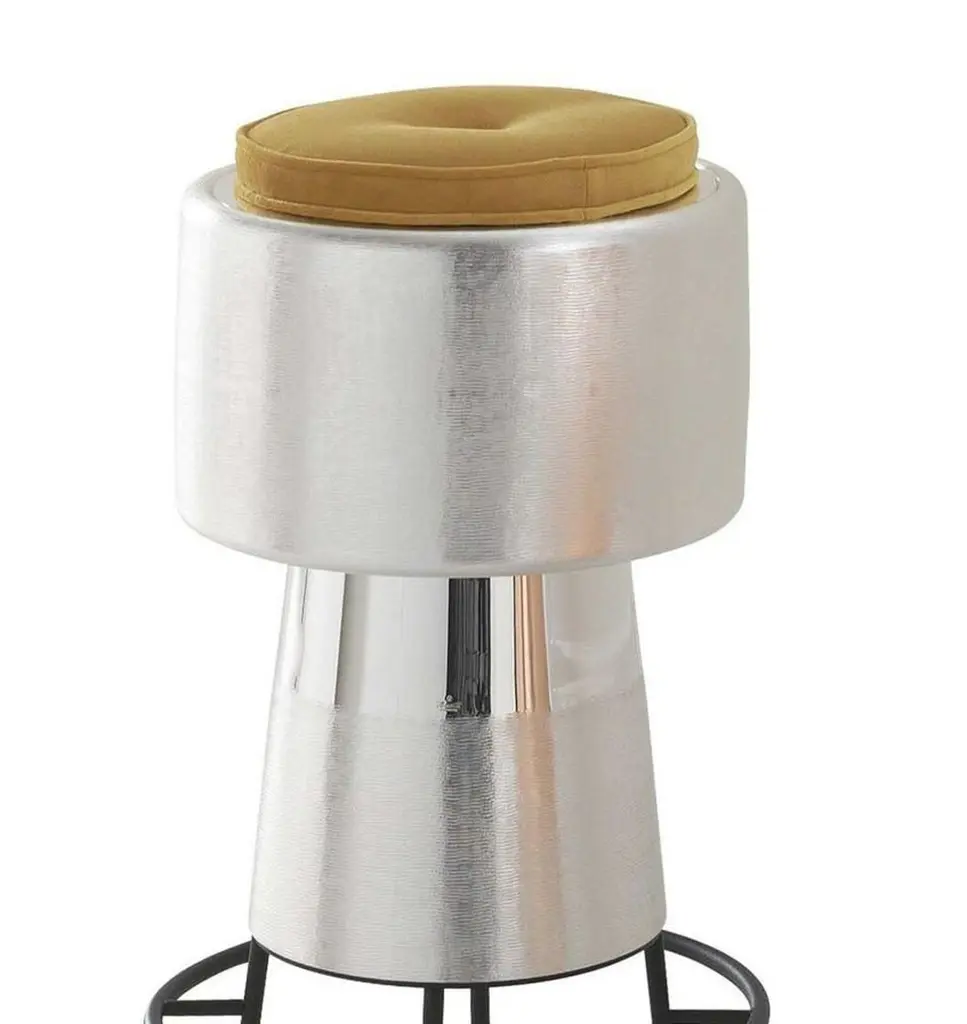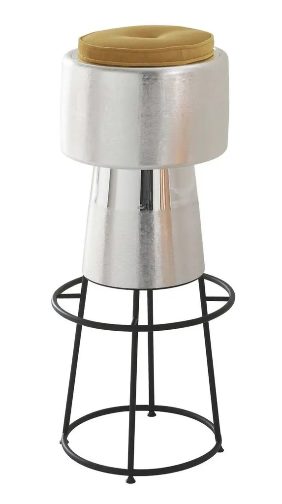 A sculptural work of art, this exquisite stool boasts a cork shape mounted on a metal open structure. Made of silver with a brushed finish, its striking design is completed with a soft and refined yellow velvet seat. Moreover, this original and plush design can also be used as a practical and decorative occasional table, a box or a champagne bucket.