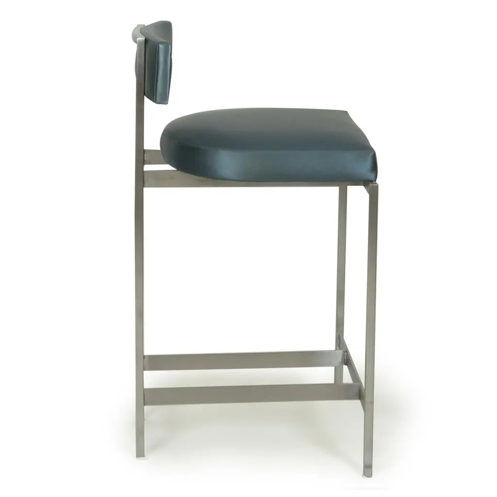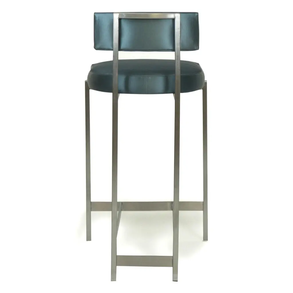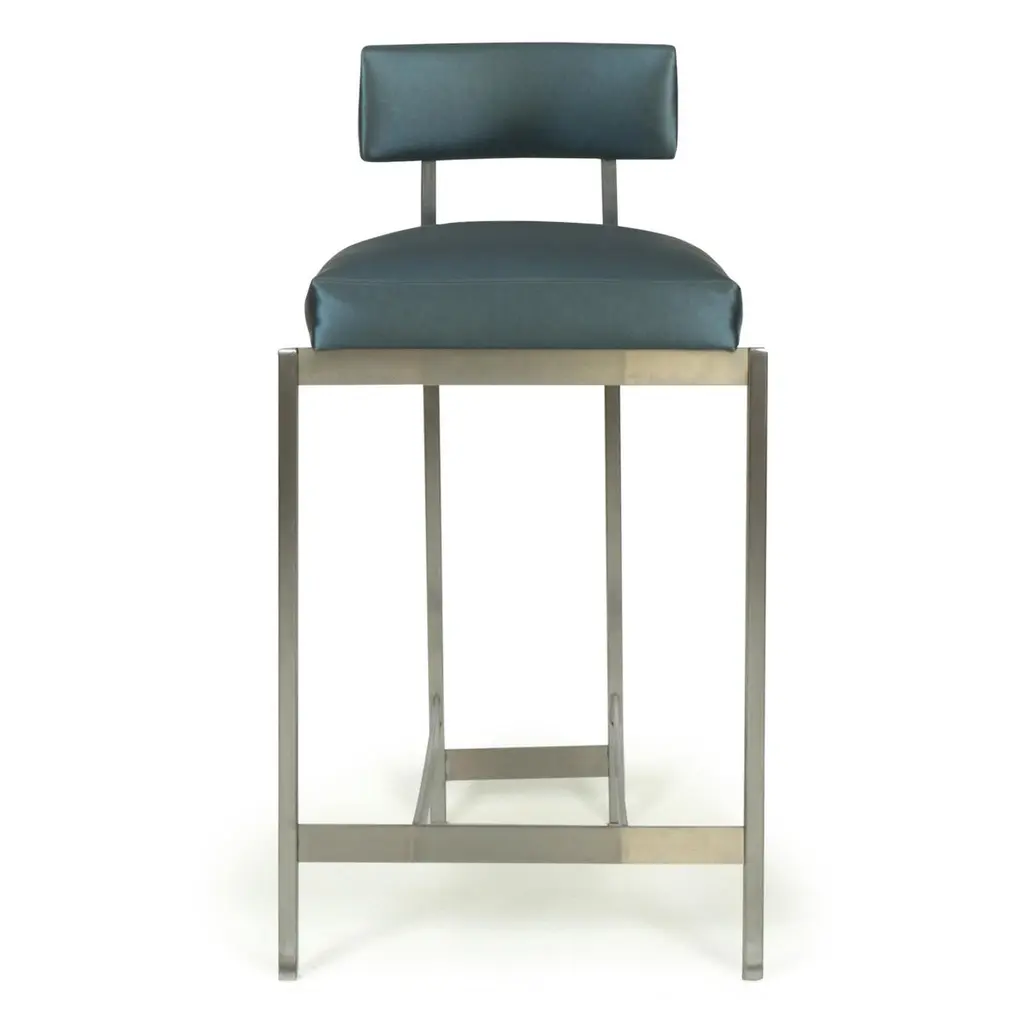 Inspired by Italian design, this stool can be made for bar or counter height. Stretched, elongated lines of the brushed stainless steel base are juxtaposed against a broad, squat seat and back covered in a durable Romo gray metallic vinyl. Seat cushion is a cotton/dacron wrapped 3" thick foam. Back is 1" thick. Fun to look at and a very comfy durable design. Shown in Bar Height. Size and fabric is customizable. Metal can be painted black or finished with a brass coating. Measurements:Outside: 19” W x 20” D x 36” HSeat height: 29" Price as shown: $4,422 eachCOM price: $3,995 eachCustomization may change price.How we work:Made to order by Connecticut-based furniture design and manufacturing company The Tailored Home. Submit your customization desires by 1stdibs messenger for a quote. After orders are placed our workshop manager creates a visual work order for your approval for quality assurance.Customization options:Dimensions can be customized.The fabric shown may come in more colors. We also carry thousands of other materials and can send you samples and fabric pricing upon request. We accept your fabric for a COM fee of 5% of the cost of the piece. Welting, piping, tape or trim can be added. Different species available for pieces with exposed wood and can be painted & lacquered in any Benjamin Moore color (for additional charge) or stained in one of our stain options. Custom color matches cost $75 per sample.We accept inspiration photos of pieces you like.