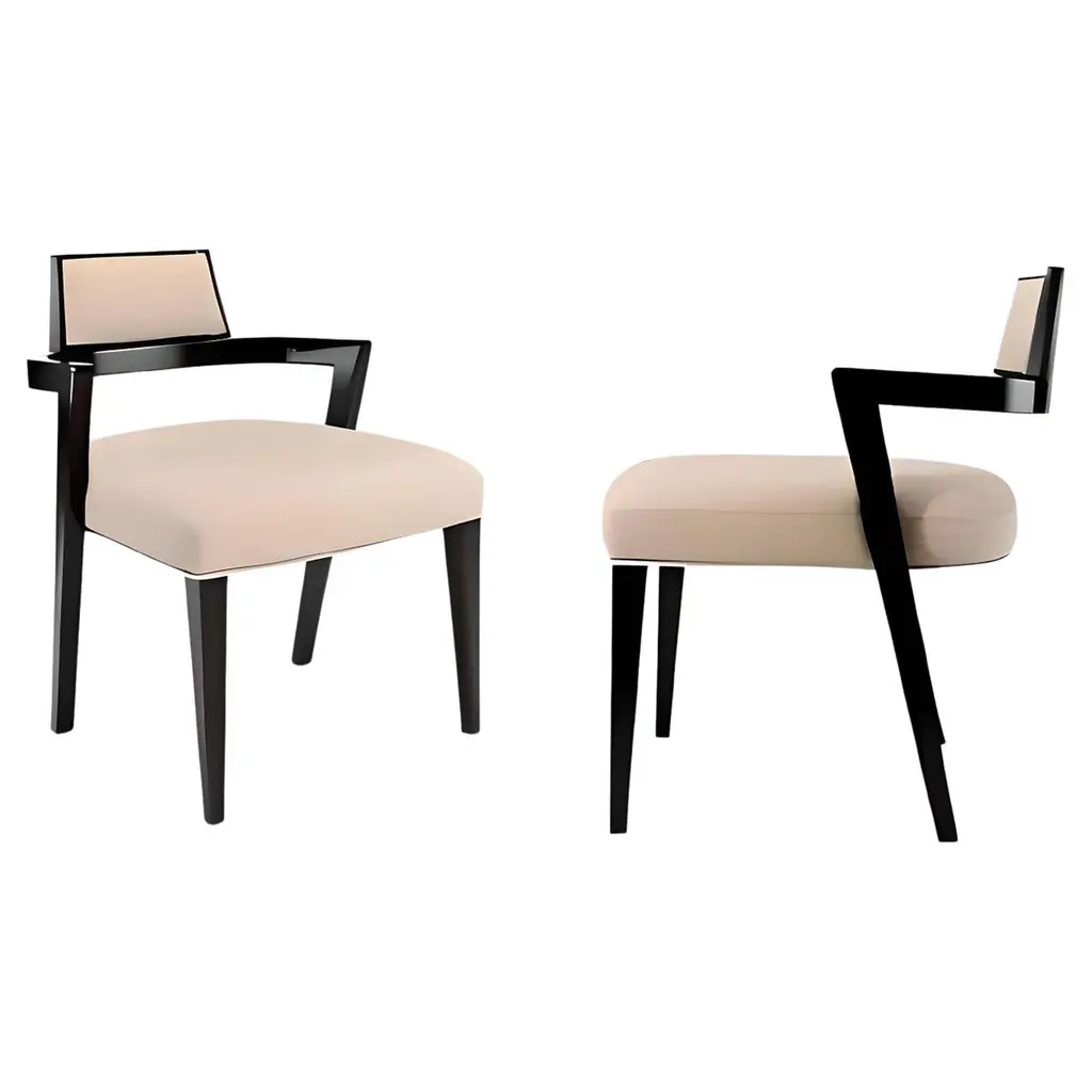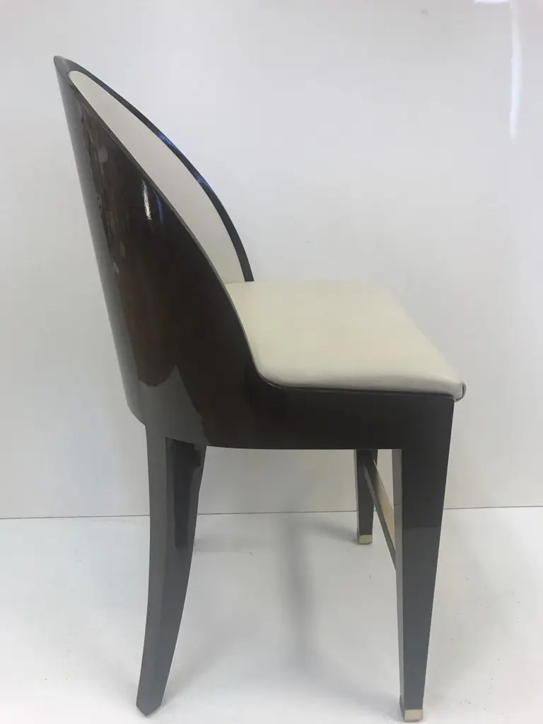 Three mahogany modern bar stools. Frames have a high gloss finish, brass stretcher, brass sabots, and the seats are leatherette. Art Deco style.