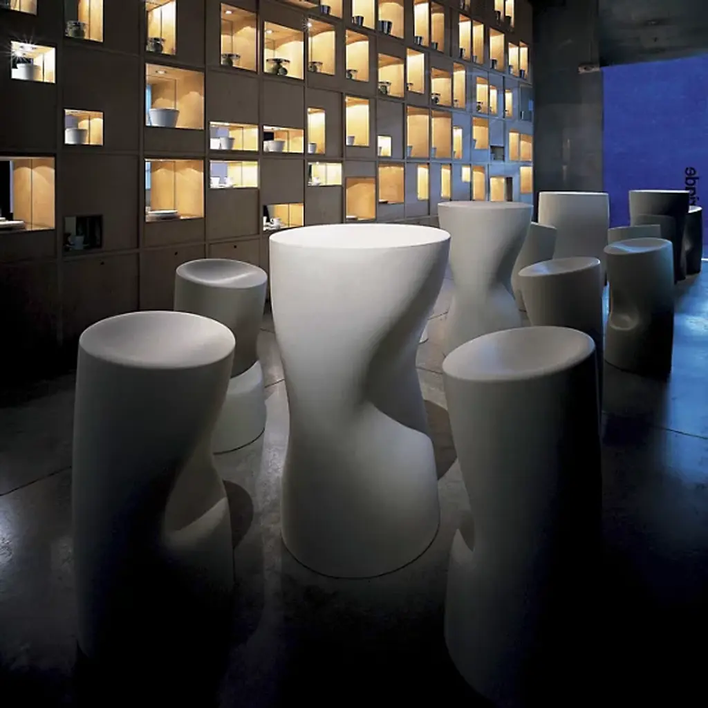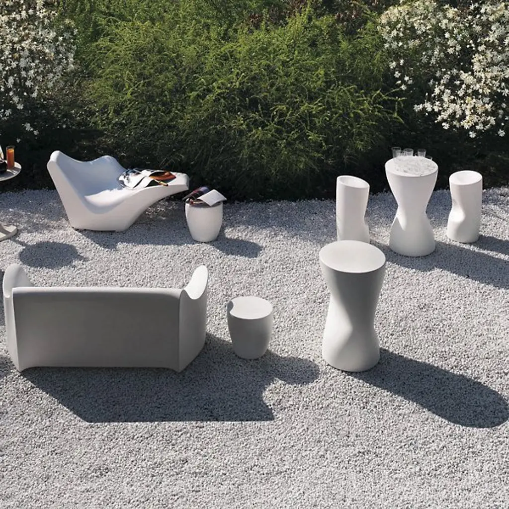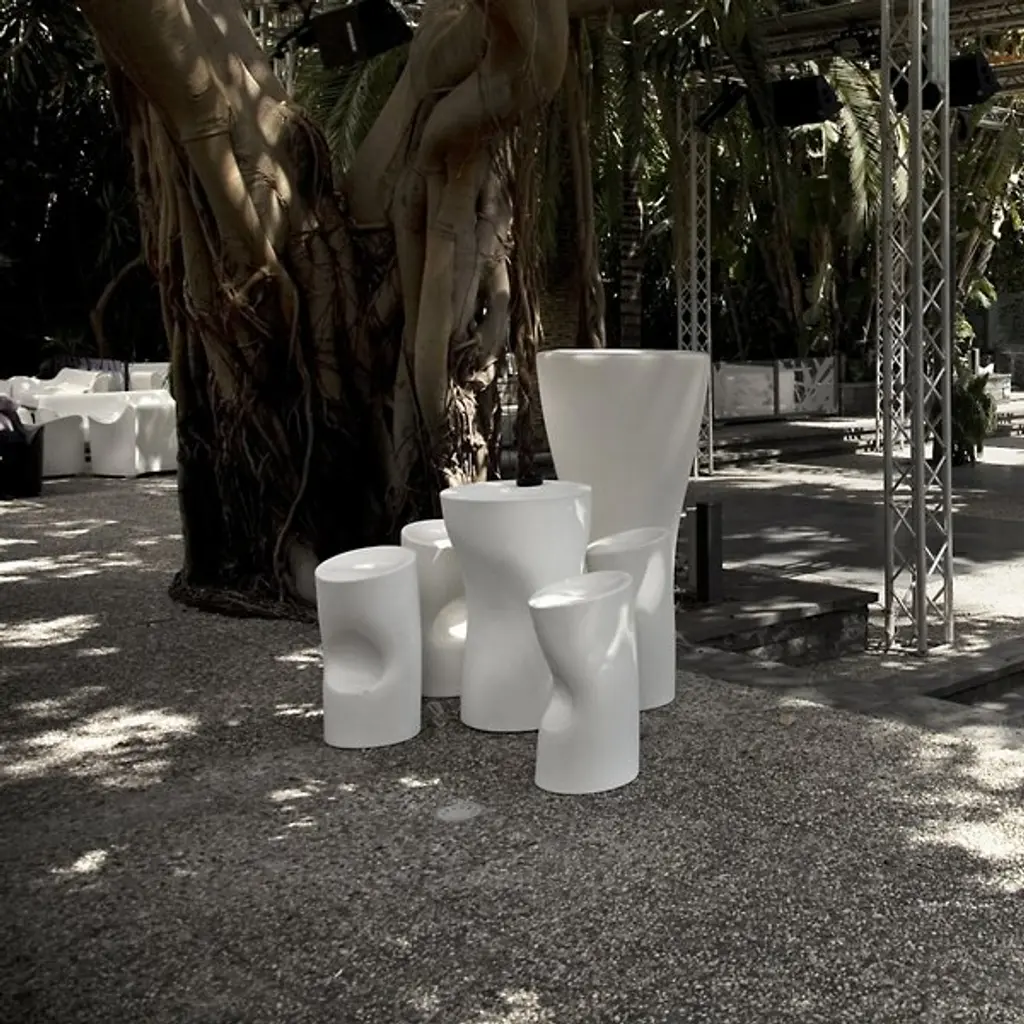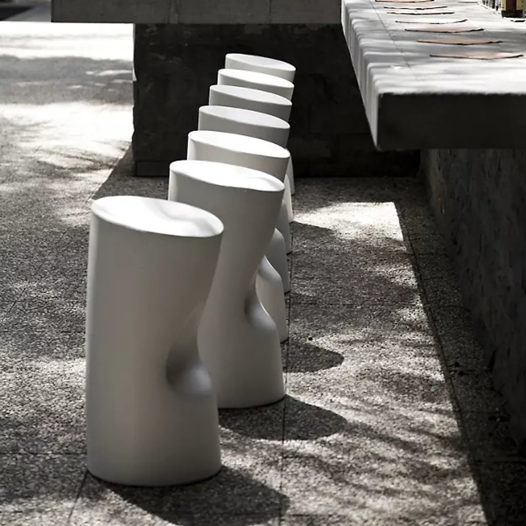The Driade Tokyo Pop Bar Stool is an outdoor stool that looks just a bit intoxicated already. It is molded out of a single piece of polyethylene, with a fun forward-tilted design that actually creates a very stable and comfortable seating surface. It a perfectly playful complement to the Tokyo Pop Bar Table.