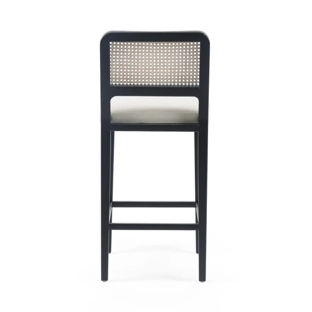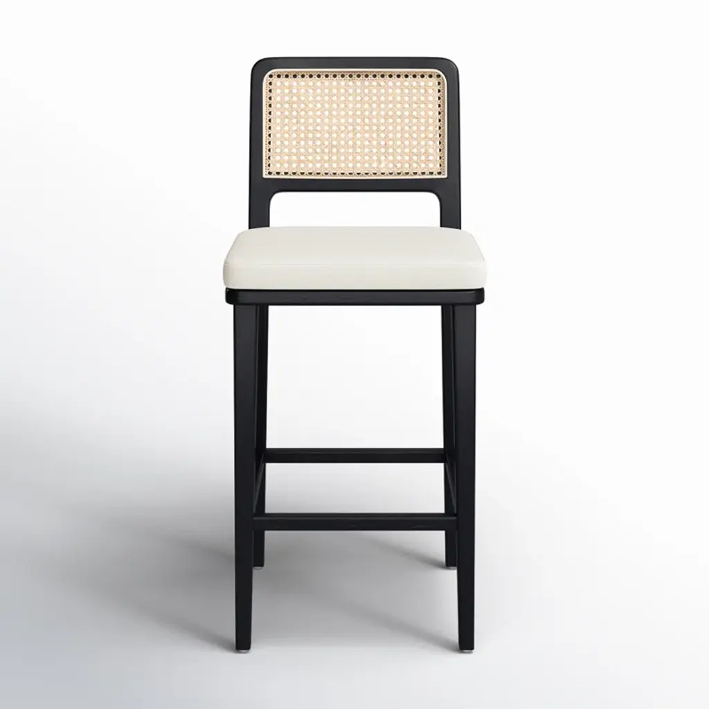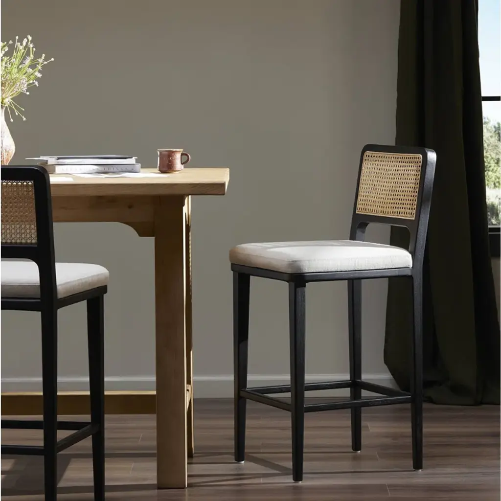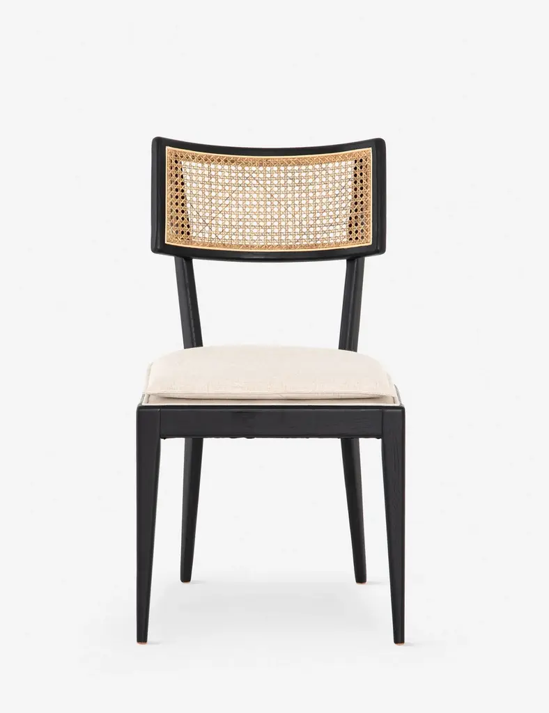 Modern materials refresh a mid-century look with solid ebony-brushed beechwood frames and a textural inlay of natural cane. Linen-like performance seating fabrics are specially created to withstand spills, stains, high traffic, and wear, ensuring long-term comfort and unmatched durability.