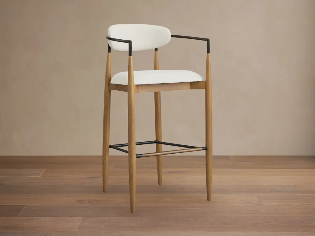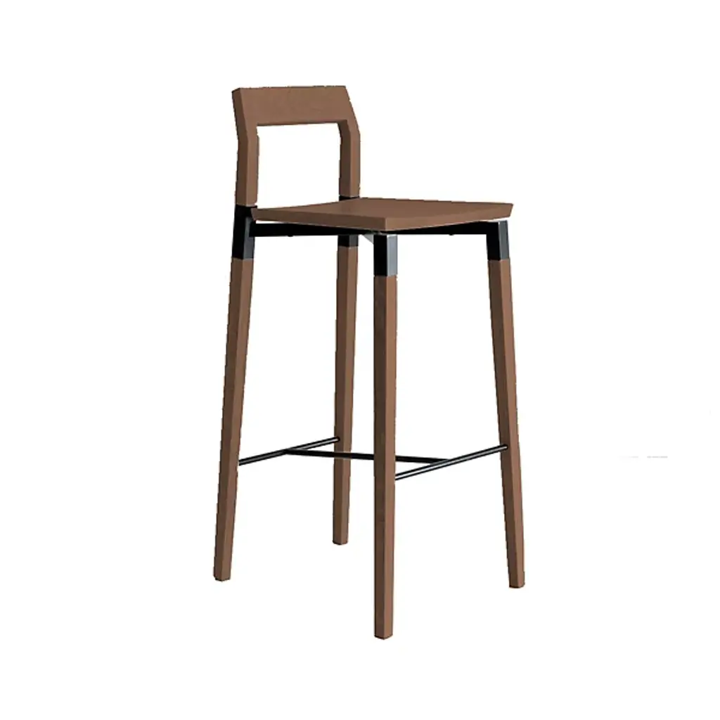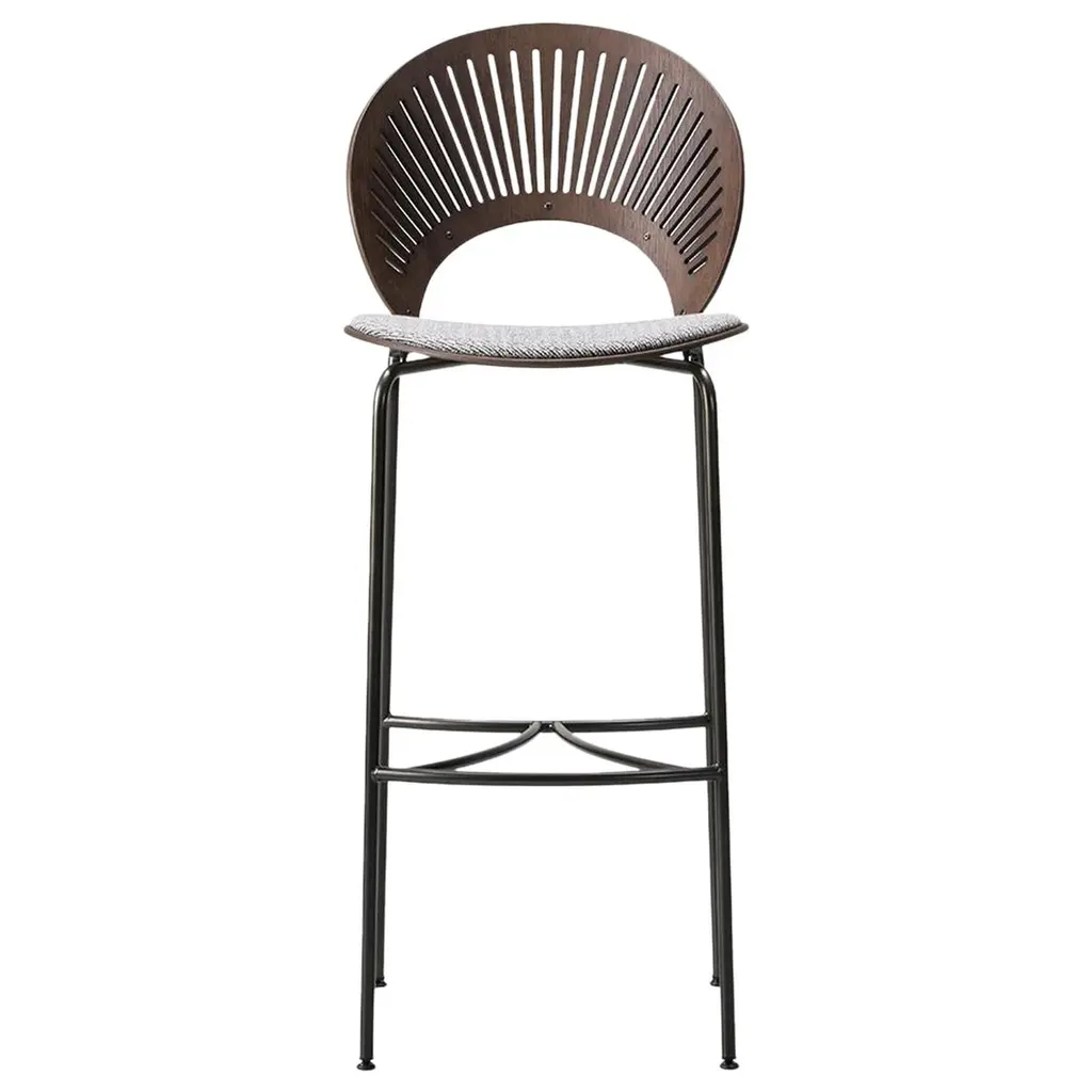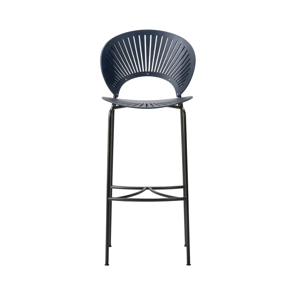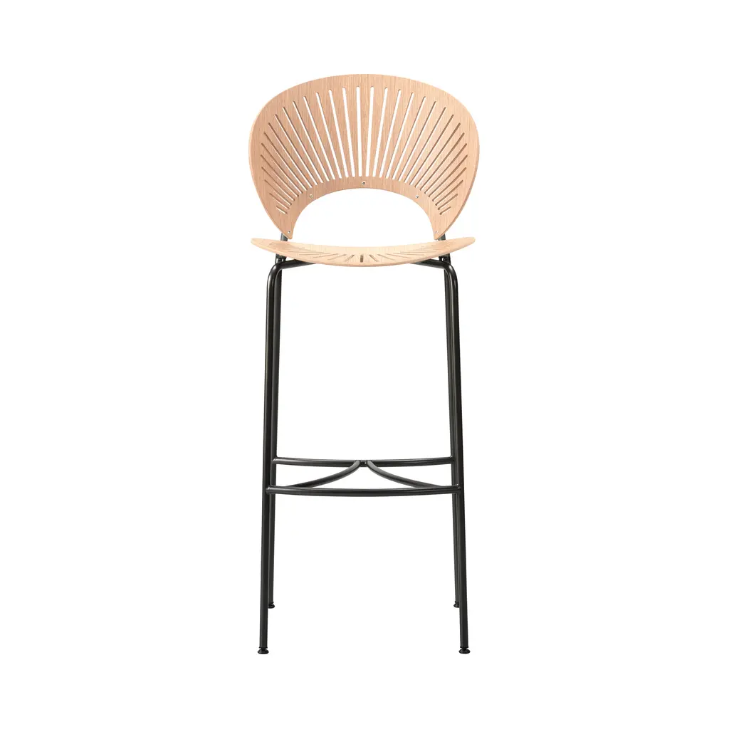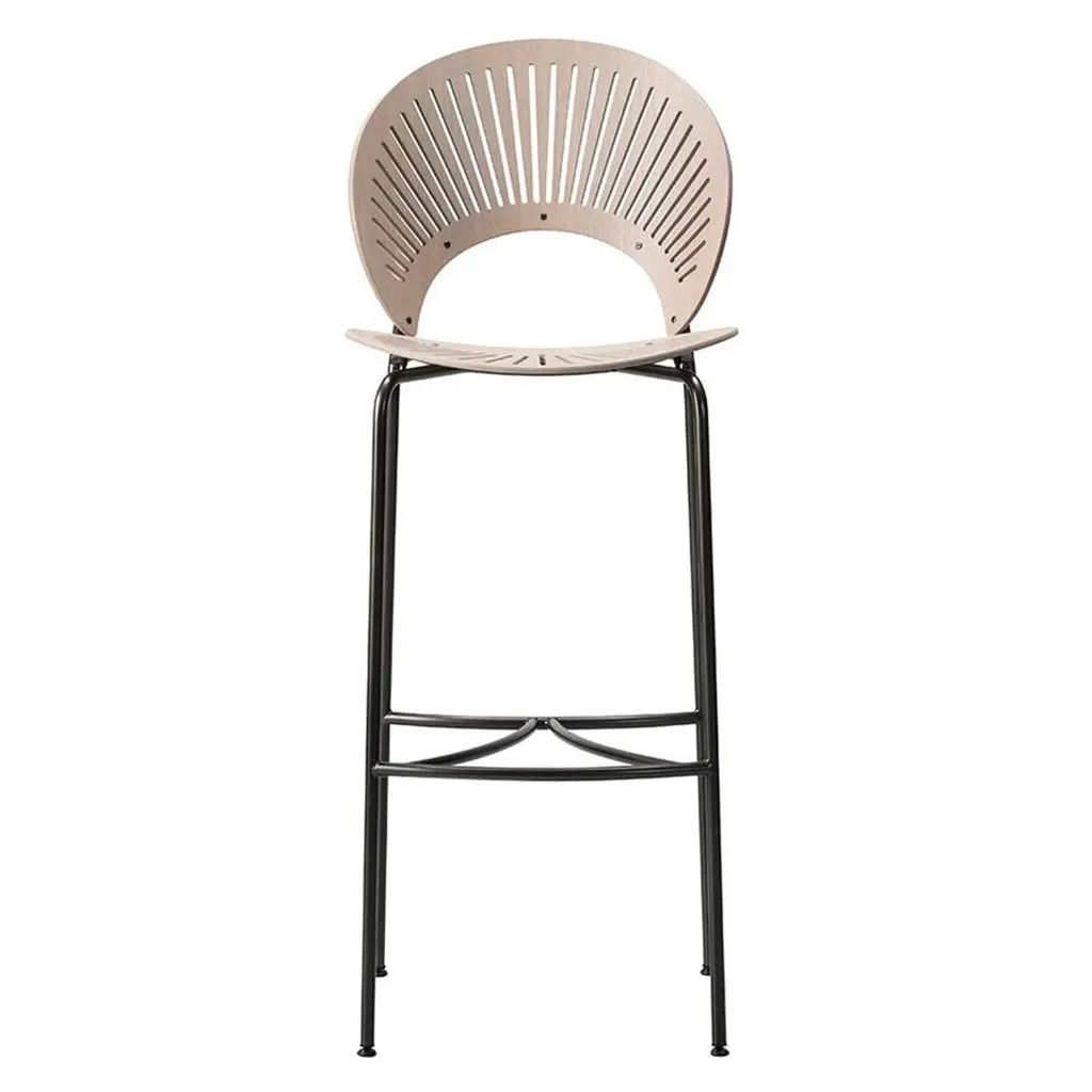 Defined by its fan-shaped backrest with CNC-milled cut-outs, this barstool creates a subtle play of light through its layered silhouette. The back is formed from molded plywood and paired with a tubular steel frame, available in chrome or powder-coated finishes. Engineered for both comfort and structural clarity, the barstool works well at counters and high tables in a range of settings.