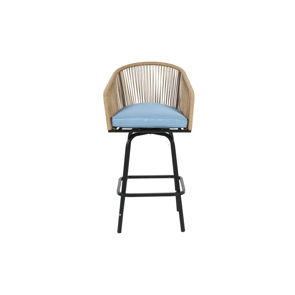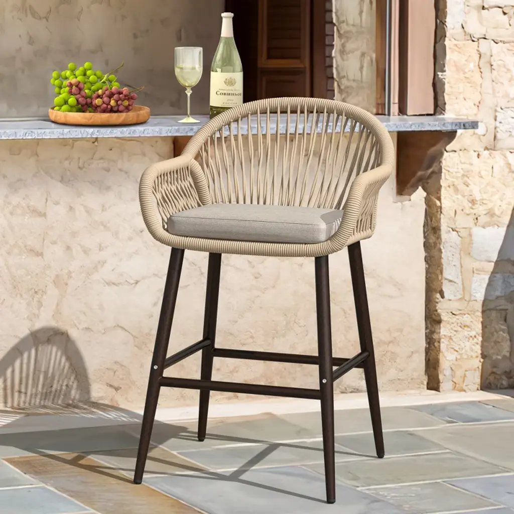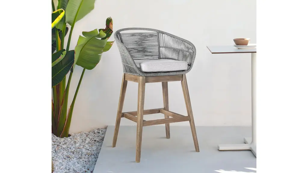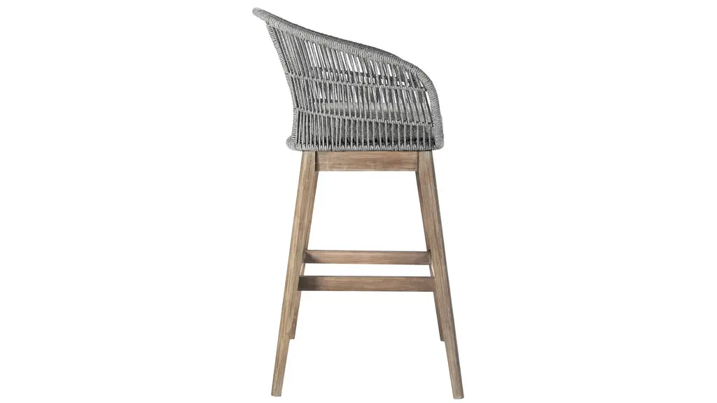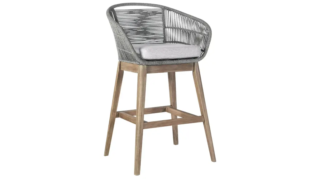 The Tutti Frutti Outdoor Bar Stool from Armen Living is the quintessential choice of an outdoor bar stool that will give your indoor or outdoor living area a whole new aesthetic and presentation for you to enjoy. Featuring a Eucalyptus Wood base, the Tutti Frutti is durable and highly weather-resistant, giving you years of extra enjoyment thanks to the longevity of these chairs. The incredibly comfortable, light gray seat cushion is meant to keep relaxed and alleviate any discomfort. This chair is designed with a unique feature where the frame is wrapped with highly durable and an immensely intricate woven rope - adding a completely new dimension to your outdoor furniture which will last just as long and will be even more eye-catching than conventional outdoor frame material. Pair it with wood surfaces for an eclectic boho feel, or with concrete surfaces for a modern retreat. Its sturdy Eucalyptus base is paired with an intricate marine-grade Regatta cord seat and topped with a soft cushion for a lesson in style and comfort. The rounded back gives ample support for lounging in your backyard, home bar, garden terrace, screened in porch, or poolside! The Tutti Frutti bar or counter height stool is available in shades of gray rope with a light gray cushion in Eucalyptus wood with your choice of a black brushed or light brown finish.