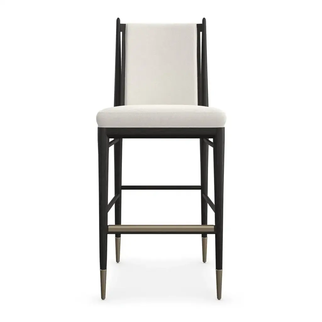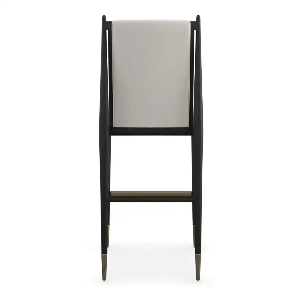 An elegant expression of materiality and form, the Unity dark bar stool is perfectly scaled for entertaining and the everyday. A clean-lined frame crafted in a Cinder-finished, open grain oak sets it apart from its light counterpart. Dressed in an ivory boucle fabric and Lucent Bronze metal ferrules, its dramatic contrast brings a sophisticated modern aesthetic to dining and entertaining spaces. Counter height stool also available.