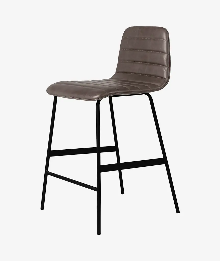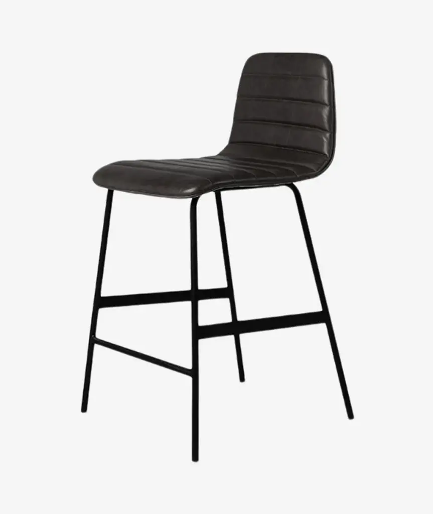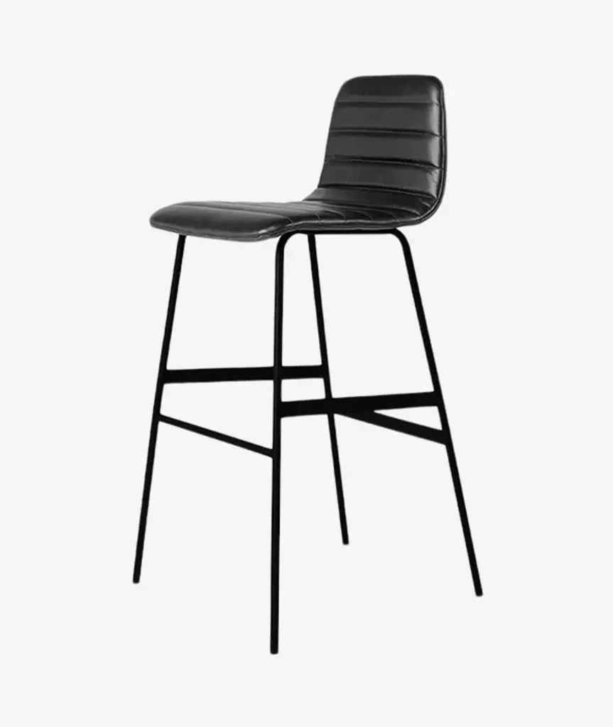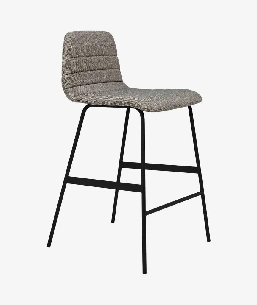 The Lecture Counter and Bar Stools are a modern reinterpretation of a classic elementary school chair design, adapted for bar height use. This version features a one-piece, upholstered seat and back, with unique, channel-stitch detailing. The black, powder-coated steel legs are reinforced with sturdy flat bar stabilizers and a simple ergonomic footrest. Functional, comfortable and stylish, the Lecture Stool works well for any workspace, bar or dining area.