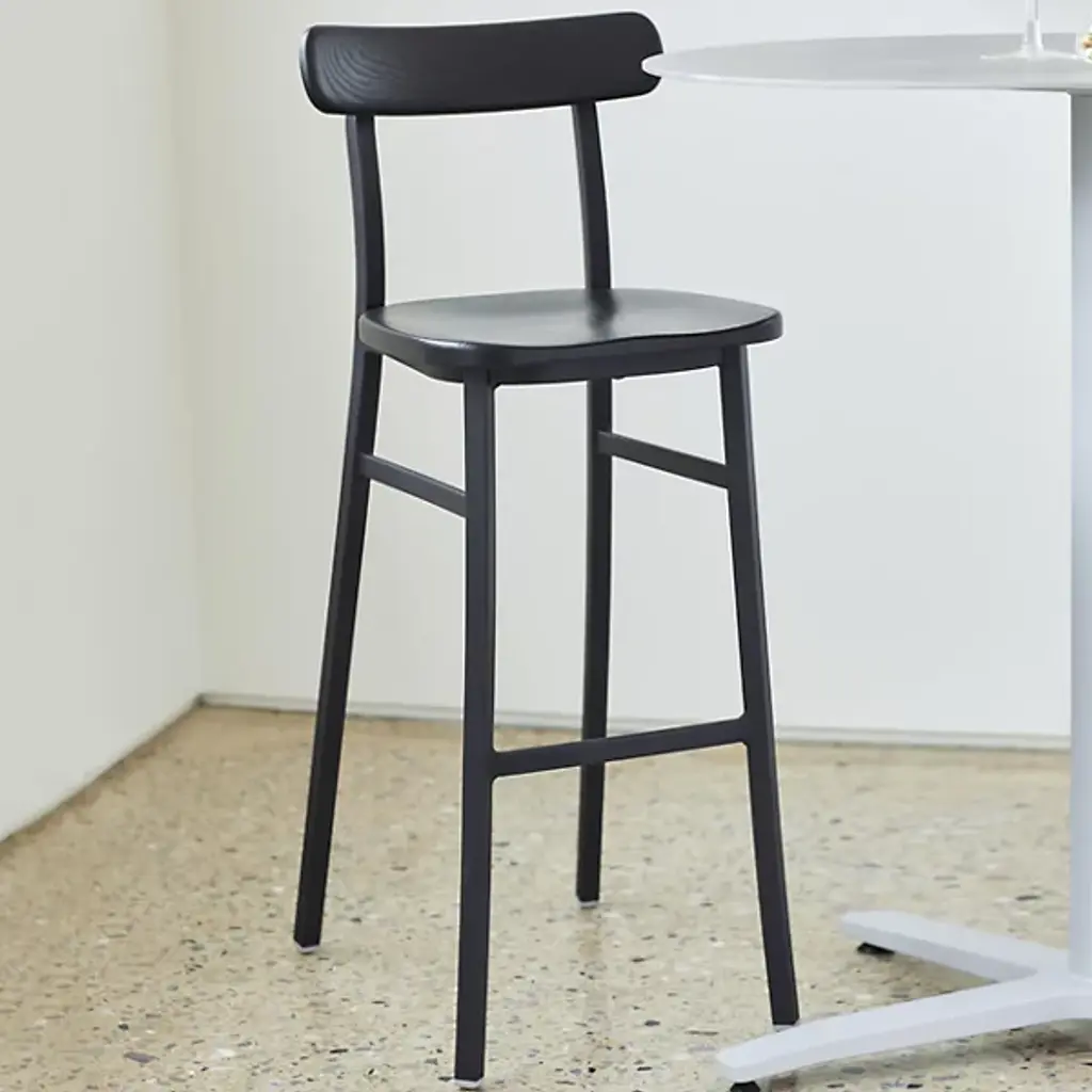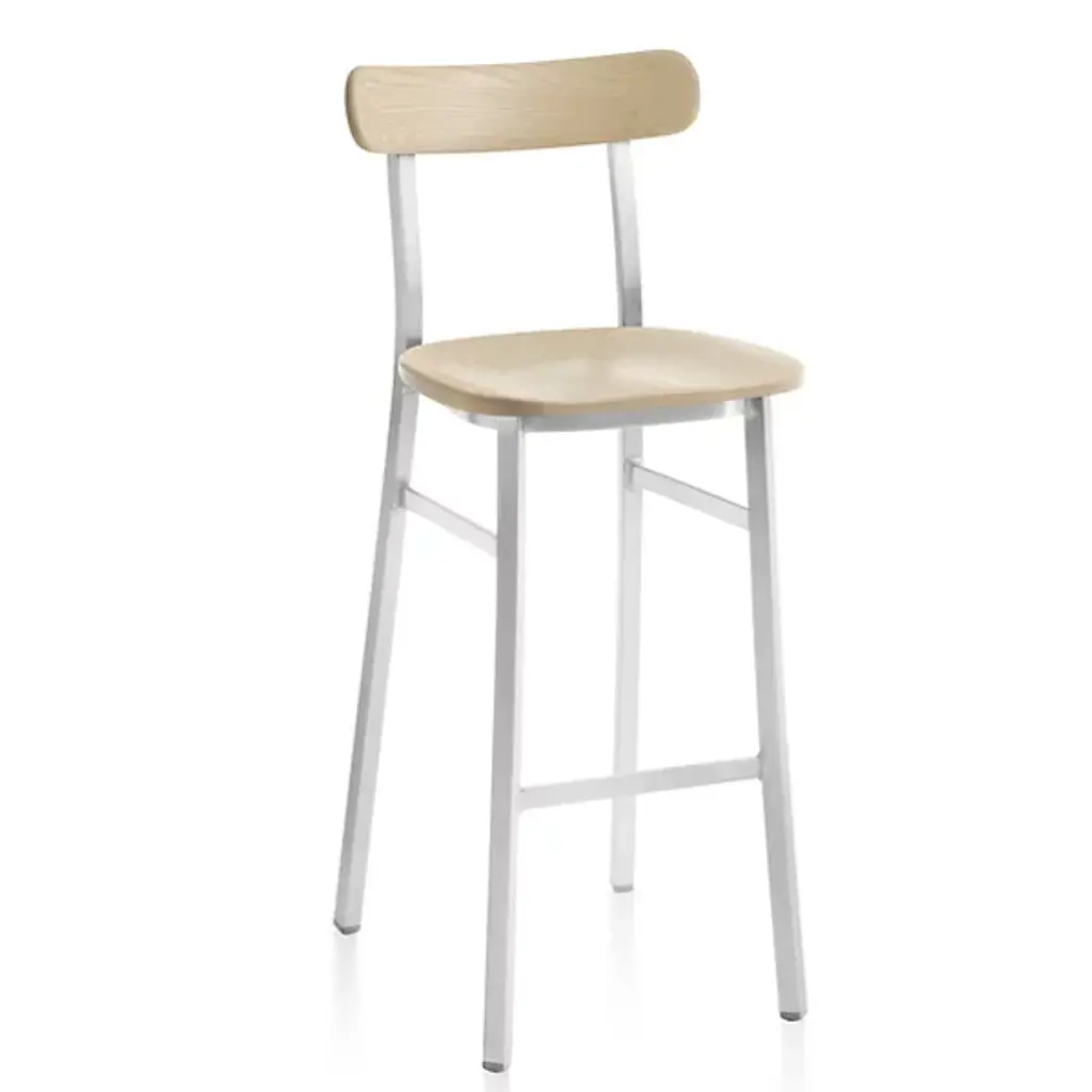 The Utility Bar Stool from Emeco is a reliable piece for elevated seating, putting functionality and comfort above all. Creator Jasper Morrison’s ‘super normal’ design approach explores the interaction of shape and character with tension and expression. This bar stool expresses stability in an aluminum frame fitted with rods for a footrest. The minimal profile of the frame makes it lightweight enough to rearrange easily. Hand-shaped wood resting portions add to the easy-going nature with a familiar organic texture. These wood segments sport curves that promote long, comfortable seating sessions.
