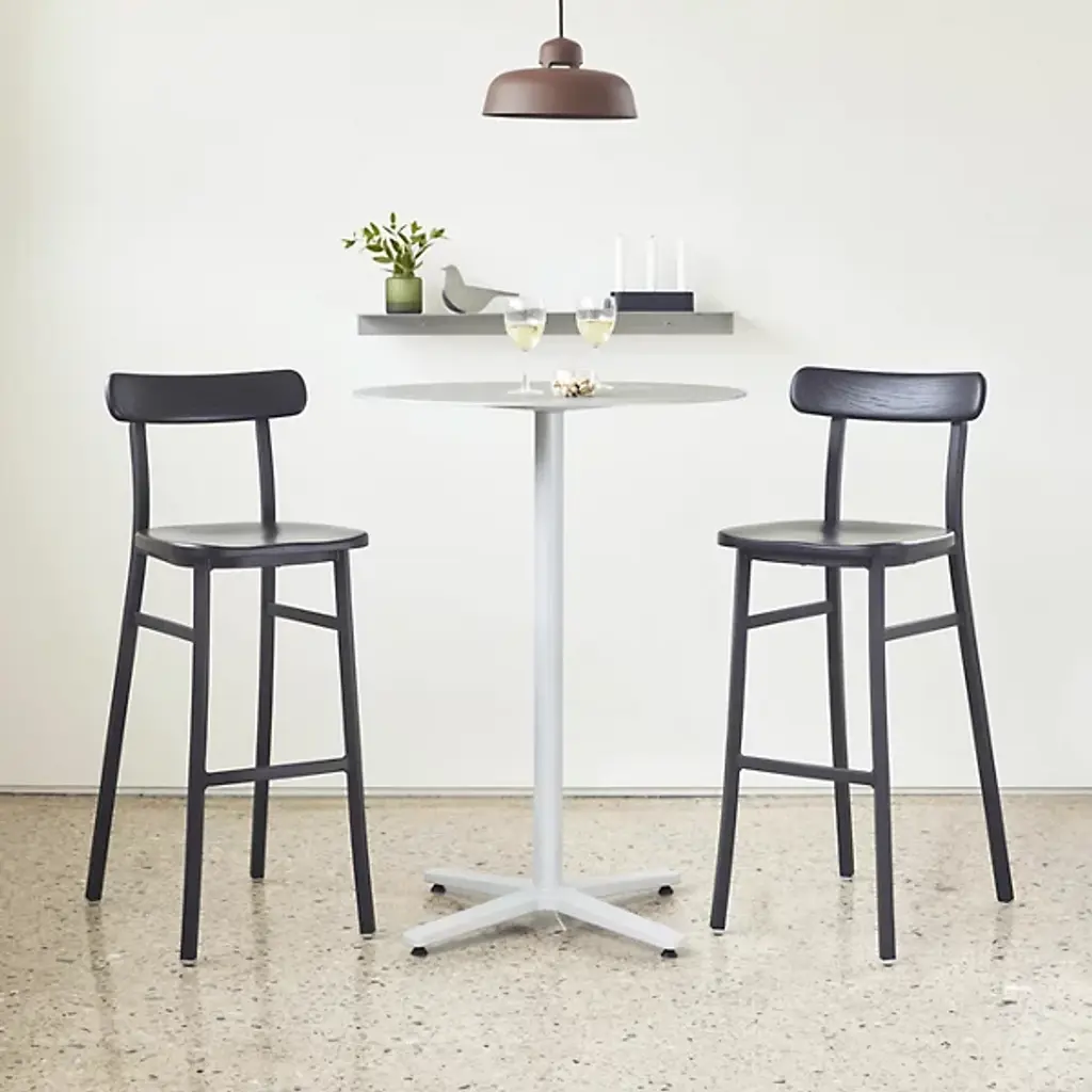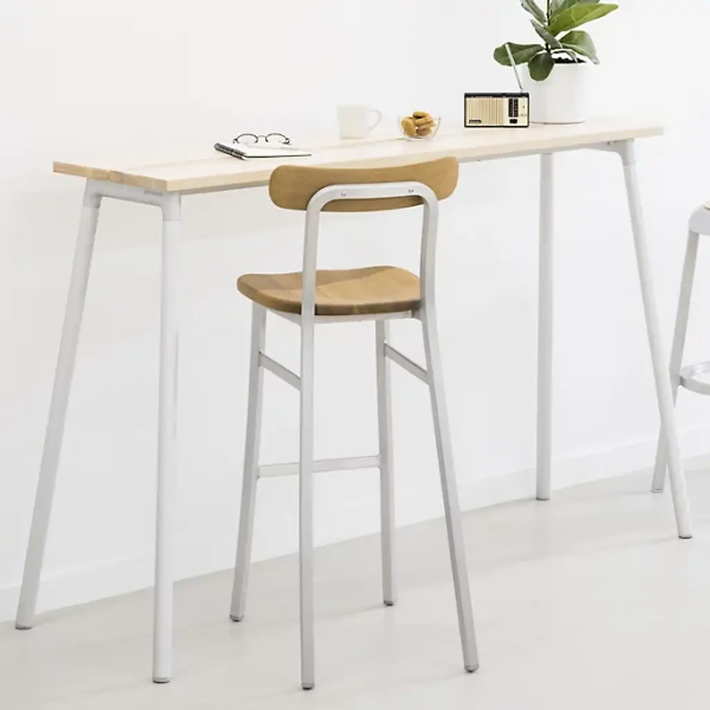 The Utility Bar Stool from Emeco is a reliable piece for elevated seating, putting functionality and comfort above all. Creator Jasper Morrison’s ‘super normal’ design approach explores the interaction of shape and character with tension and expression. This bar stool expresses stability in an aluminum frame fitted with rods for a footrest. The minimal profile of the frame makes it lightweight enough to rearrange easily. Hand-shaped wood resting portions add to the easy-going nature with a familiar organic texture. These wood segments sport curves that promote long, comfortable seating sessions.