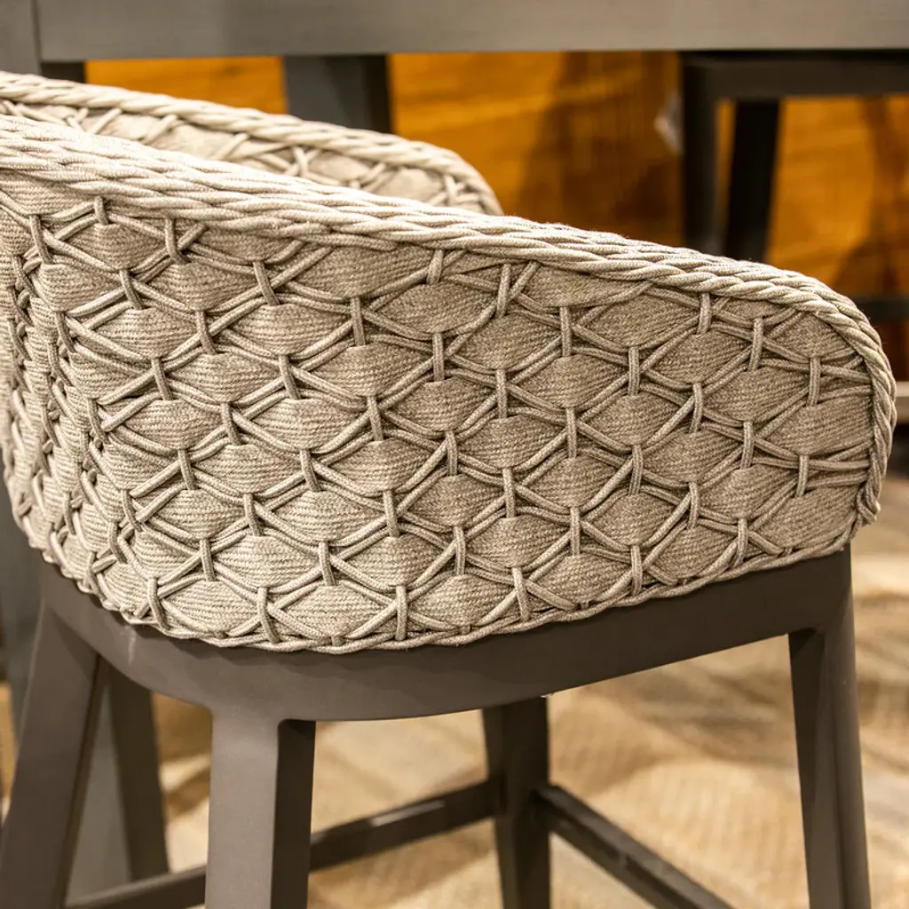 Inspired by the desire to explore pattern and new weaving techniques, the Vevina reimagines form and material to create an incredibly unique statement. The Vevina Barstool features a complex handwoven rope design with a curved back and sloping arms, and tapered legs in powder-coated aluminum. It boasts a fully welded powder-coated aluminum frame and is wrapped in weather-resistant, colorfast rope. The barstool includes weather-resistant, high-resiliency foam cushions and non-marking plastic glides. With commercial quality construction,