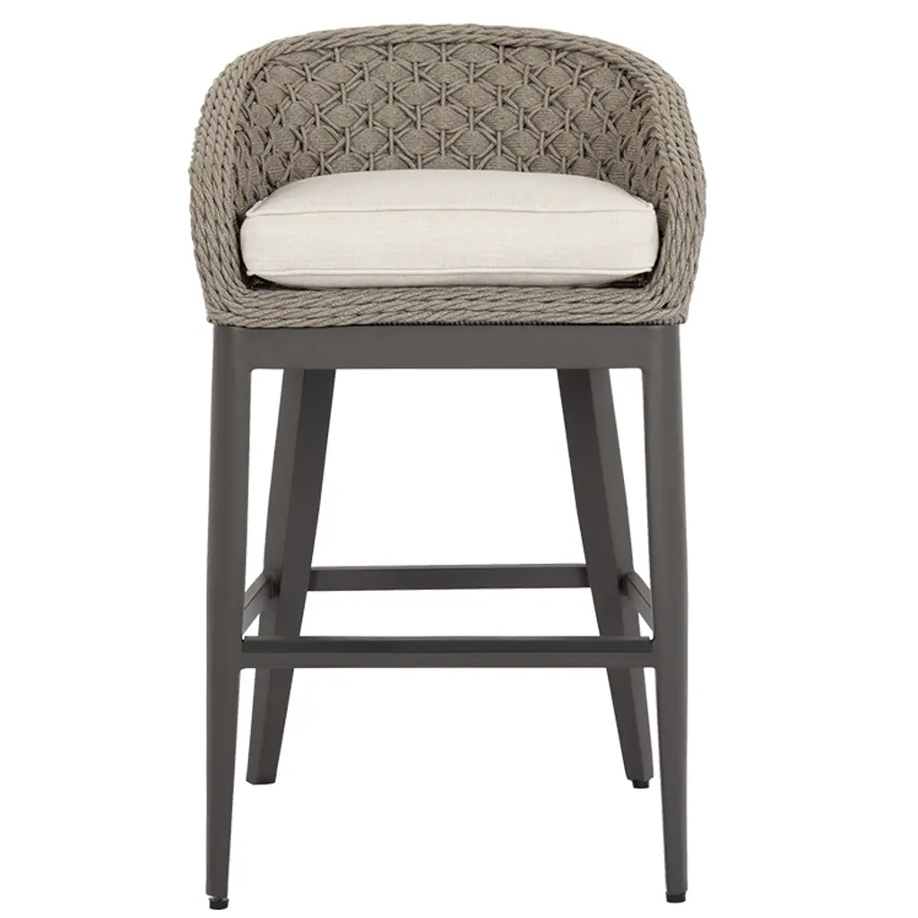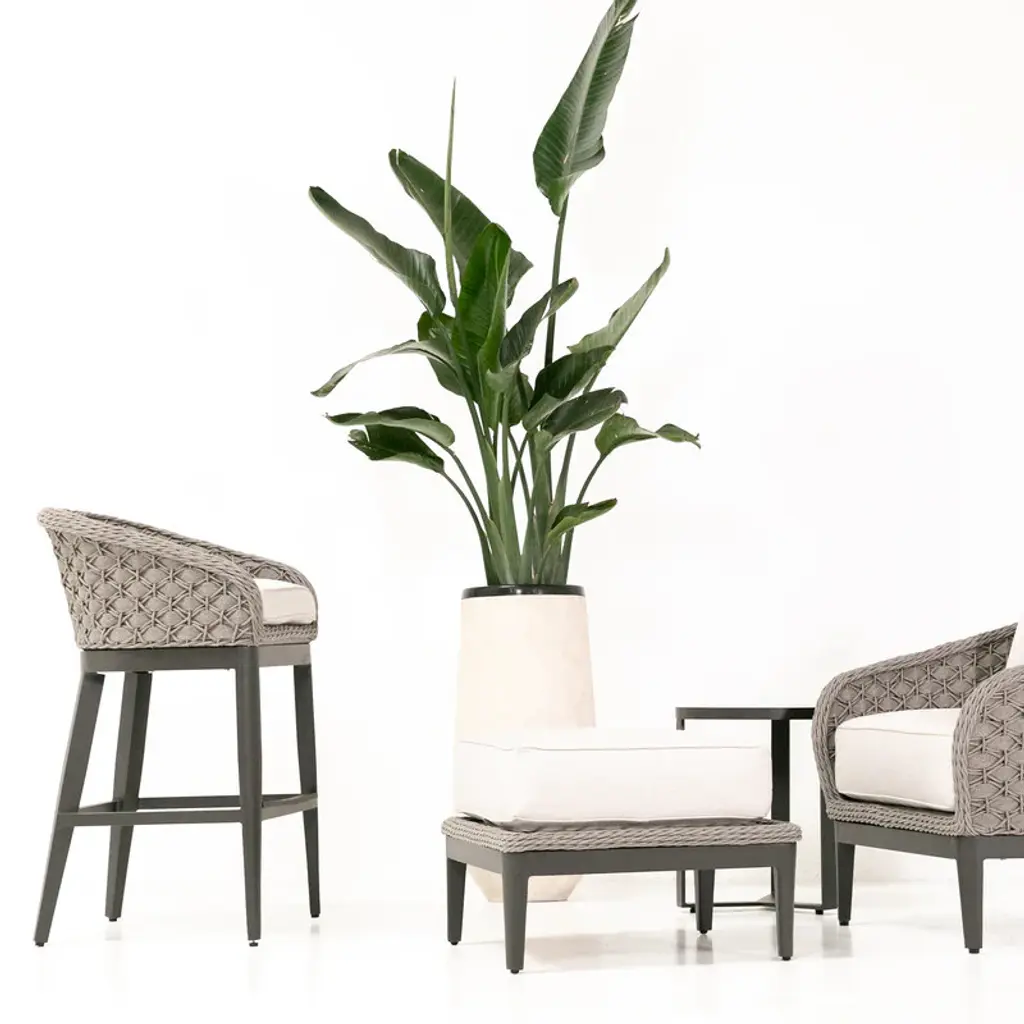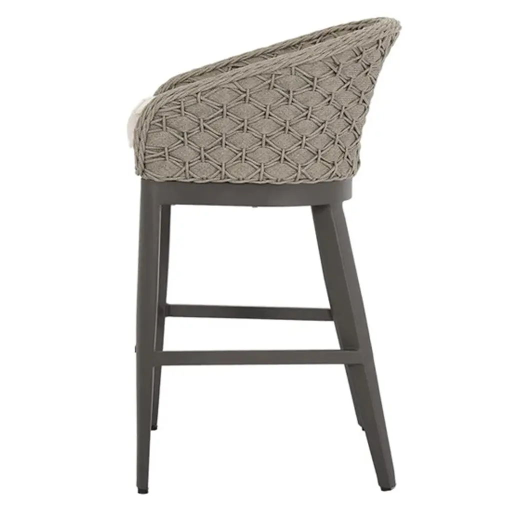 Inspired by the desire to explore pattern and new weaving techniques, the Vevina reimagines form and material to create an incredibly unique statement. The Vevina Barstool features a complex handwoven rope design with a curved back and sloping arms, and tapered legs in powder-coated aluminum. It boasts a fully welded powder-coated aluminum frame and is wrapped in weather-resistant, colorfast rope. The barstool includes weather-resistant, high-resiliency foam cushions and non-marking plastic glides. With commercial quality construction,