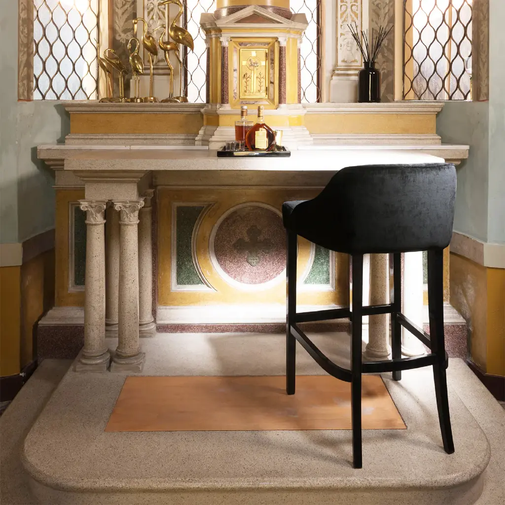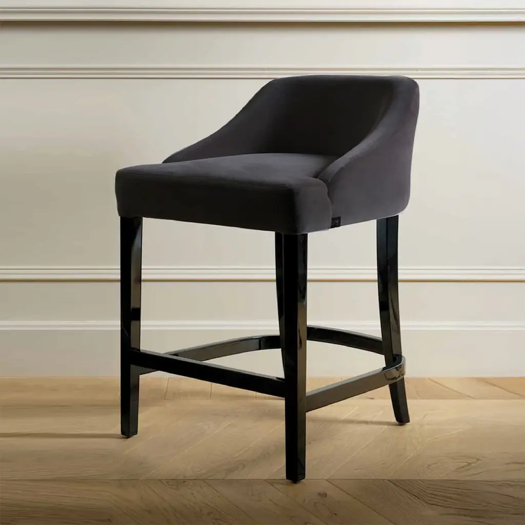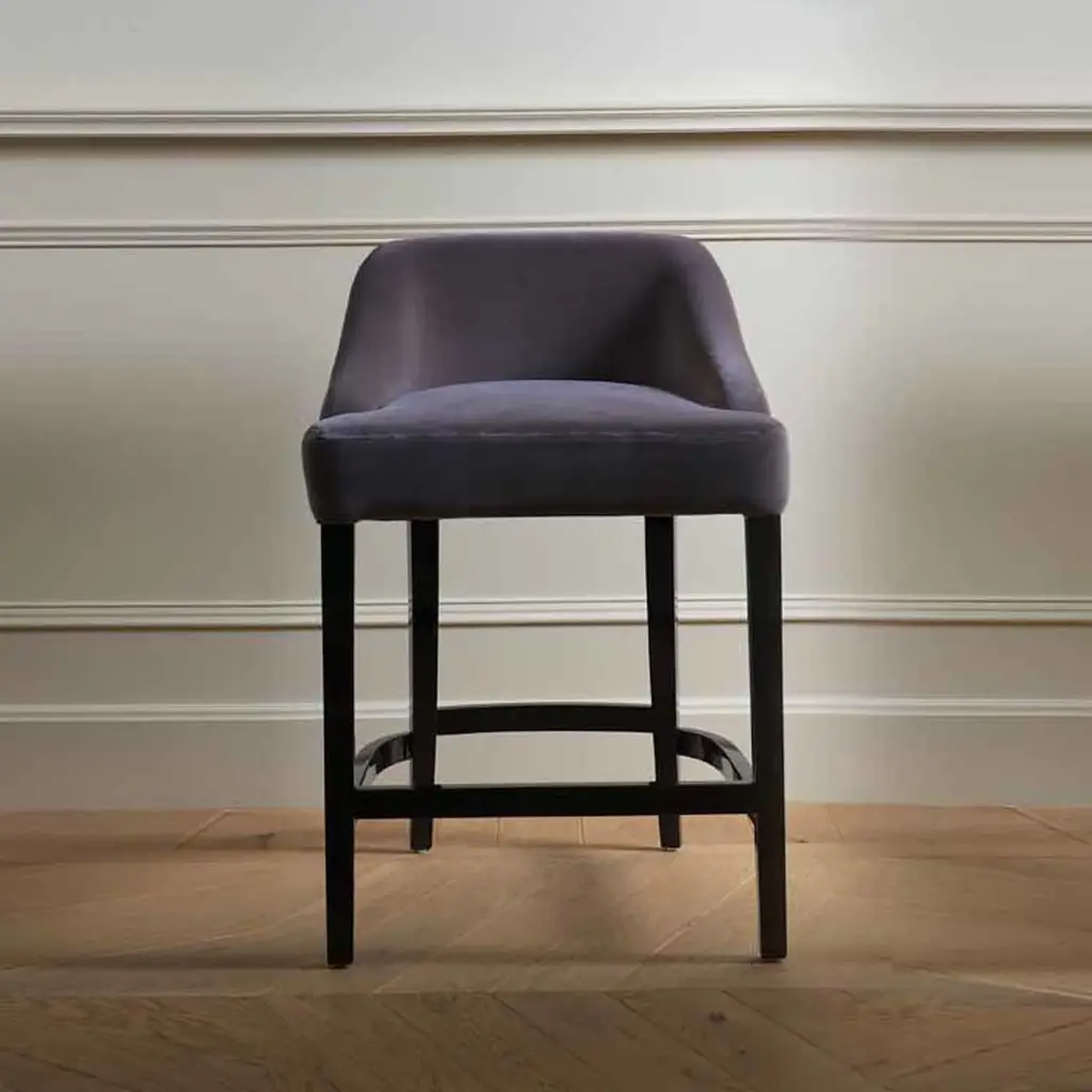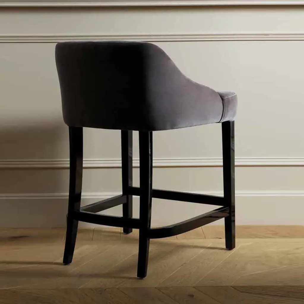 Part of the Vicky Collection, one of the first lines designed by Domenico Mula for DOM Edizioni, this bar stool is both comfortable and stylish. Its tall base comprises four legs connected by horizontal elements functioning as footrests, all finished in black glossy lacquer, with the back legs curved in a delicate saber silhouette. The top is distinctive for its wide seat and short backrest with a gray upholstery in fabric (Cat. 3).