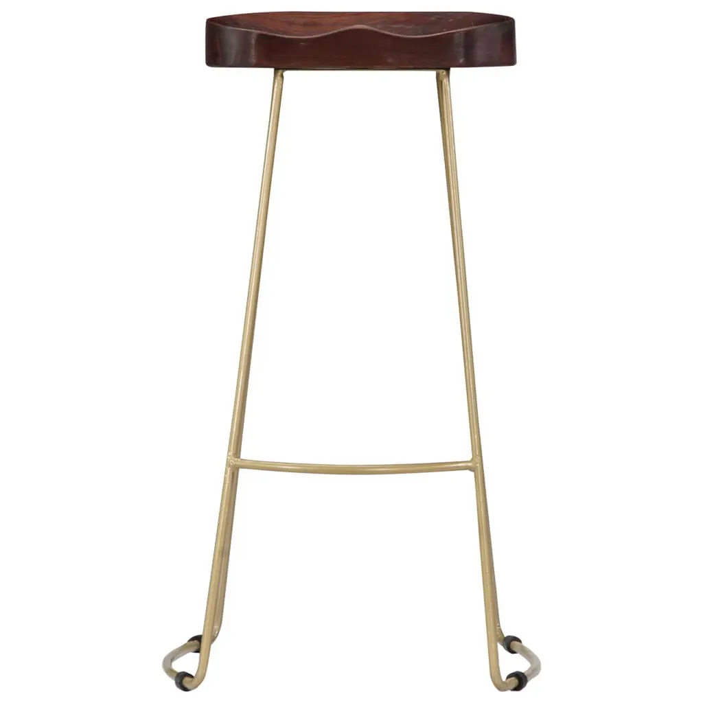 This Gavin Bar Stool makes a stylish addition to your dining area or home bar. It's carefully crafted from solid mango wood. Its vintage design, combined with a rich walnut brown finish and sleek brass detailing, creates a striking visual impact that fits in with various decor styles. Handmade Unique Features: Each Gavin Bar Stool is crafted by skilled artisans using solid mango wood, with distinct wood grains that make each piece unique, adding character and charm to your space.Robust Frame Design: The sturdy iron legs with brass powder coating give it an industrial look that's both stylish and practical, ensuring stability and longevity for everyday use.Vintage Aesthetic: Capture retro vibes with this beautifully designed stool that fits nicely into modern settings. Its vintage flair enhances dining experiences, making every meal a bit more special.Versatile Configurations: Perfect for home bars, dining rooms, or kitchen counters, these stools are adaptable and stylish. They can be used in homes or trendy cafes, striking a balance between comfort and elegance.Compact Footprint: With dimensions of 17.7 in width, 15.7 in depth, and 30.7 in height, these stools are space-efficient yet comfy, easily fitting beneath counters or tables without compromising on style.