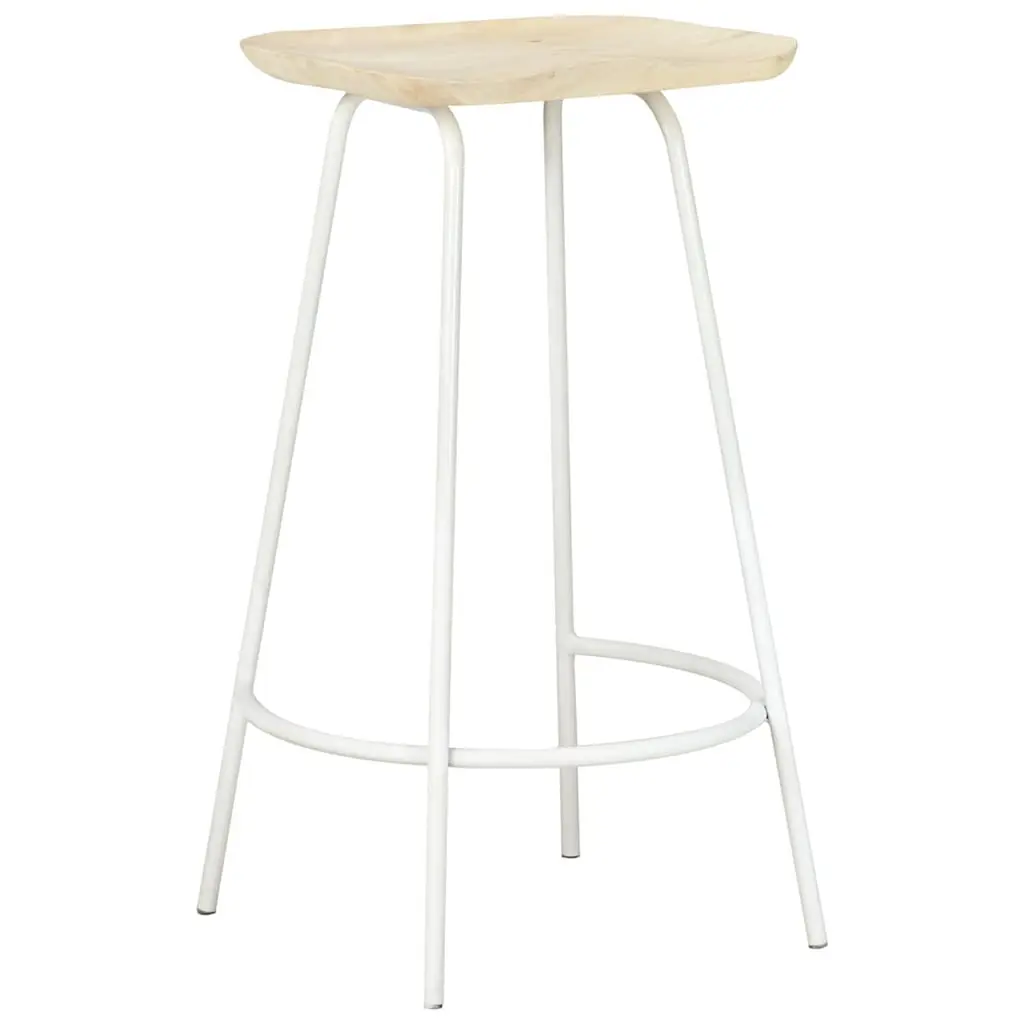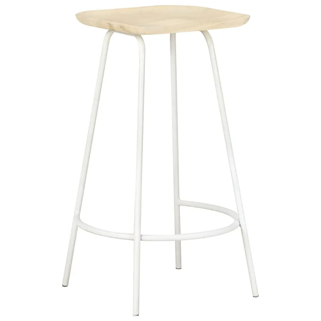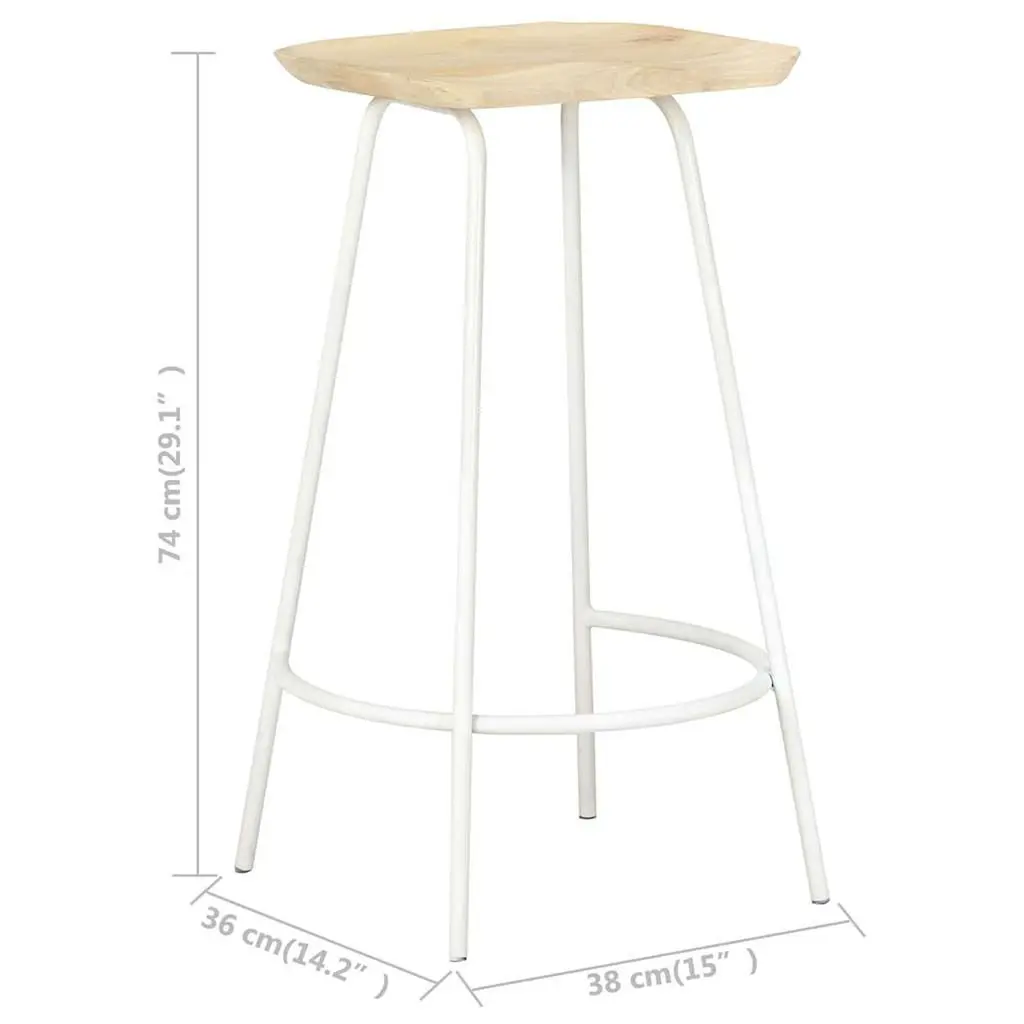 This set of two bar stools boasts a stylish industrial design that fits right into many interiors, whether it's for a cozy home bar or a sleek kitchen. Made from solid mango wood and a sturdy powder-coated iron frame, these stools look great and are built to last, making them a fantastic addition to your dining experience. Stylish and Modern Aesthetic: The bleached wood finish paired with the sleek white iron legs creates a standout look that jazzes up any bar or counter setup.Robust Material Composition: Each stool is made from sturdy solid mango wood, with the powder-coated iron frame being tough against everyday wear.Comfortable Footrest: Designed with built-in footrests, these stools keep you comfy for longer sitting sessions, perfect for parties.Compact and Versatile: At 14.2 in. deep and 15.0 in. wide, these stools fit nicely in tighter spaces without being a nuisance.Easy Maintenance: Their smooth surface means cleaning is a breeze, keeping them looking fresh with minimal fuss.