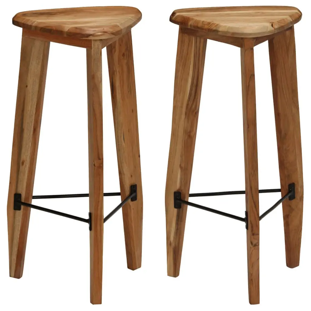 This bar stool set, which comes with two stylish pieces, perfectly mixes function with flair—ideal for dining rooms or kitchen islands. Made from solid acacia wood and supported by sturdy metal legs, these stools deliver rustic charm and lasting comfort. Long-lasting: Made from solid acacia wood, built to handle regular use while looking great.Rustic Vibes: Natural wood finish and tapered black metal legs add a warm, vintage touch to any space.Multi-Use: Great for home bars, dining areas, or casual kitchens—they cater to different styles and occasions.Comfort First: Triangular seats provide comfy support your back will love, ideal for meals or socializing.Easy to Clean: Thanks to the lacquered finish, a quick wipe-down with a damp cloth keeps them looking fabulous.