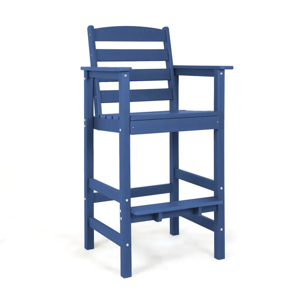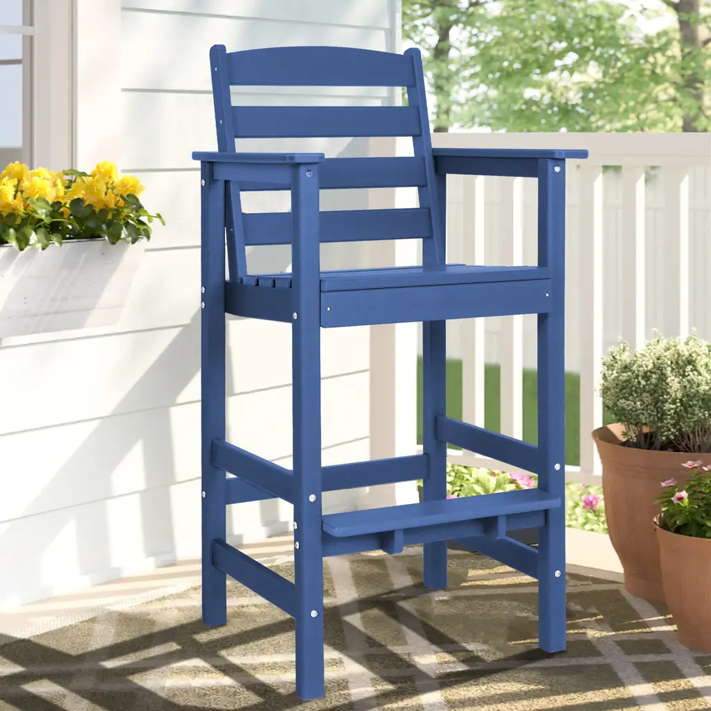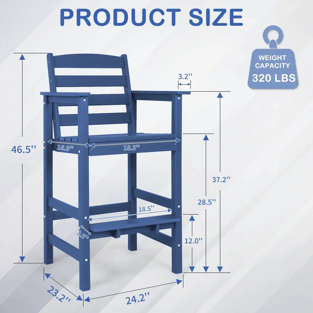 Crafted from weather-resistant HDPE, this adirondack bar chair is built to last, resisting fading, cracking, and peeling for year-round use. The sleek design complements any patio, deck, or poolside area. This bar chair is perfect for entertaining or relaxing. Low-maintenance and easy to clean, just wipe with a damp cloth. Ideal for BBQs, outdoor dining, or casual gatherings, this bar chair combines durability, style, and functionality to elevate your outdoor experience. Create your perfect outdoor oasis with this versatile and sturdy bar chair! Features: Crafted from high-density polyethylene (HDPE) This outdoor adirondack bar arm chair is built to withstand the elements The sleek design complements any patio, deck, or poolside area Resistant to fading, cracking, and peeling, it ensures long-lasting beauty and functionality, making it perfect for year-round outdoor use Designed for durability, the bar chair support up to 320 lbs This robust construction ensures stability and safety, making it ideal for gatherings and everyday use The bar arm chair feature 3.2-inch wide armrests and 3.5-inch wide footrests, providing added support and comfort for extended sitting Simply wipe down with a damp cloth to keep your bar set looking fresh and new, saving you time and effort in upkeep Specification: Colors: Navy Blue; Black; Gray Material: High-density polyethylene (HDPE) Weight Capacity of Bar Chair: 320 lbs Dimension of Bar Chair: 24.2" x 23.2 "x 46.5" (L x W x H) Package Include: 1 x Bar Chair