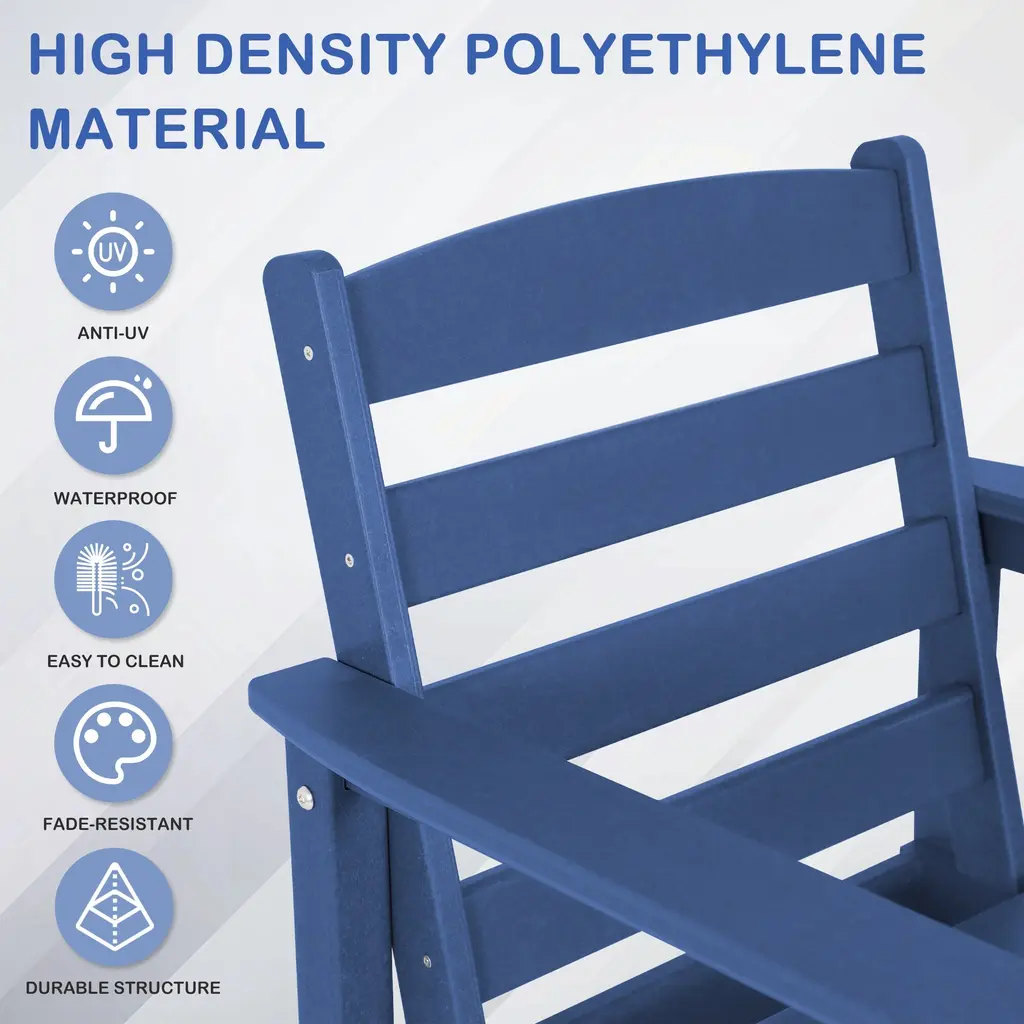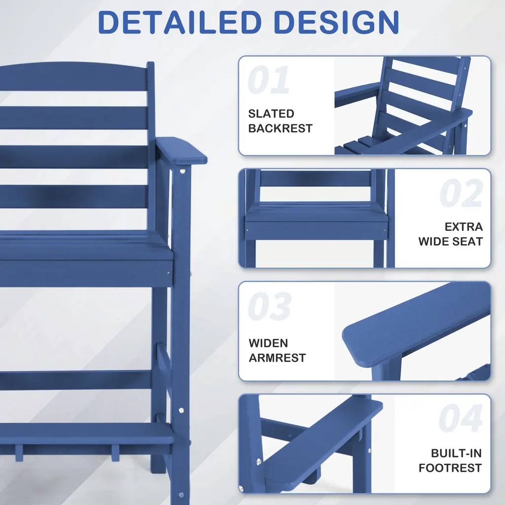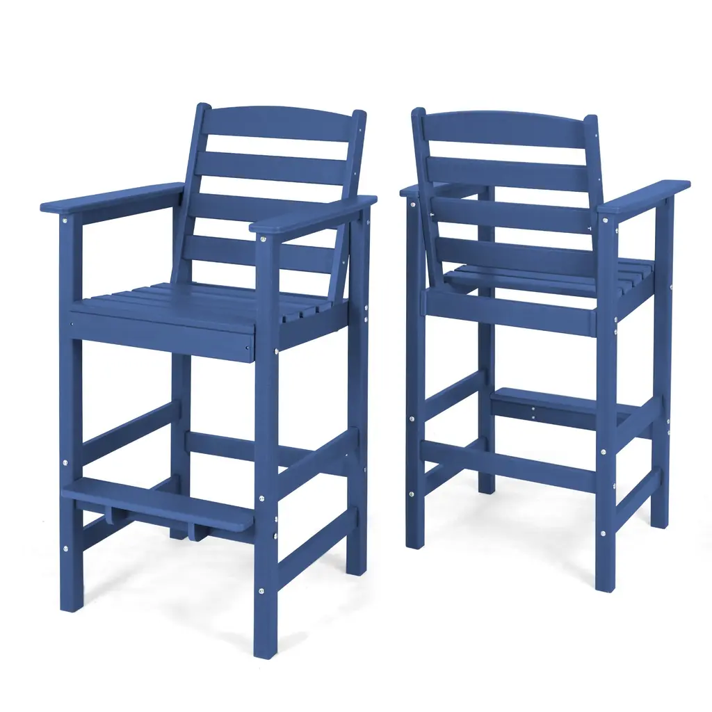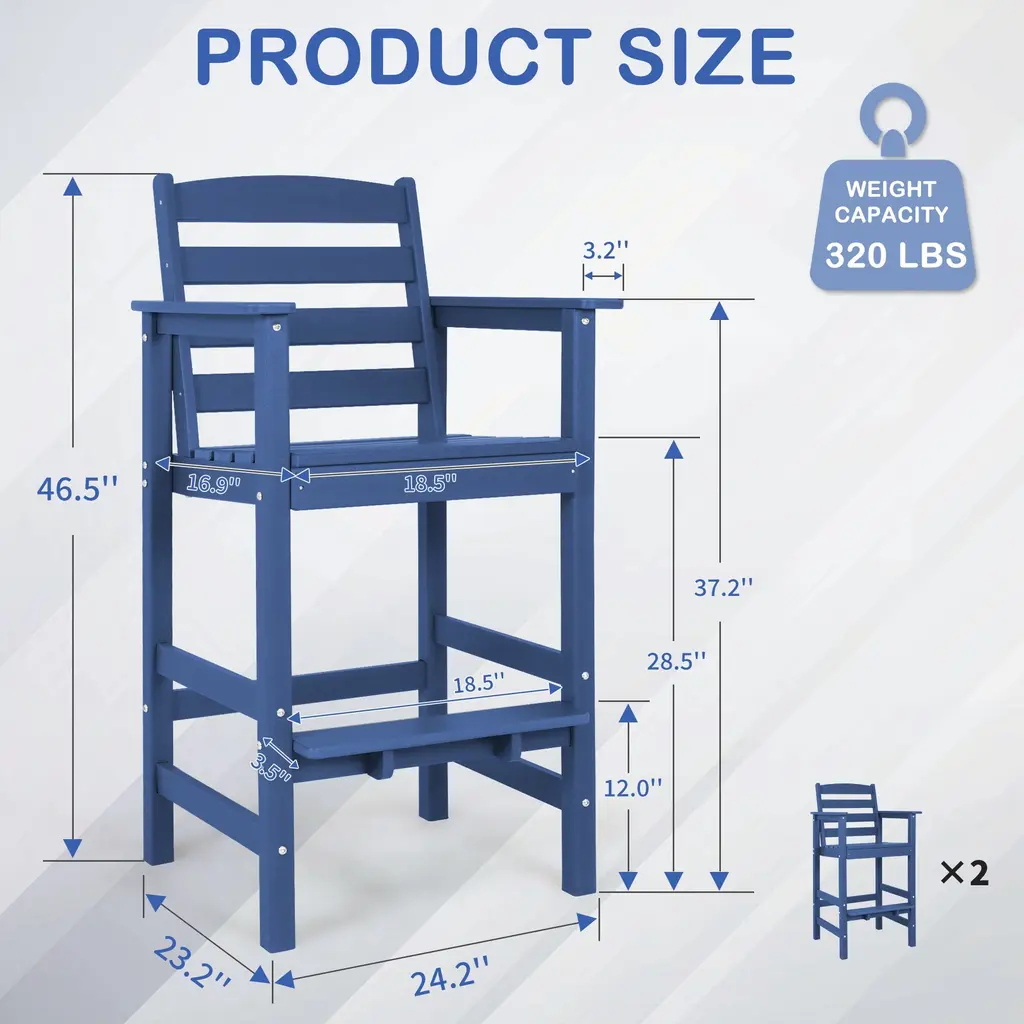 Crafted from weather-resistant HDPE, this adirondack bar chair is built to last, resisting fading, cracking, and peeling for year-round use. The sleek design complements any patio, deck, or poolside area. This bar chair is perfect for entertaining or relaxing. Low-maintenance and easy to clean, just wipe with a damp cloth. Ideal for BBQs, outdoor dining, or casual gatherings, this bar chair combines durability, style, and functionality to elevate your outdoor experience. Create your perfect outdoor oasis with this versatile and sturdy bar chair! Features: Crafted from high-density polyethylene (HDPE) This outdoor adirondack bar arm chair is built to withstand the elements The sleek design complements any patio, deck, or poolside area Resistant to fading, cracking, and peeling, it ensures long-lasting beauty and functionality, making it perfect for year-round outdoor use Designed for durability, the bar chair support up to 320 lbs This robust construction ensures stability and safety, making it ideal for gatherings and everyday use The bar arm chair feature 3.2-inch wide armrests and 3.5-inch wide footrests, providing added support and comfort for extended sitting Simply wipe down with a damp cloth to keep your bar set looking fresh and new, saving you time and effort in upkeep Specification: Colors: Navy Blue; Black; Gray Material: High-density polyethylene (HDPE) Weight Capacity of Bar Chair: 320 lbs Dimension of Bar Chair: 24.2" x 23.2 "x 46.5" (L x W x H) Package Include: 2 x Bar Chairs