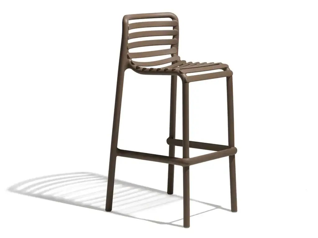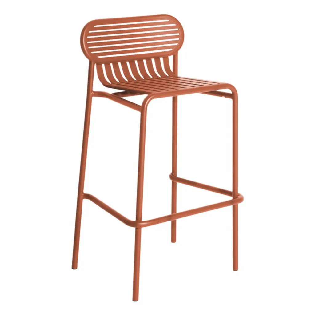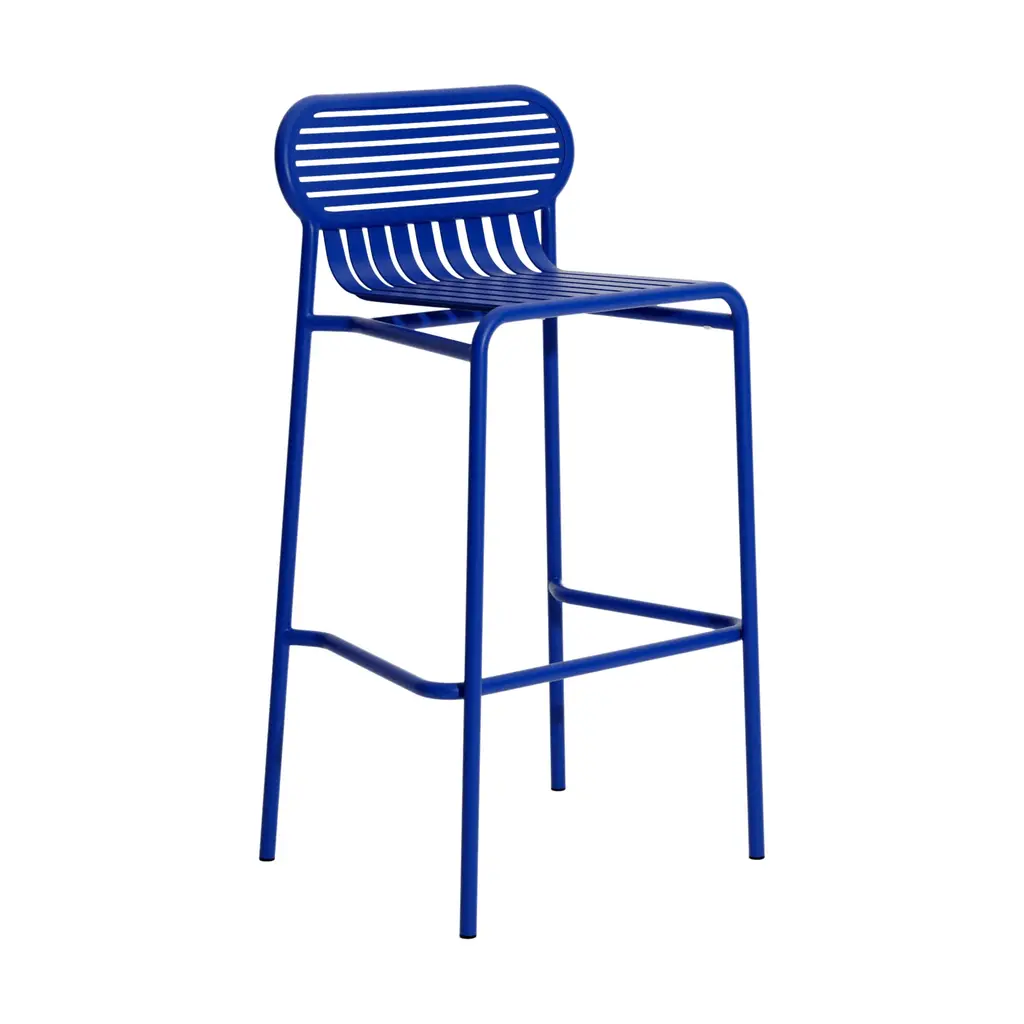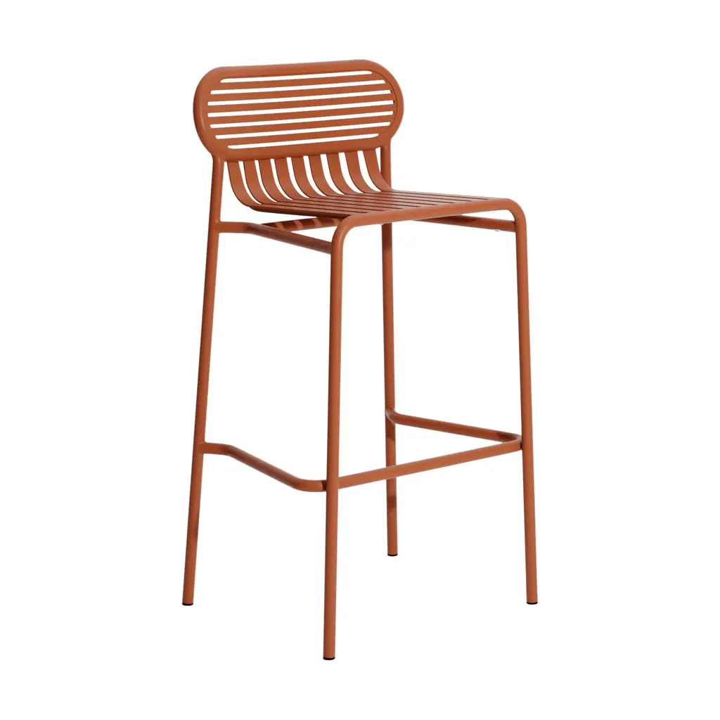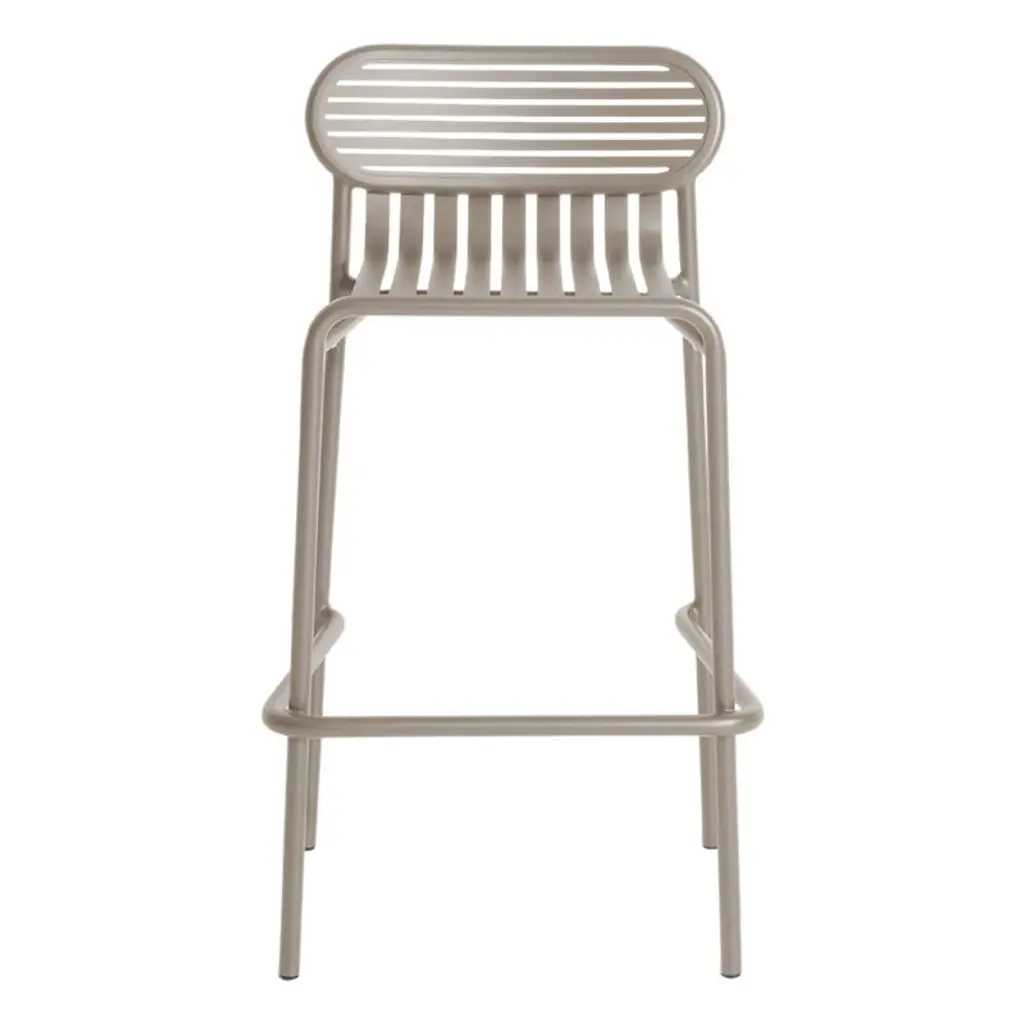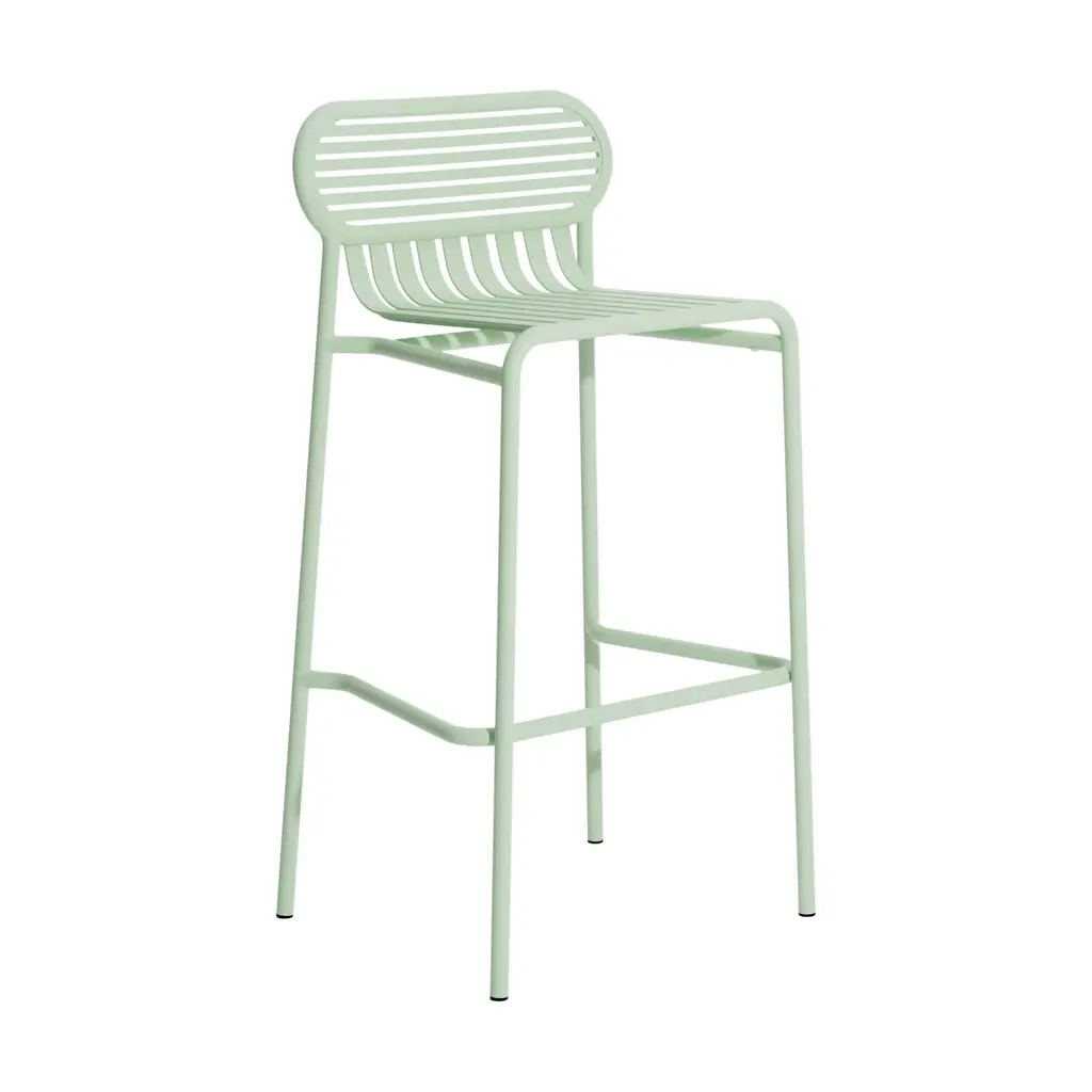 The Week-end high stool is part of Petite Friture’s collection of aluminum outdoor furniture. The Week-end high stool is characterized by oval shapes and both horizontal and vertical slats on the backrest. This clean-lined bar stool, specifically crafted for outdoor use, pairs seamlessly with the high tables from the same series. Created by the design duo BrichetZiegler, Petite Friture’s Week-end outdoor furniture combines different geometrical shapes with functional, contemporary design. The aluminum structure makes the pieces lightweight and hardwearing at the same time, and the epoxy-coated matt surface can easily stand any weather. The Week-end range consists of chairs, benches and tables in many colors and sizes, and is thus suitable for large gardens and small balconies alike. Thanks to the sleek design, the pieces can also be used indoors.