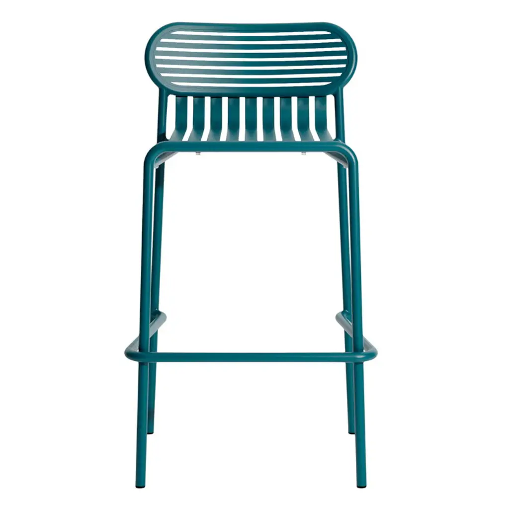 The Week-end high stool is part of Petite Friture’s collection of aluminum outdoor furniture. The Week-end high stool is characterized by oval shapes and both horizontal and vertical slats on the backrest. This clean-lined bar stool, specifically crafted for outdoor use, pairs seamlessly with the high tables from the same series. Created by the design duo BrichetZiegler, Petite Friture’s Week-end outdoor furniture combines different geometrical shapes with functional, contemporary design. The aluminum structure makes the pieces lightweight and hardwearing at the same time, and the epoxy-coated matt surface can easily stand any weather. The Week-end range consists of chairs, benches and tables in many colors and sizes, and is thus suitable for large gardens and small balconies alike. Thanks to the sleek design, the pieces can also be used indoors.