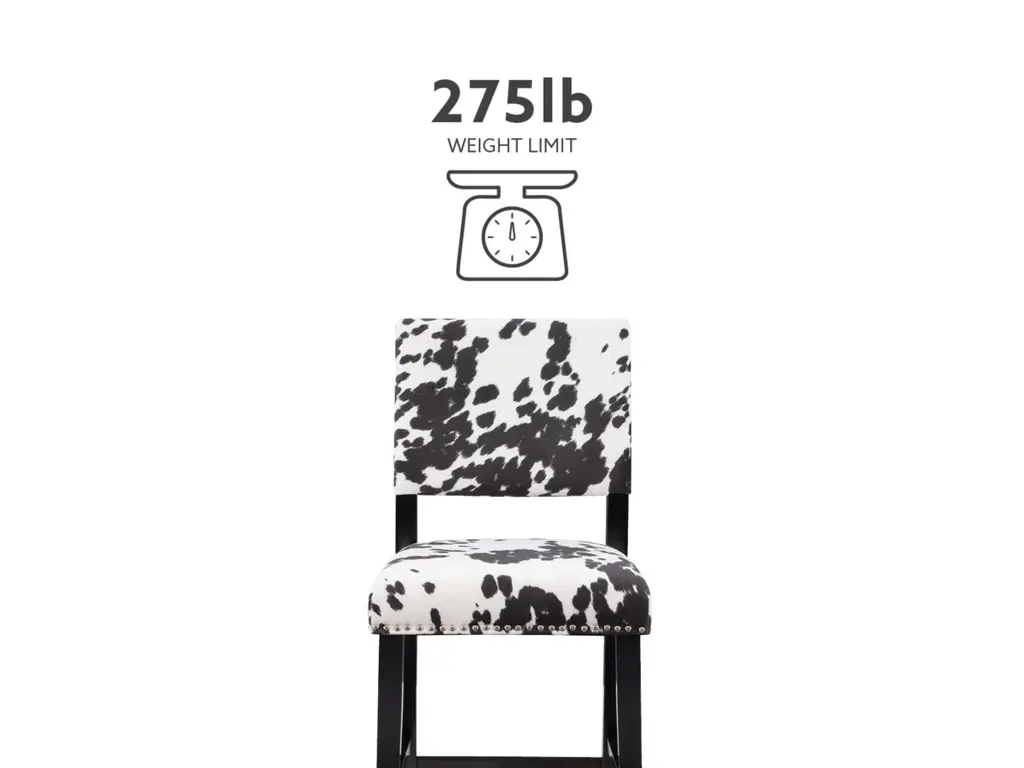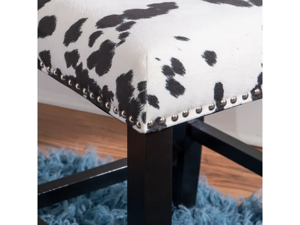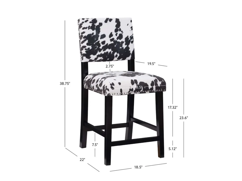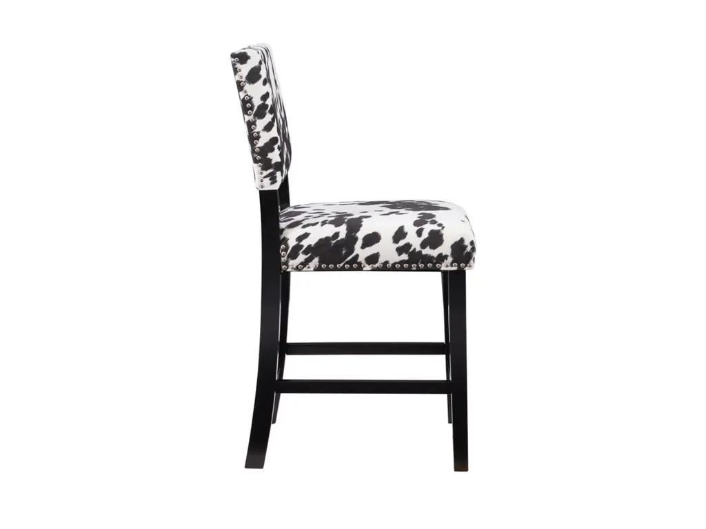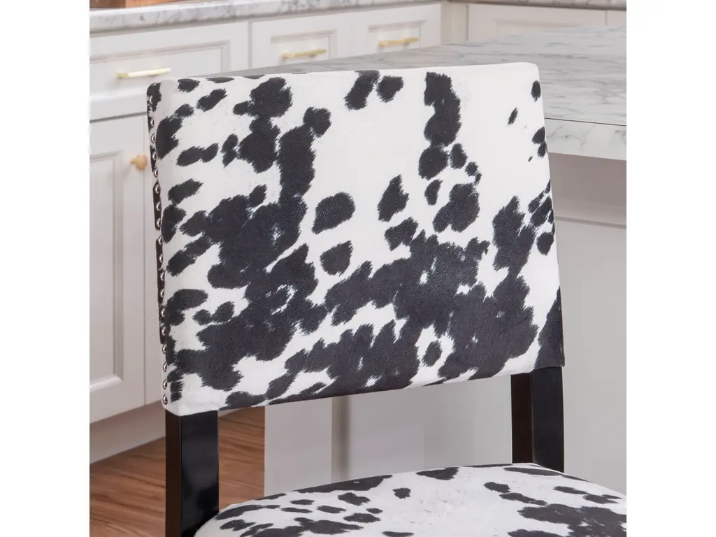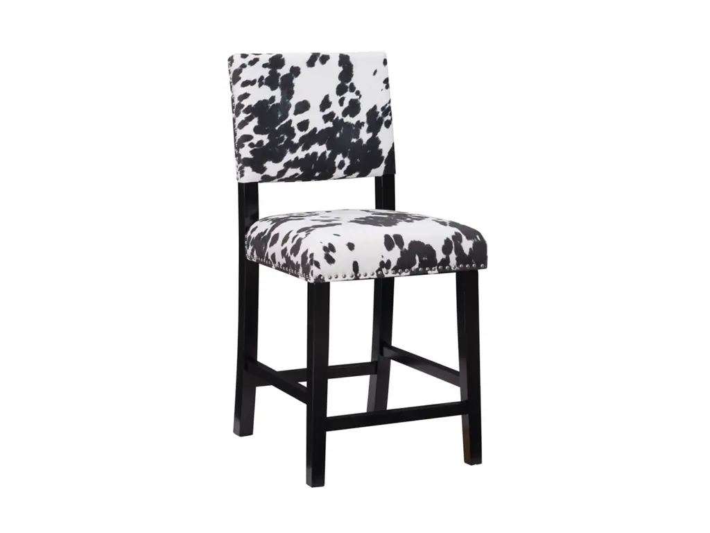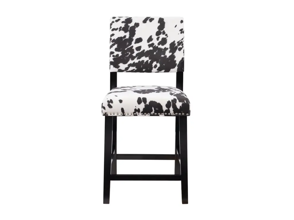 The Wes stool has a classic traditional style accented with black cow print upholstery. This stools bold print is outlined with shiny silver nail heads. Finished in a dark black, this stool is perfect for adding a touch of style to any kitchen or dinning area. Counter height.
