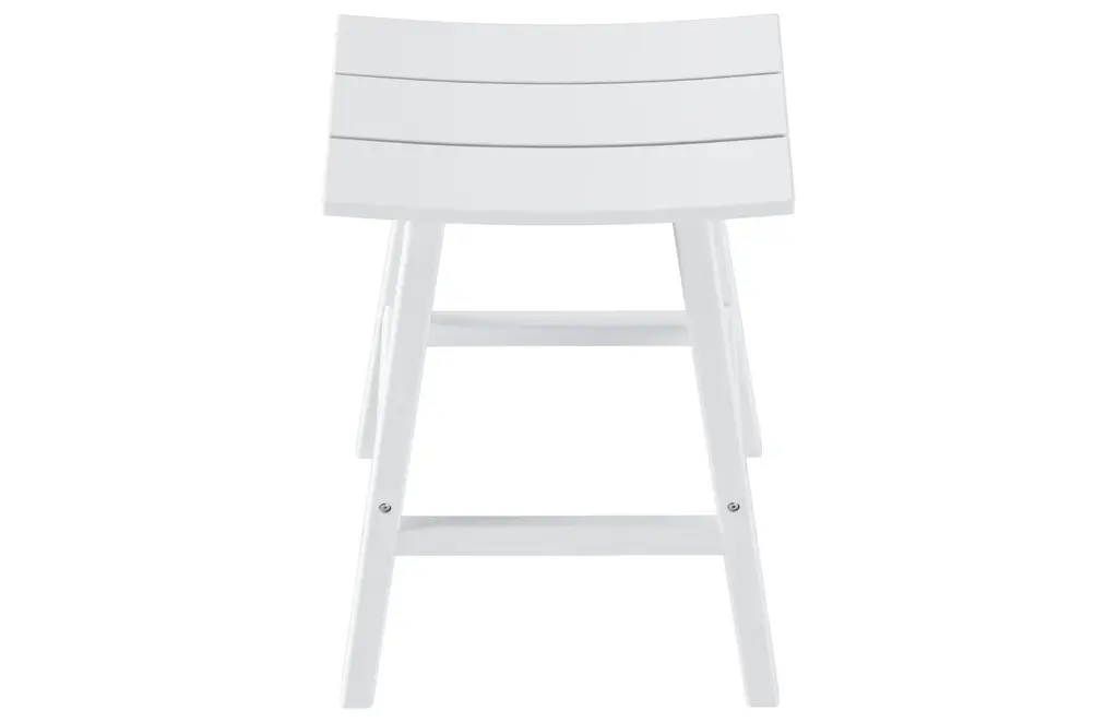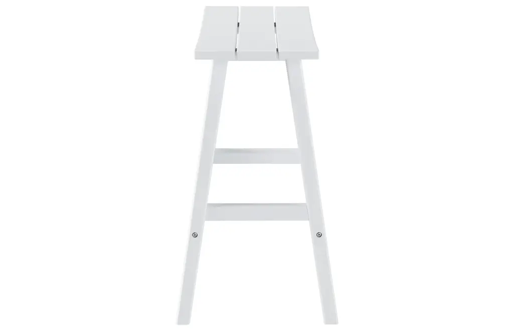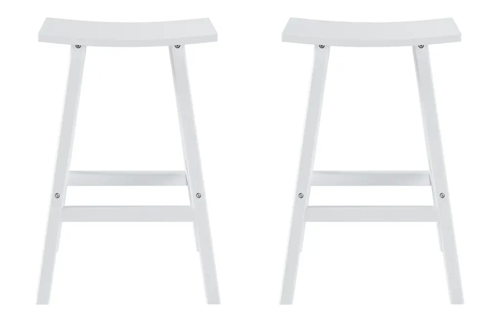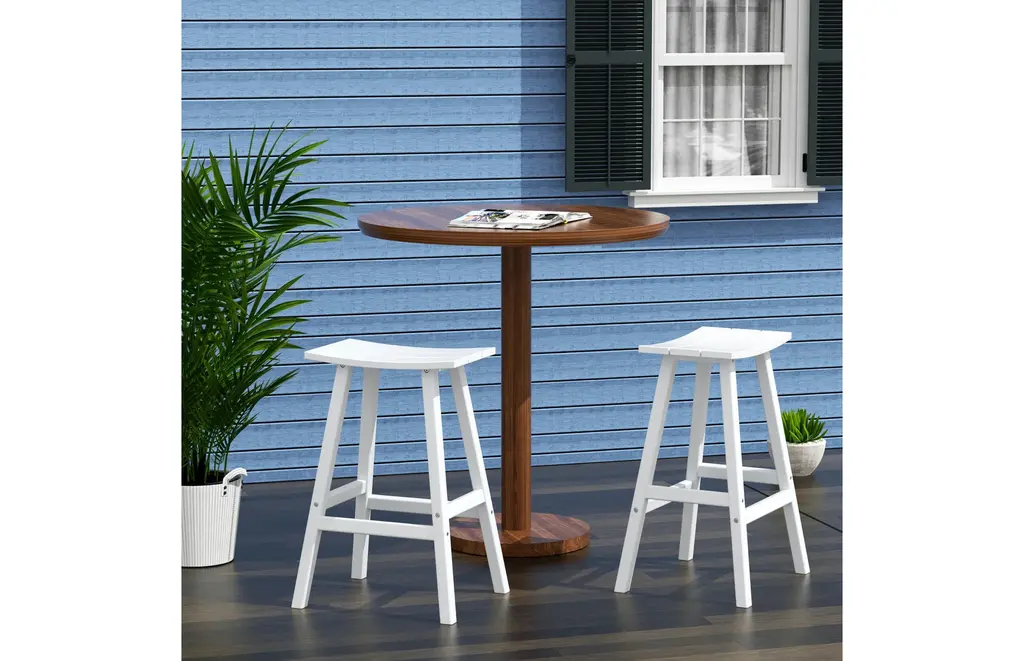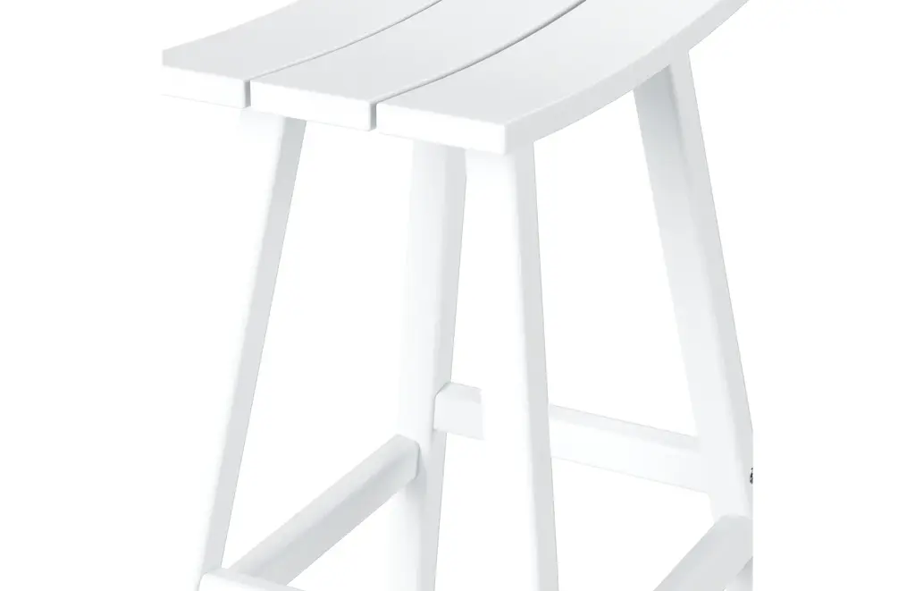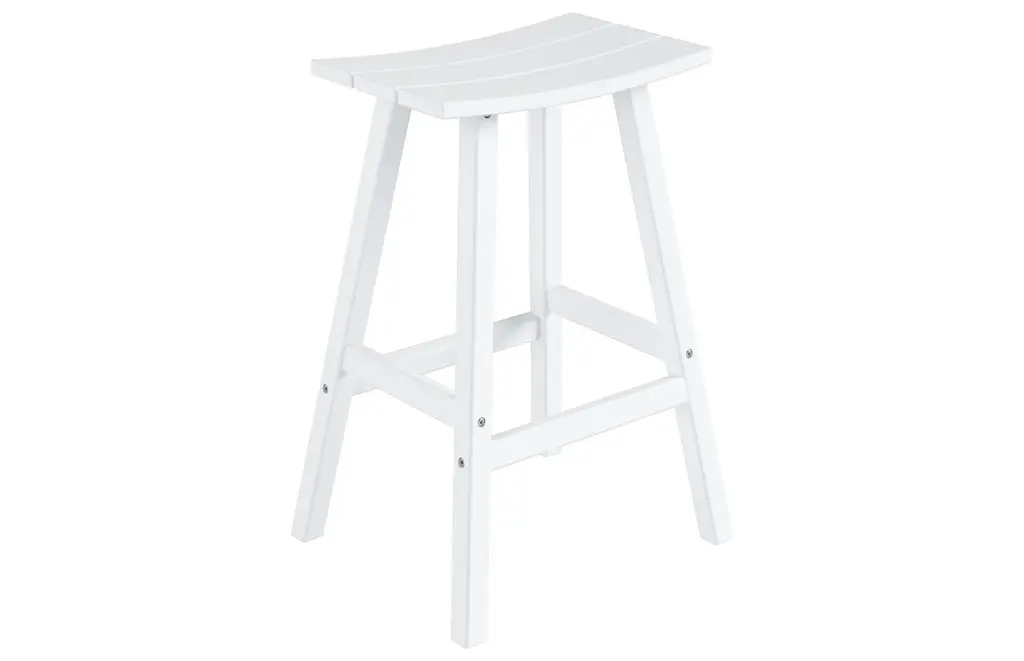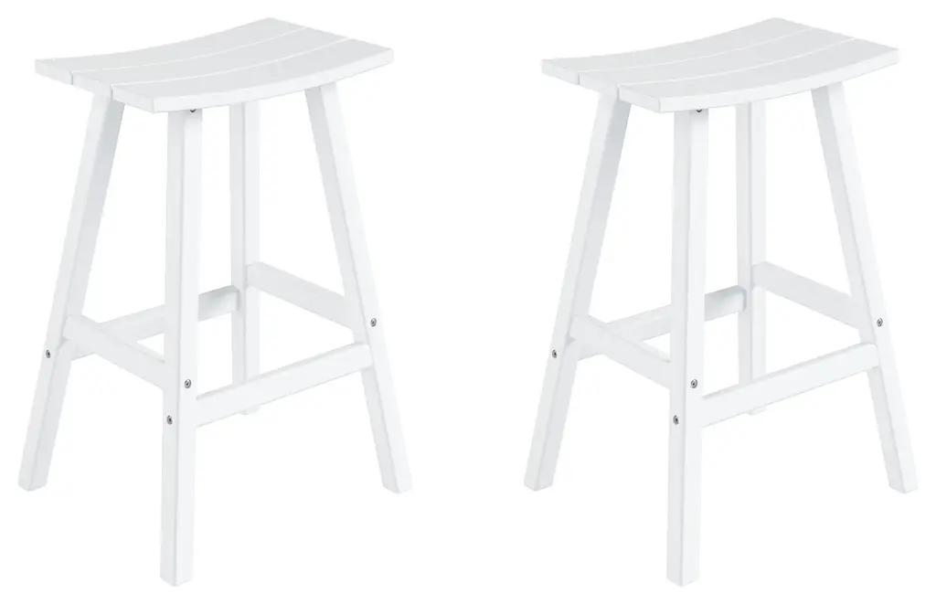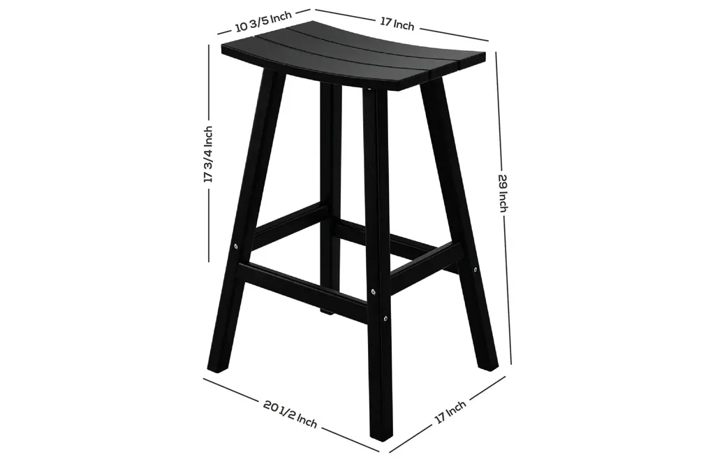 Perfect for all your outdoor entertaining, this 2-piece 29" saddle bar stool set will make the perfect addition to your backyard lounge area. Crafted of solid HDPE construction specifically made for daily outdoor use. UV and weather-resistant materials help keep its vibrant shine for many years of use. These outdoor bar stools area great way to add convenient seating to the kitchen, home bar, den, outdoor patio and more. This set of bar stools is designed to add a classic style to your home or outdoor living space. Combines perfectly with other Adirondack style furniture to help complete your outdoor set up. Saddle slatted seats will bring an elegant and comfortable style to any patio bar area. Available in easy to match colors. Slide them up to a Patio bar or use at a kitchen counter.FeaturesSet includes: Two (2) 29 inch saddle bar stoolsMade with weather resistant HDPE materialContoured saddle seat and comfortable footrestWeather and UV resistant finishFade resistant colors to keep that vibrant colorSimple to assembleDetailsProduct Type: Outdoor Bar StoolsDimensions: 20.5" W x 17" D x 29" H