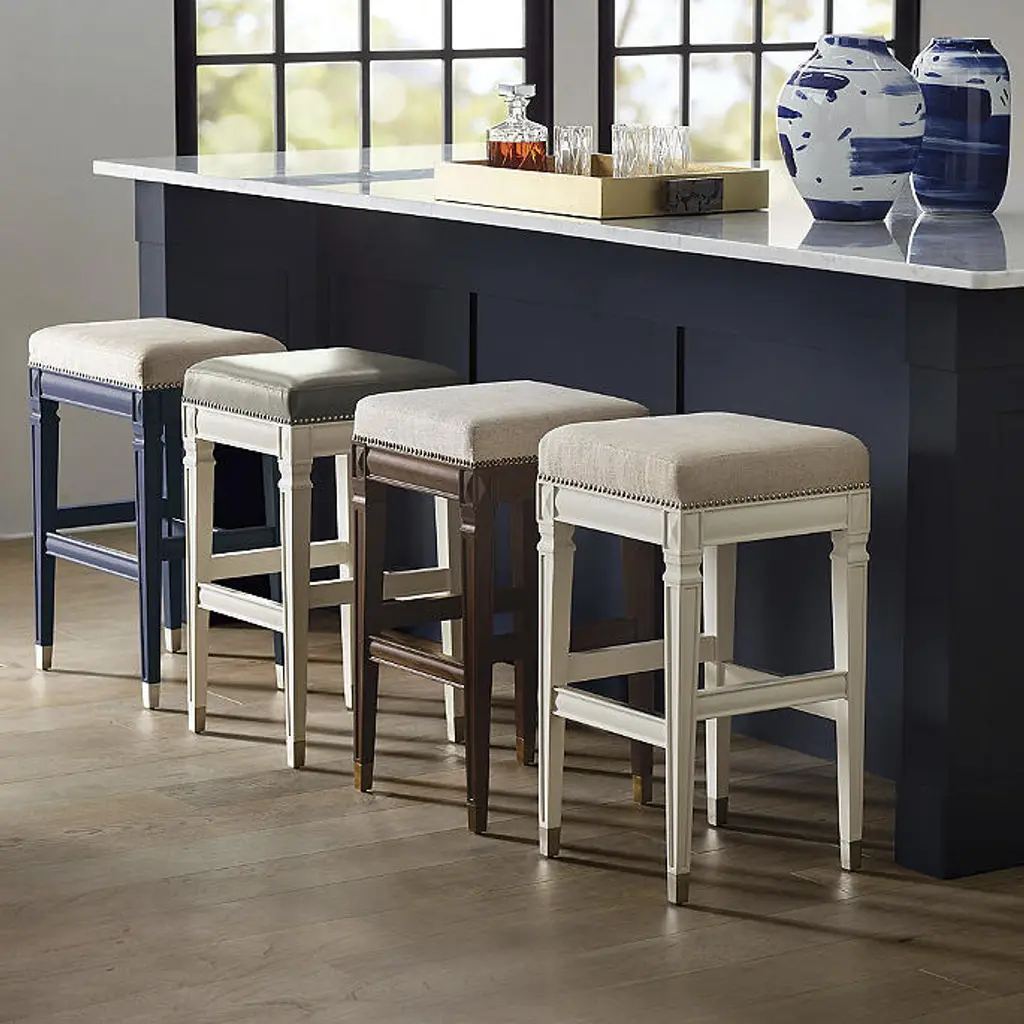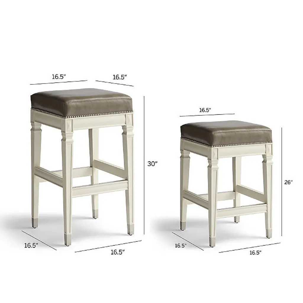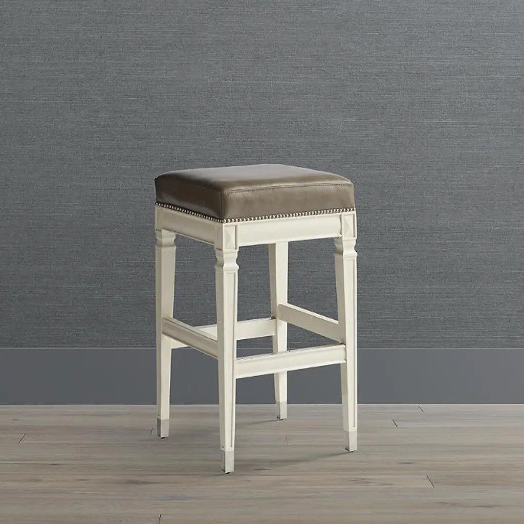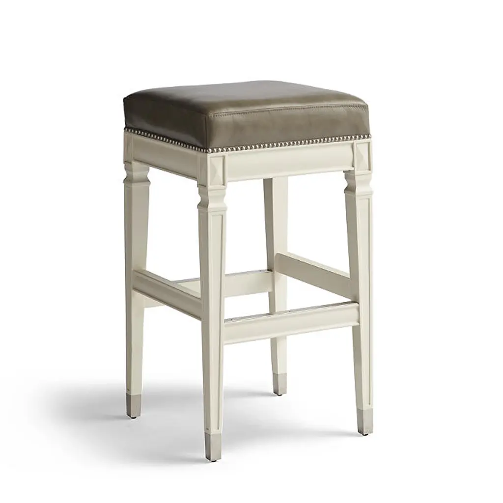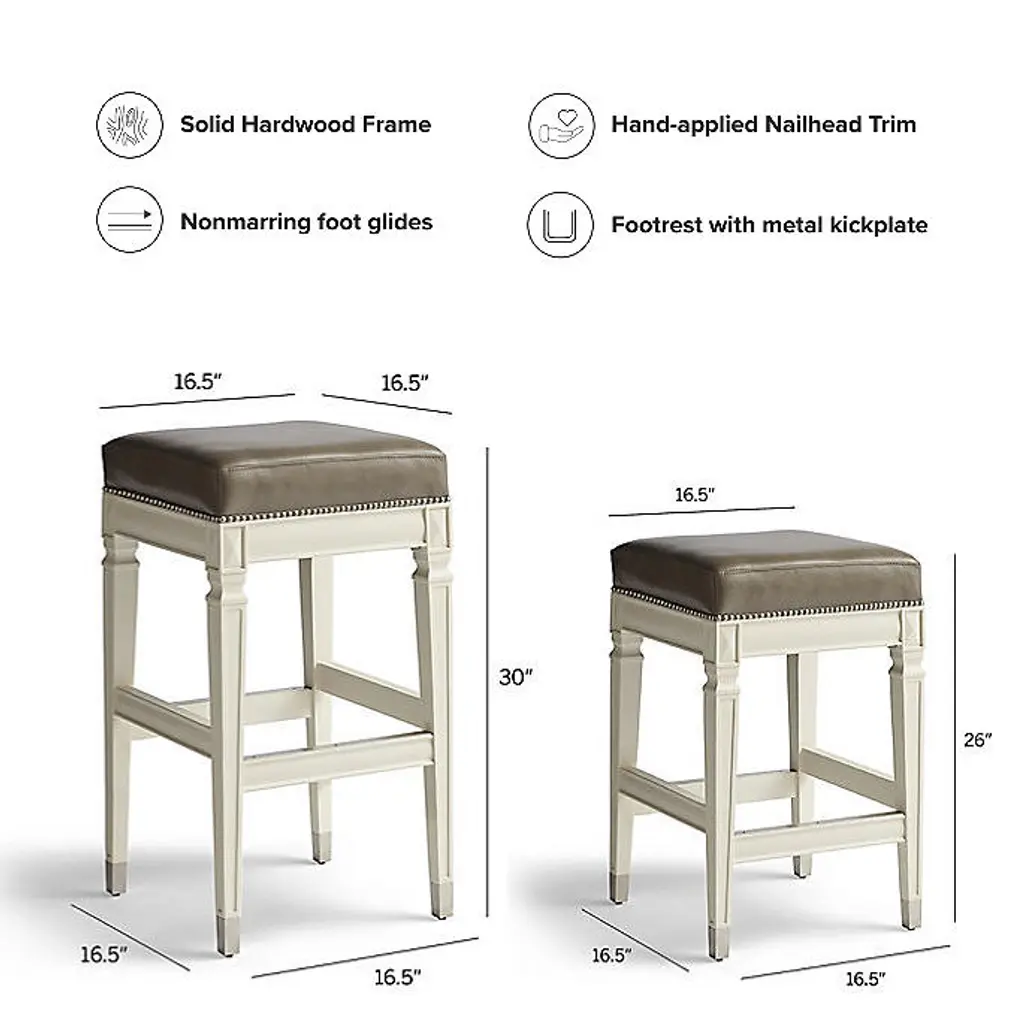 Straight lines and cleanly beveled accents give the Wexford Barstool a refined, architectural look that works well with any style countertop or bar. Constructed with a solid hardwood frame, it features a meticulously upholstered seat finished with hand-applied nailhead trim. Solid hardwood frame Upholstered in either genuine leather or performance linen fabric Linen fabric consists of 40% polyester, 40% rayon and 20% hemp Hand-applied metal nailhead trim Brass-capped feet with nonmarring foot glides Footrest with metal kickplate Nailheads/kickplate/footcaps are all Silver on Indigo and Alabaster White stools, are Antique Brass on Brownstone stool, and are Gunmetal on Washed Pecan stool Arrives assembled Imported A Frontgate exclusive. At Frontgate, our primary focus is quality. We guarantee that every product we sell will stand up to the supreme test – our customers' satisfaction. To learn more about our policies, visit our Shipping & Processing, Returns & Exchanges and Warranty & Price Guarantee pages.