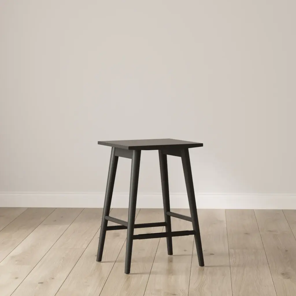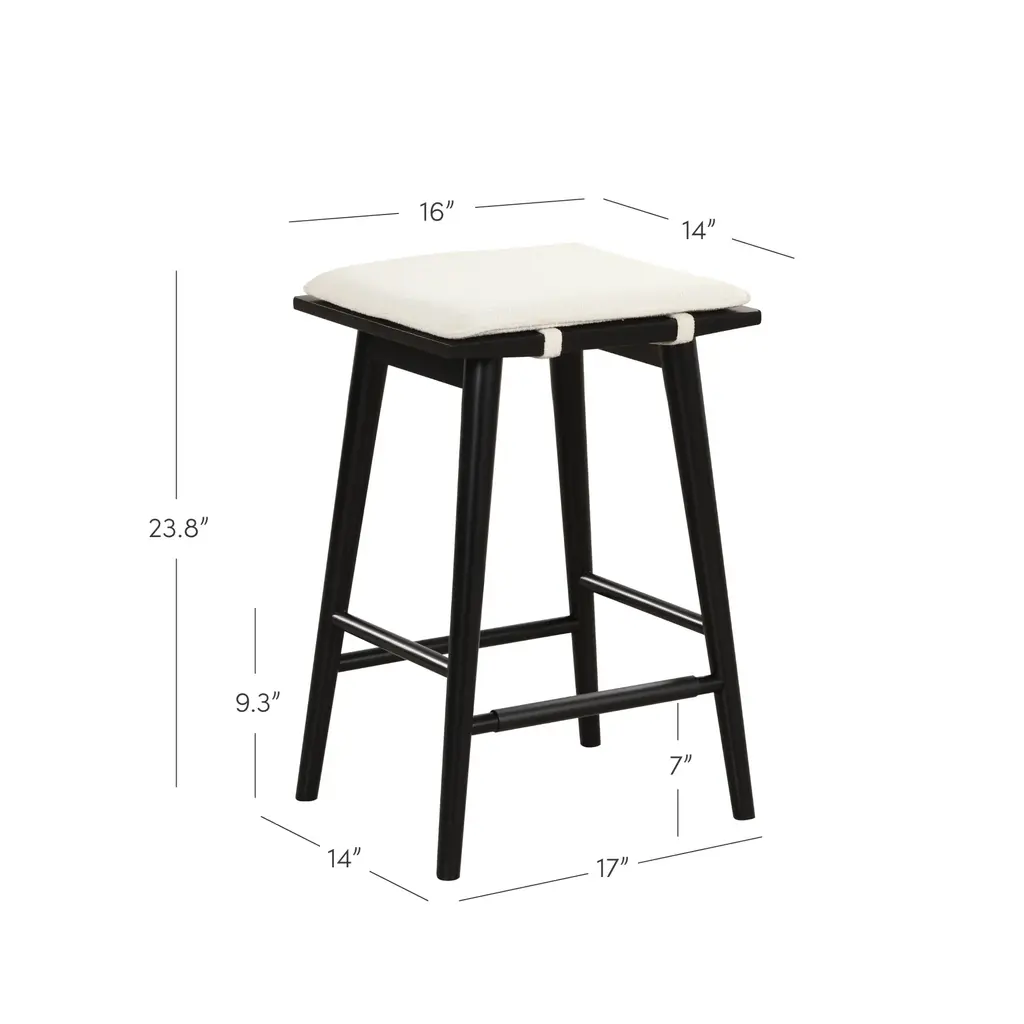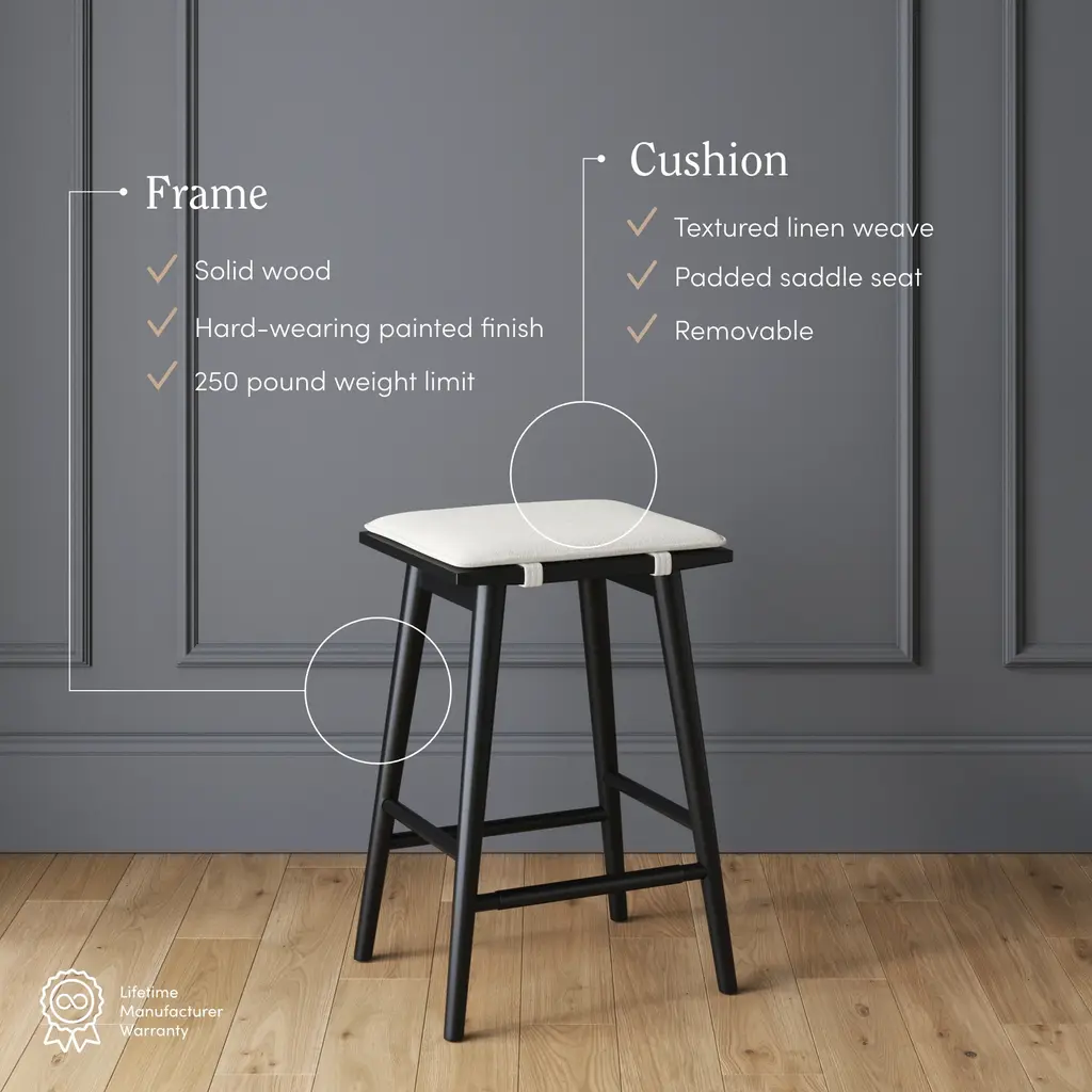 Keep your kitchen guest-ready with our mixed-material Barker bar stools. Sit comfortably for hours on its removable padded saddle seat that's made of natural textured linen weave fabric and held up by black solid wood legs and perfectly-placed foot rests. Plus, it features a metal frame over the footrest to avoid any scratches. Assemble these in no time at all with our easy-to-follow instructions and included hardware. At 25" tall, these refined mid-century modern stools are perfect for tucking under your kitchen counter when not in use. We have no doubt that this bar stool is going to be a dinner party favorite.