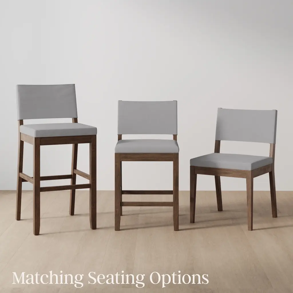 Meet the original Linus Bar Stool--the design that inspired our bestselling dining chair. With a 24" seat height, itユs made for kitchen islands and counter-height tables. Crafted with a solid wood frame in a rich dark brown finish and a reinforced fabric backrest that keeps its shape, Linus balances everyday comfort with lasting support. Natural wood grain variations ensure each stool has its own unique character, making every seat feel just a little more special.