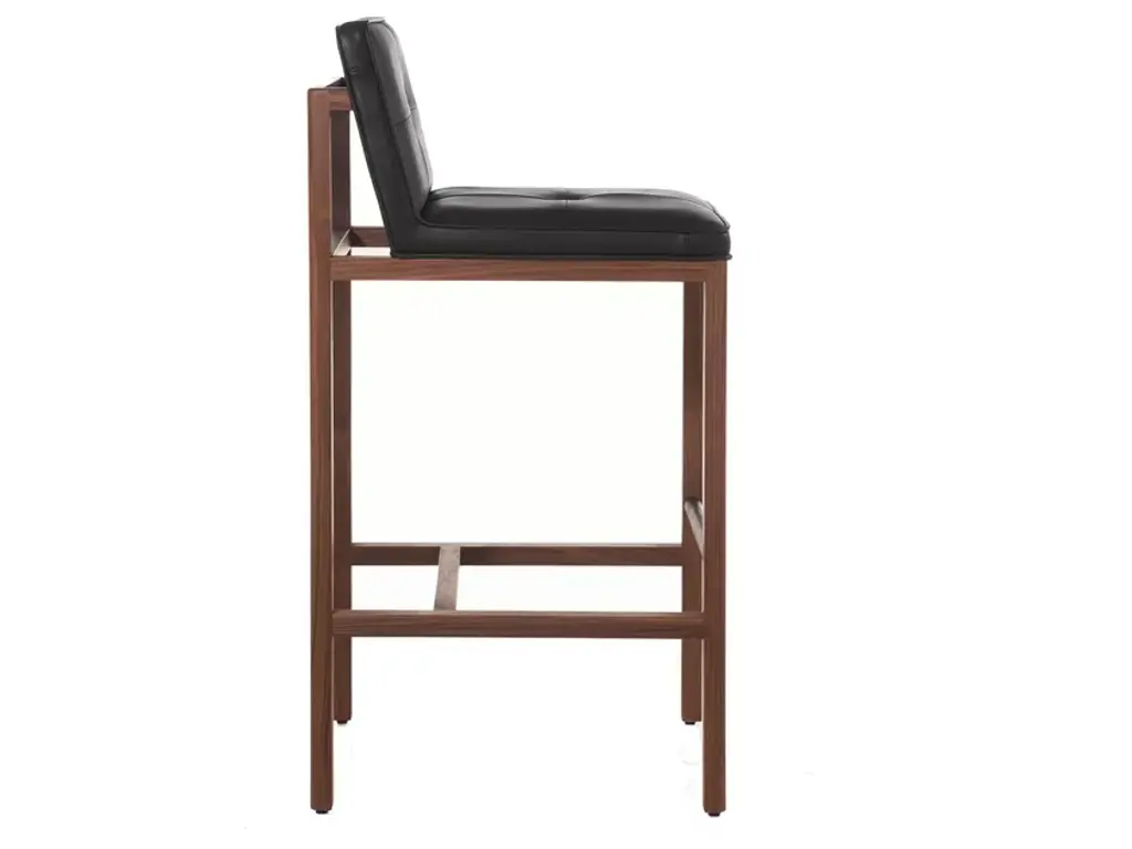 The Wood Frame bar stool is a stool with an upholstered seat and an exposed carved, solid wood frame. The upholstery features dual density foam with inverted seams, tufted and welted. Materials: Exposed frame in solid Walnut, Oak, Ash, or Ebonized Ash.The BassamFellows Wood Frame Collection has become one of the brand’s classic signatures since launching fifteen years ago. Adding to the collection are upholstered dining chairs and upholstered stools. The Wood Frame Collection was originally designed to be remarkably lightweight and sophisticated without interfering with comfort. This was achieved by reducing the form of the chair to its essence — an exposed structural fine wood frame that integrates all elements of the chair, connecting seat, back and arms while creating a ‘caged’ effect, and a system of thin, layered cushions for ultimate comfort. The Wood Frame Dining Chairs and Stools take this concept and push them to their limits – the wood frame is even more cage like than the lounge chairs, with the members reduced to their absolute minimum. The wood elements produce the chair’s distinctive side profile and back view, two of the most important angles of any dining chair when viewed around a table. The outer corners are softly rounded, a BassamFellows signature, and the exposed rear frame becomes both a handle to maneuver the chair without touching the upholstery and a convenient place to hang a jacket or sweater. Cushions have also been slimmed to the absolute minimum without sacrificing comfort. The backrest is structural but designed with a non-rigid upper frame to keep its profile as thin as possible while building in flex for movement. Cushions are lightly tufted for a distinctly tailored appearance.