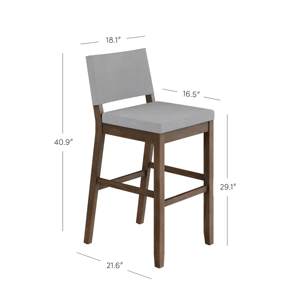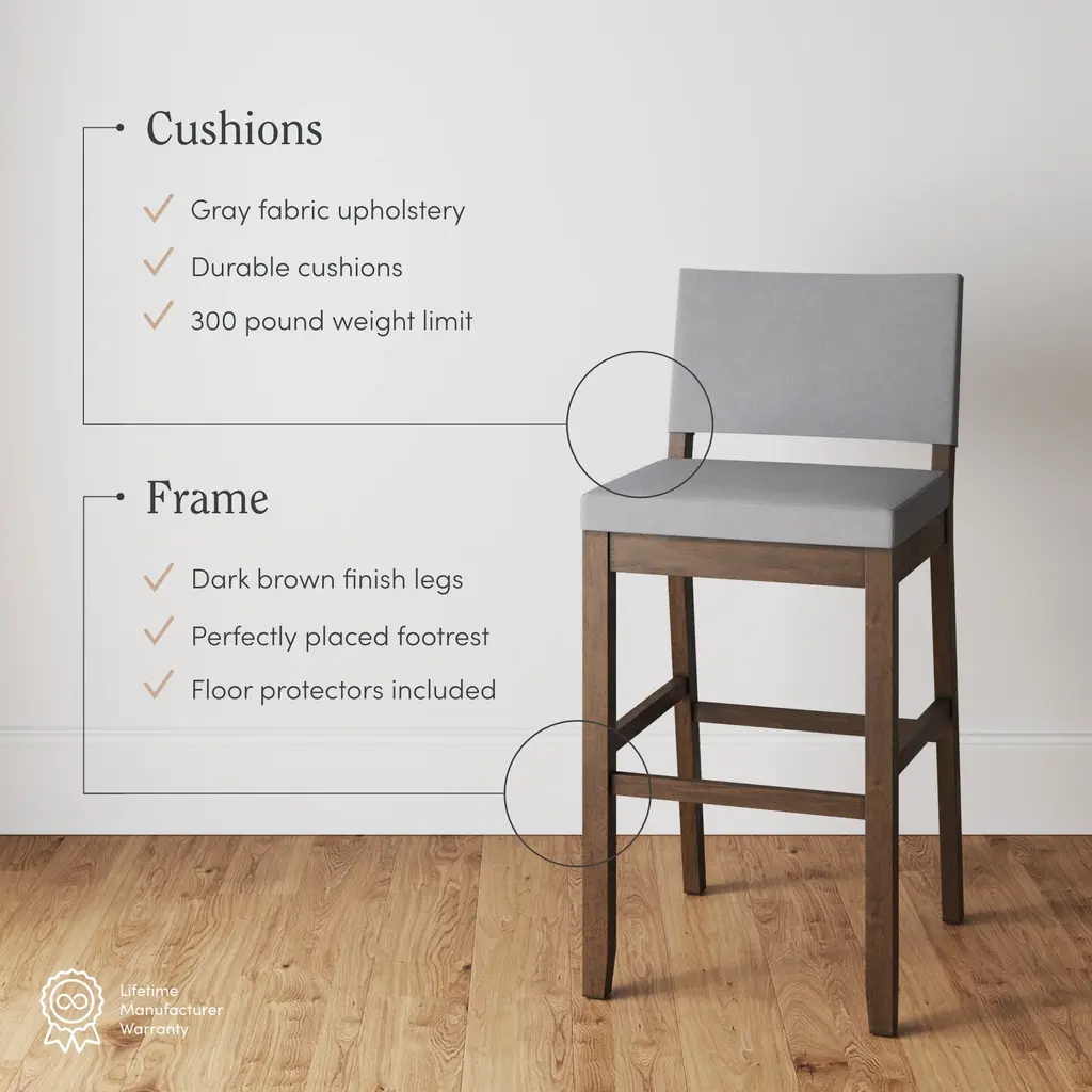 The original Linus Bar Stool combines everyday comfort with a timeless look. Its solid wood frame in a dark brown finish supports a thick, durable cushion and a gray upholstered backrest reinforced to hold its shape over time. Designed for counter-height seating, Linus brings a tailored touch to your kitchen or dining space. Natural wood grain and texture variations add depth and character, highlighting the beauty of real wood.