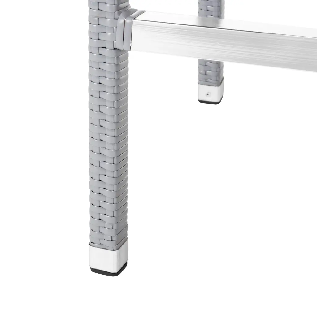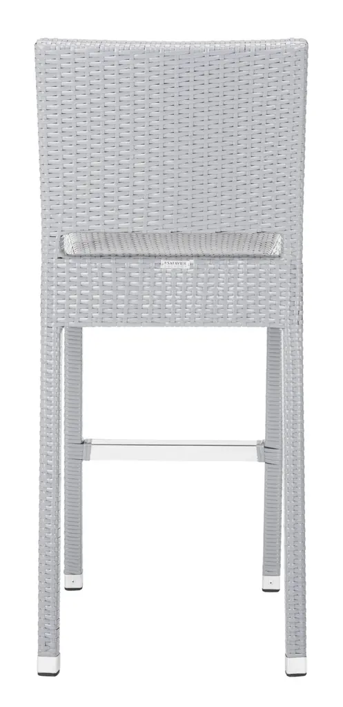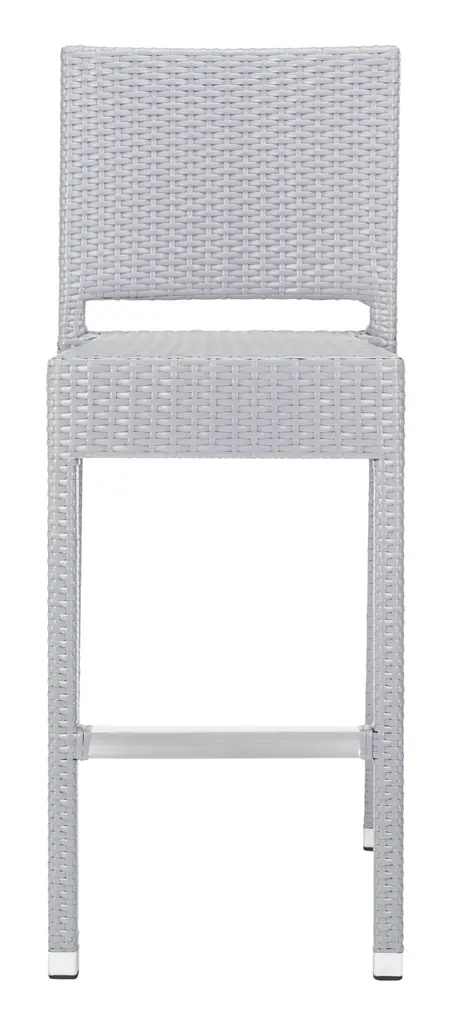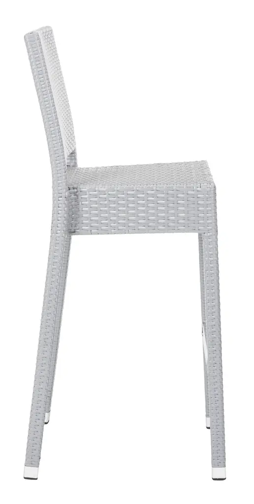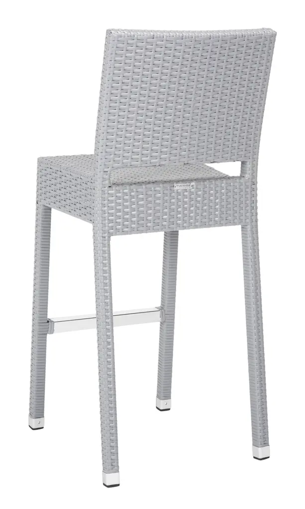 A perfect balance of design and utility, the indoor-outdoor barstool by looks as chic at the kitchen island as it does on the patio. Crafted of easy-care grey wicker with a aluminum frame, and trimmed with contrasting footrest and caps in silver,is transitional in style. Store outdoor furniture indoors or cover well when not in use. Remove wooden furniture from standing water. Dust regularly with small brush or vacuum. Spills should be taken care of immediately before they harden or stain with a slightly dampened sponge. Do not use bleach solutions.