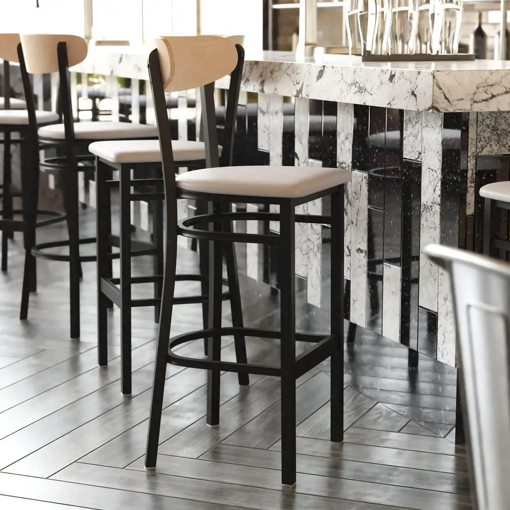 Wright Commercial Grade Barstool With 500 Lb. Capacity Steel Frame, Solid Wood Seat, And Boomerang Back
