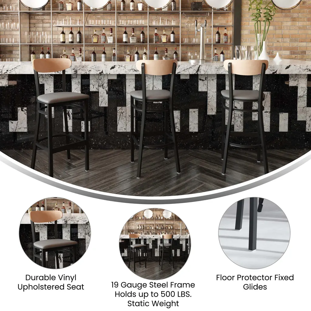 Welcome guests time after time with a new era of long-lasting but beautiful commercial seating. Designed for use in the hospitality industry, as well as your busy household, these barstools offer solid wood seats and boomerang backrests atop ultra-strong, powder coated steel frames that hold up to 500 lbs. static weight. The lower bracing serves double duty as a footrest to relieve pressure from the legs for a comfortable seating experience. Assembly takes less than 10 minutes and a damp cloth is all that is required for easy cleanup. Available in dining height, in 2 finishes, and in sets of 2, this sleek modern stool is ideal for restaurants, pubs, cafe, or your kitchen counter or basement bar.