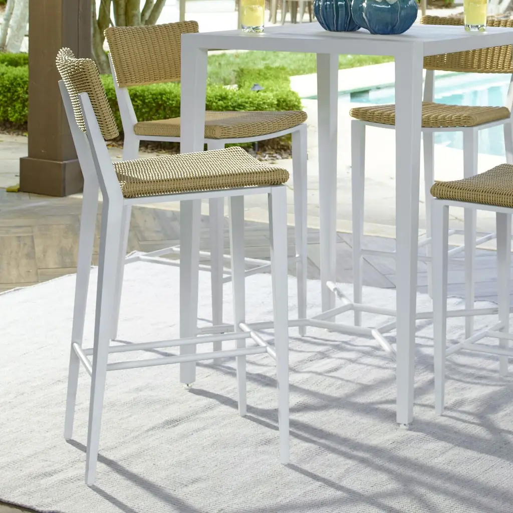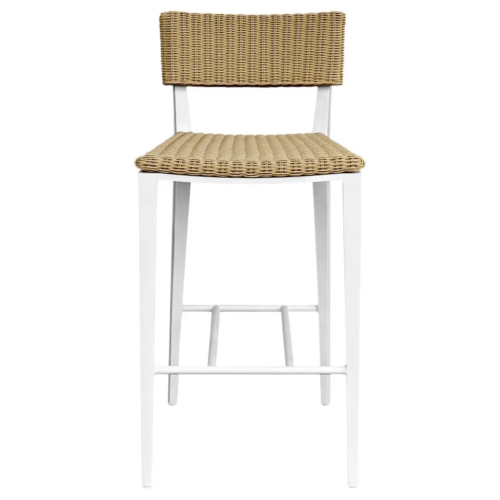 The Yasmina bar stool is a perfect union of style and comfort, designed to elevate any outdoor setting into a haven of elegance and relaxation. Its sleek aluminum frame, meticulously crafted and powder-coated, serves as a sturdy foundation for the exquisite hand-wrapped all-weather wicker. This harmonious blend of materials creates a timeless aesthetic that invites you to linger a little longer, savoring the beauty of your surroundings. Whether you're enjoying a quiet morning coffee or hosting an evening gathering, the Yasmina bar stool promises to be a cherished companion, offering both sophistication and comfort in equal measure.