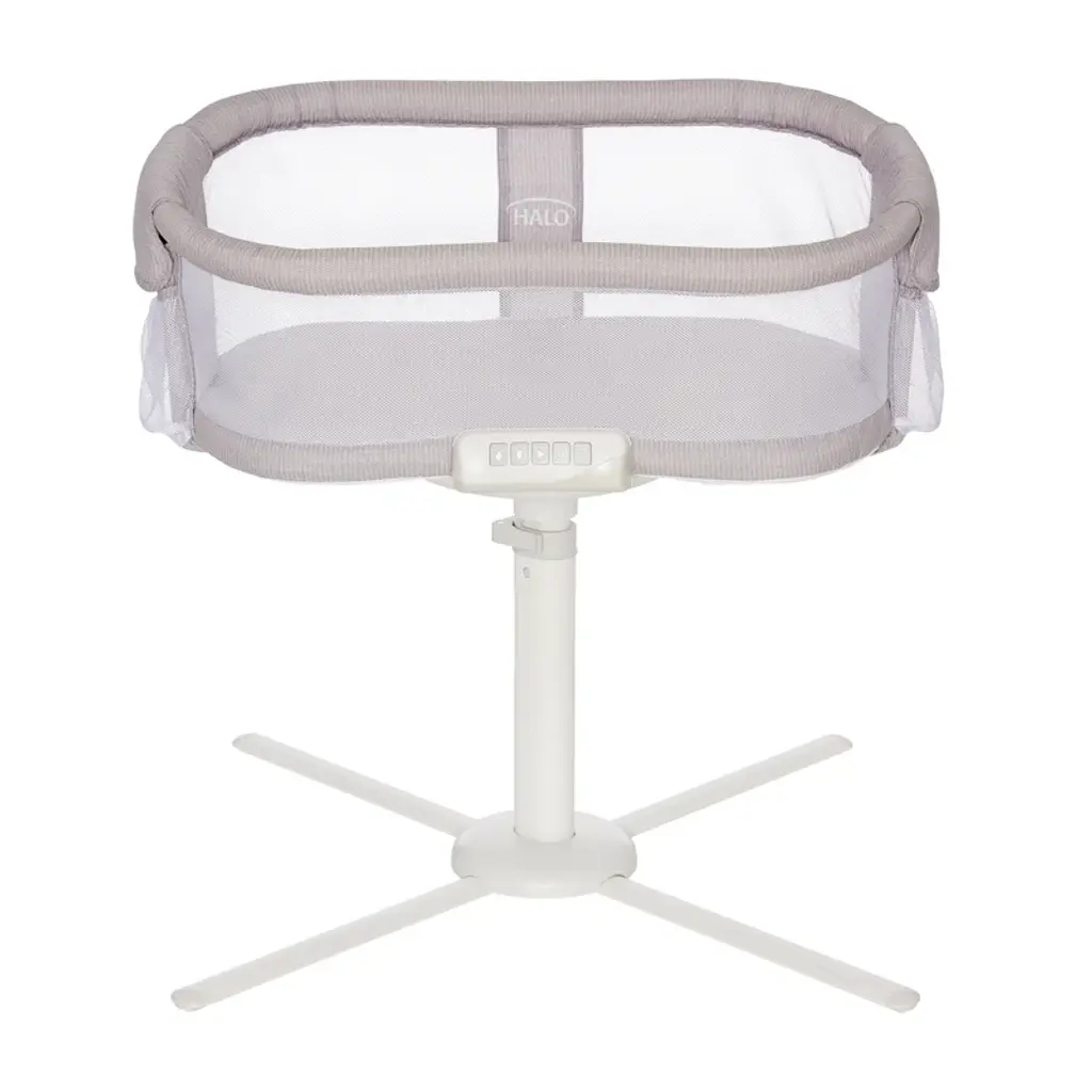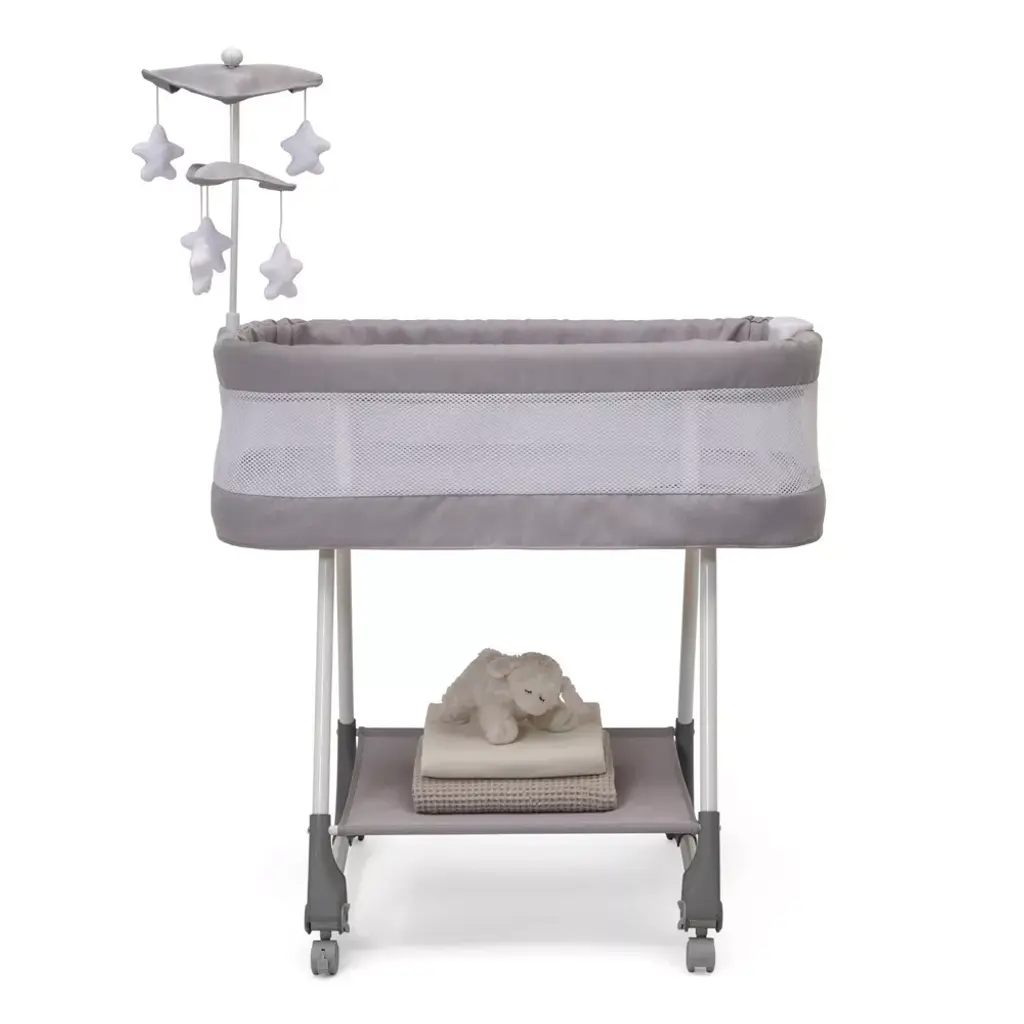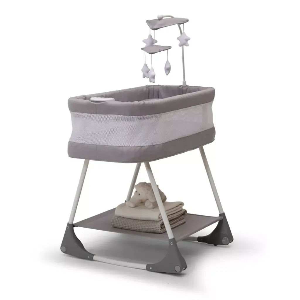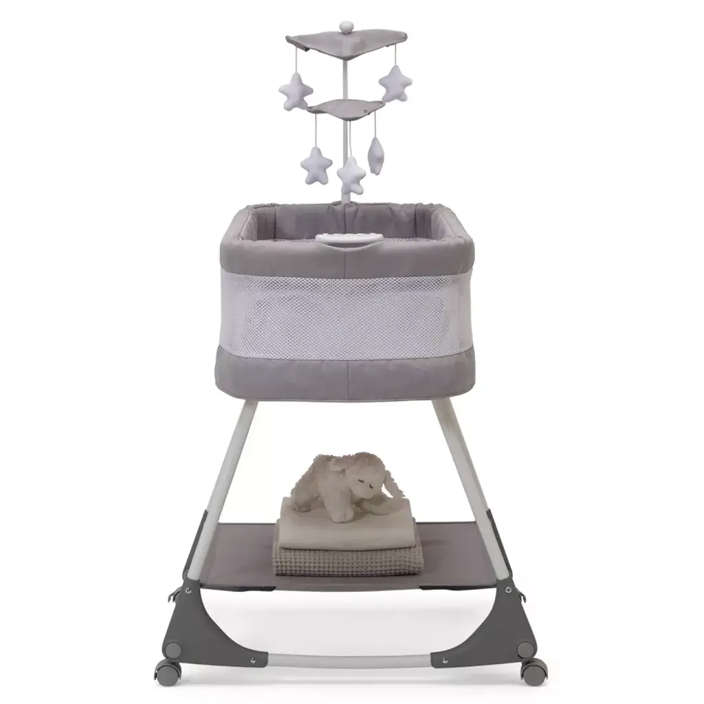 Help your baby (and yourself!) get some much-needed sleep with the Shooting Star Rocking Bassinet with Air Flow Mesh by Simmons Kids. With soothing vibrations, sounds and nightlight, this cozy bedside bassinet creates a serene environment that enables everyone in the family to get a better night’s sleep. Adding to the calming oasis, this portable crib gently rocks with a light push from you while the stationary, two tier toy arm adorned with plush stars will help soothe your baby. Breathable mesh sides all-around allow for visibility and airflow, and the comfortable mattress pad provides a cozy environment that promotes good sleeping habits. Designed with ultimate convenience in mind, the bassinet’s wheels make it easy to move this portable crib from room to room and a large storage shelf keeps diapers and nighttime necessities close by. The smart design of this baby bassinet is versatile enough for your baby’s first months at home. This bassinet is recommended for babies 0-5 months. Max weight 30 lbs. Stop use at 5 months or once your infant begins to push up on their hands and knees, whichever comes first.