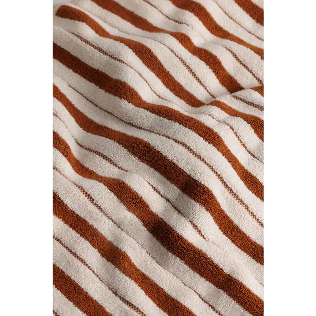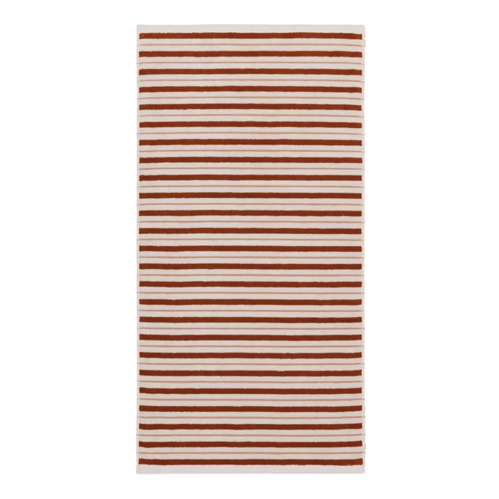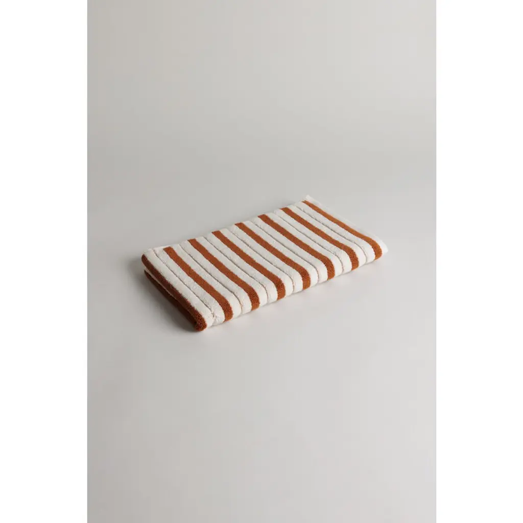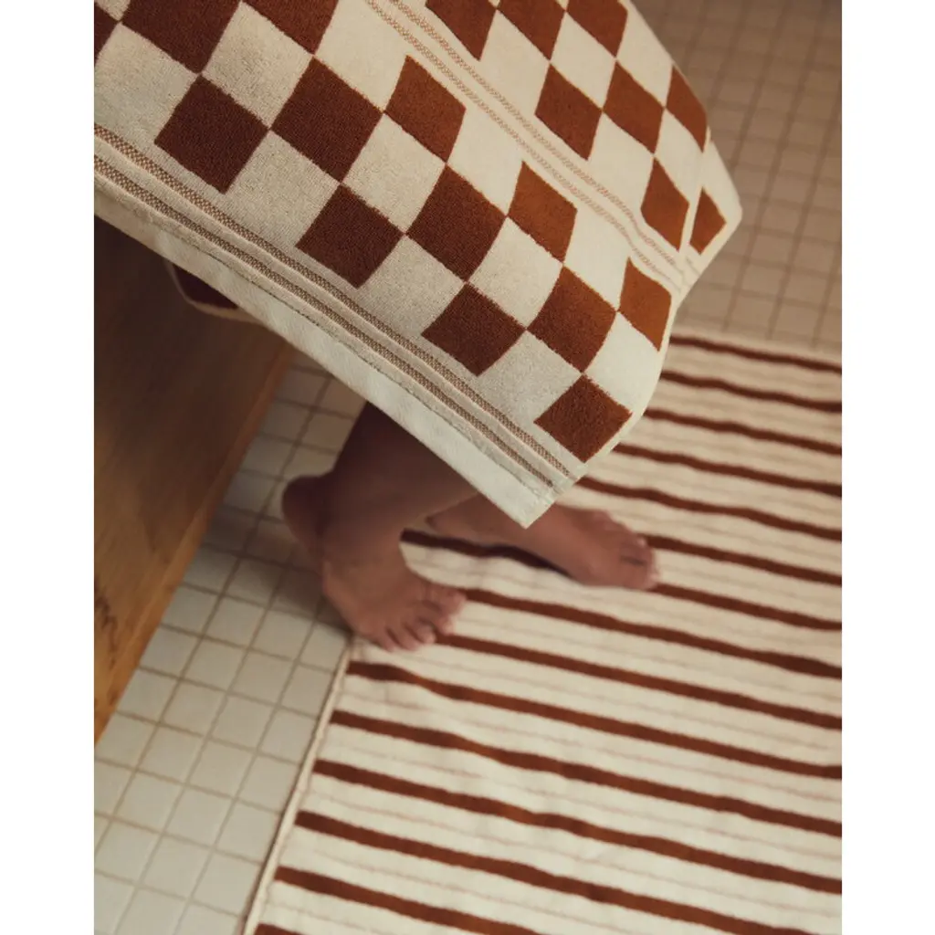 The Baina Echo bath mat features a fresh two-tone stripe pattern with alternating thick woven stripes and small checkerboard embroideries. The design is mirrored on the reverse side in opposite shades. Made from densely woven, highly absorbent organic cotton terry, this thick bath mat feels wonderfully soft under bare feet. Baina's bathroom textiles are designed to bring luxury to everyday life, transforming daily bathing into a calm and enjoyable ritual. Their patterns draw inspiration from many directions, such as fine arts, architecture and color theory. Baina textiles are crafted from organic cotton at a weaving mill in Portugal.