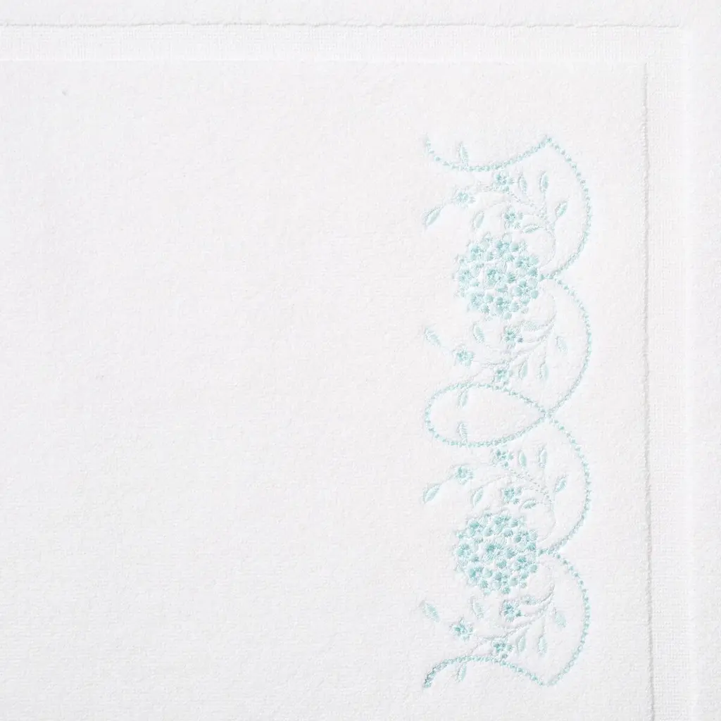 A floral loop motif adds a fanciful finishing touch to this plush and absorbent bath mat, made from exquisitely soft combed cotton, woven in Italy and artfully embroidered in the USA.