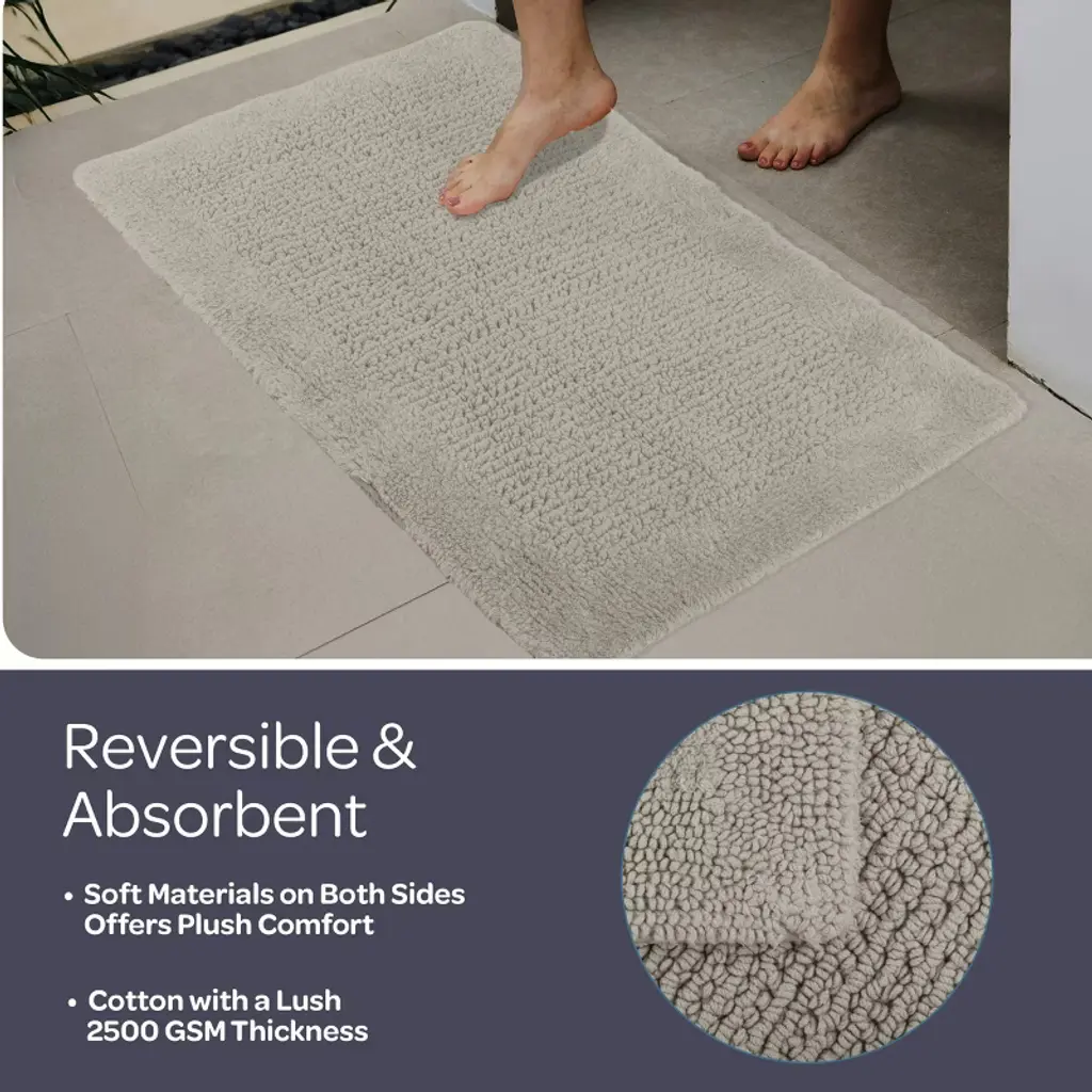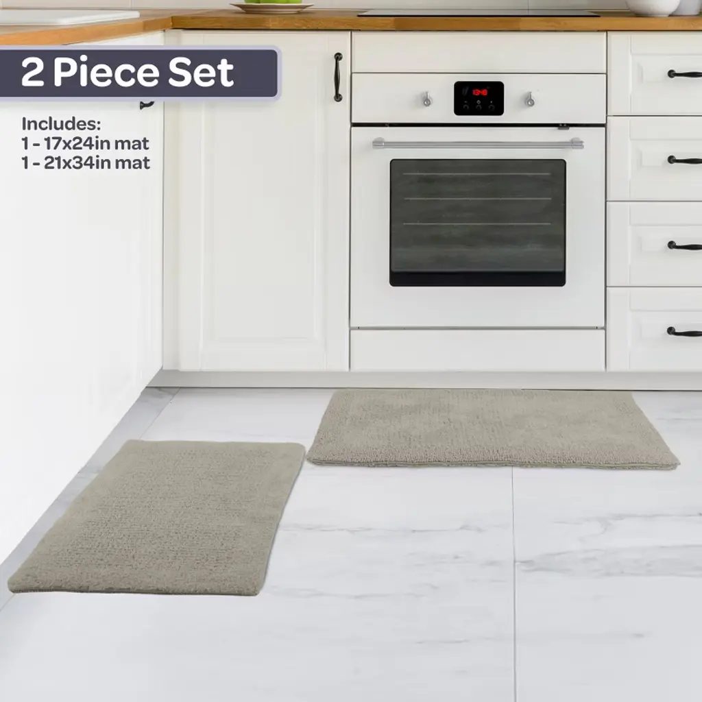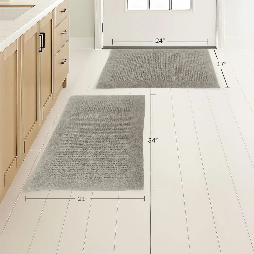 Pamper your feet by stepping out of the shower and onto the Bath Mats for Bathroom Floor Set of 2 by Lavish Home. The bathroom rugs set comes with one 17x24-inch small bathroom rug and one 21x34-inch long bath mat made of plush cotton with a 2500GSM thickness, making them soft to the touch as well as extremely absorbent and durable for lasting use in your bathroom, kitchen, or laundry room. Each cotton bath mat features a reversible design for twice the usage and is conveniently machine washable as needed for an easy to clean addition to your bathroom accessories.
