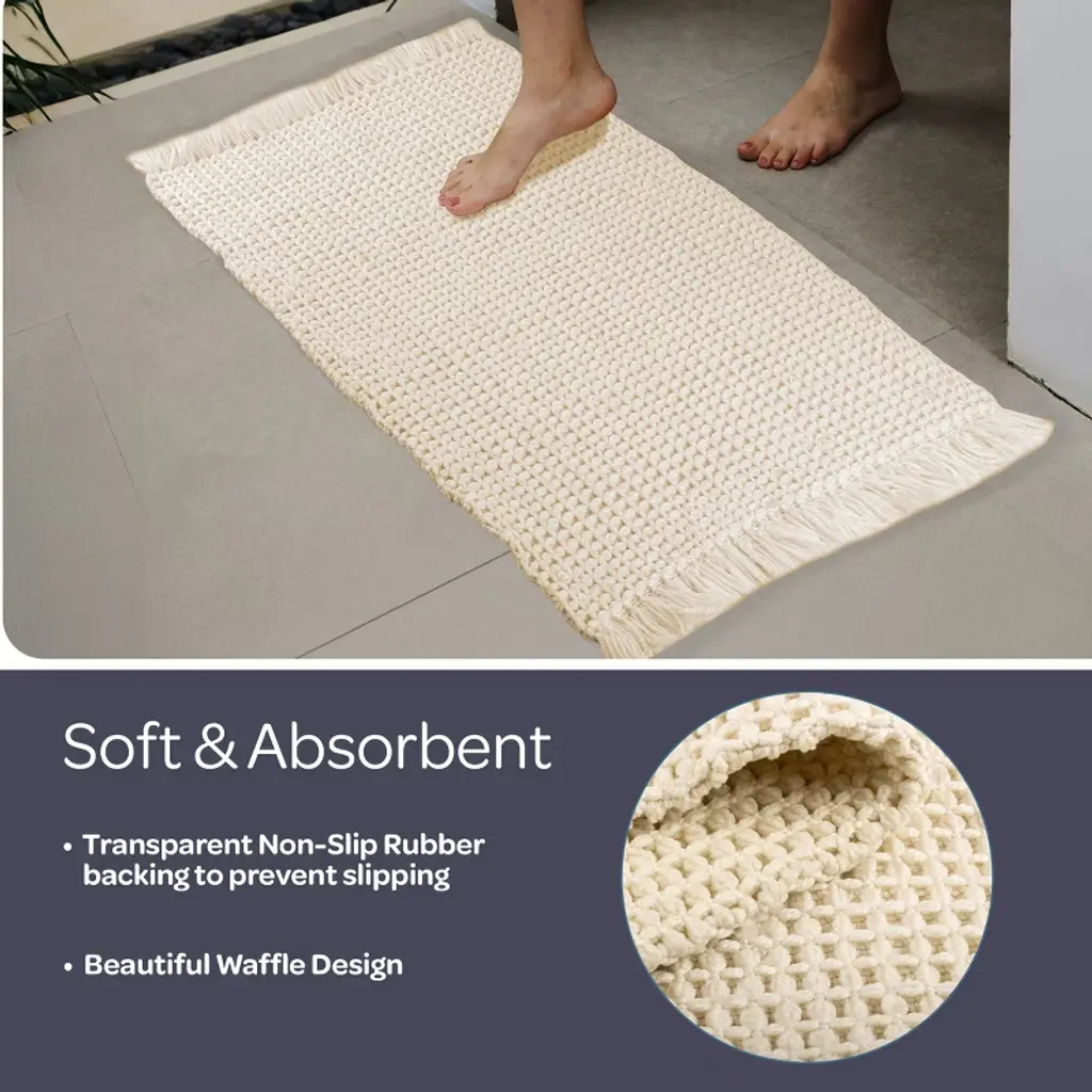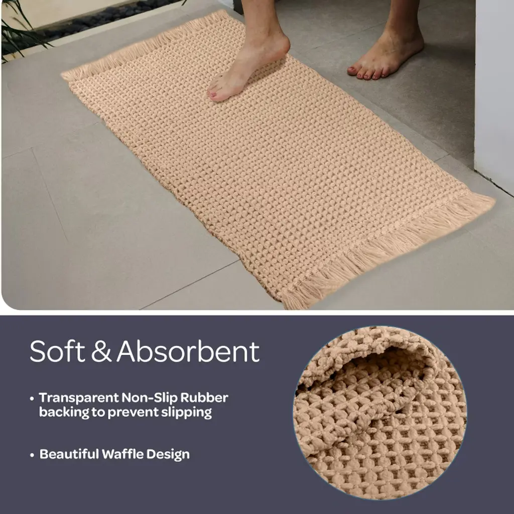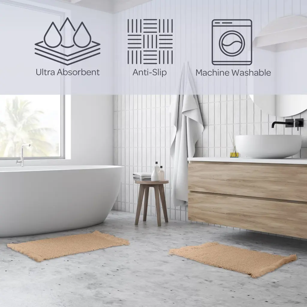 Pamper your feet by stepping out of the shower and onto luxury with the soft Bathroom Mats 2 Piece by Lavish Home. The bathroom rugs set comes with one 17x24-inch bath rug and one 21x34-inch bathmat made of plush cotton with a 1000 GSM thickness, making it soft to the touch as well as absorbent and durable for lasting use in your bathroom, kitchen, or laundry room. Each shower mat has been hand woven on a handloom in India for a truly unique and one-of-a-kind piece of modern bathroom decor.