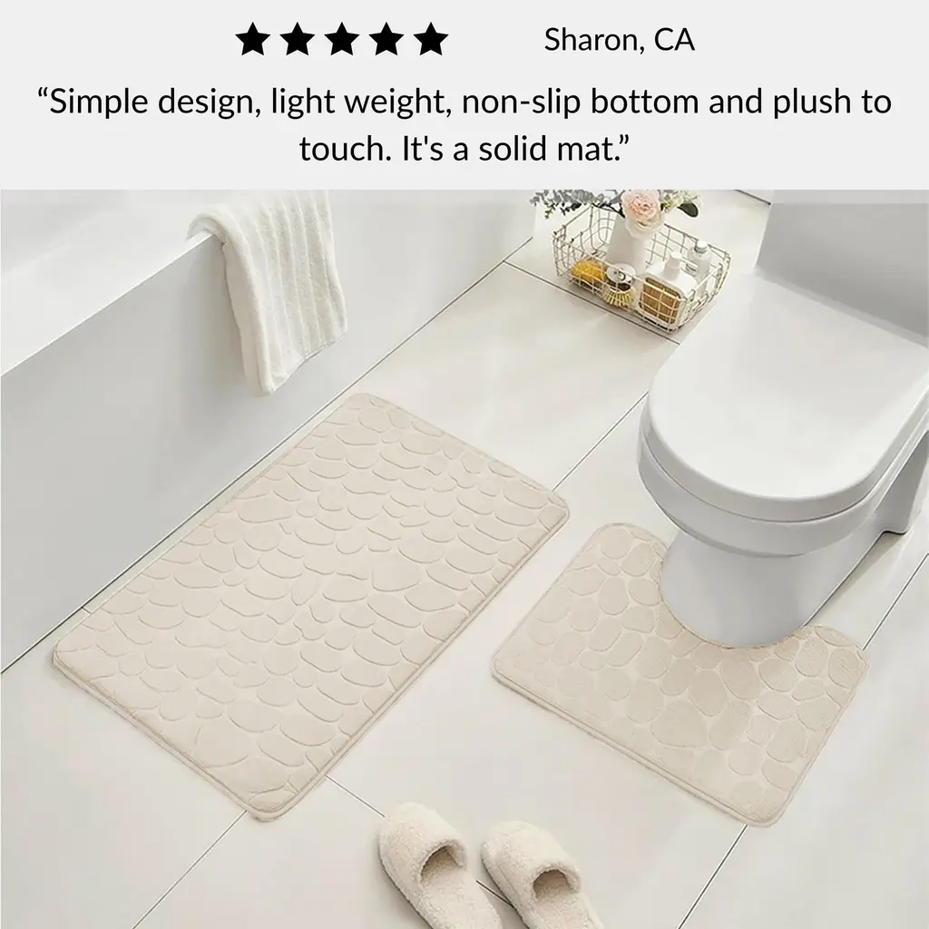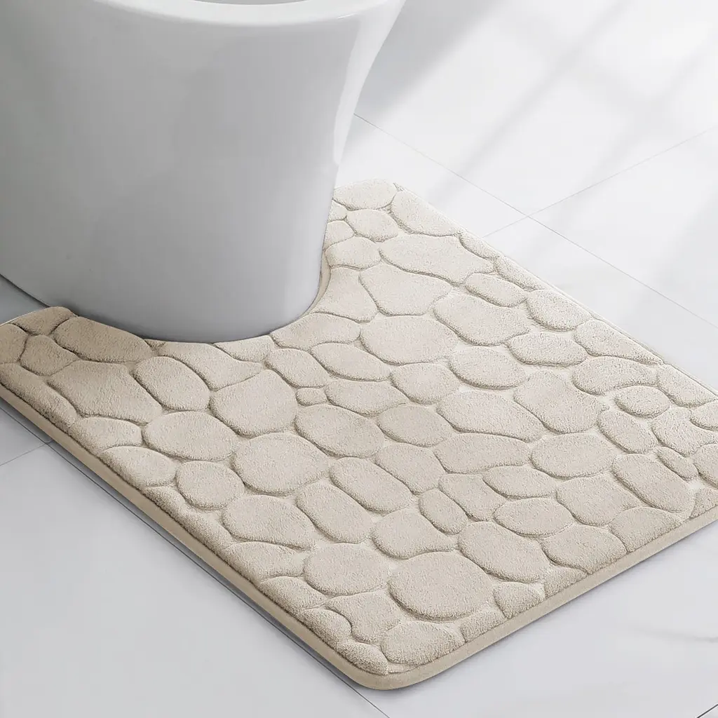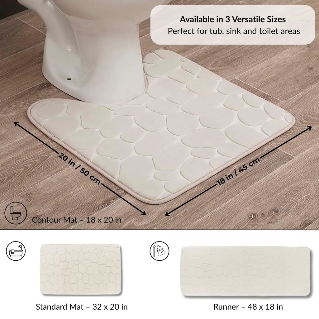 CONTOUR SHAPE FIT: Specifically designed to to wrap neatly around toilet bases, this bathroom floor mat measures 18x20 inches and offers full coverage while enhancing comfort and cleanlinessULTRA-SOFT TOILET MAT: Cushioned for maximum comfort and gently conforming to the shape of your feet, our memory foam mat delivers a plush feel every timeSTONE TEXTURED DESIGN: With its modern 3D pebble pattern, this bathroom mat adds visual depth and a spa-like vibe to your spaceANTI-SLIP BACKING: This small rug features a non-slip bottom that holds it firmly in place on tile or smooth flooring, for added stability and confidenceEASY TO WASH FABRIC: Machine washable at 30°C with no bleach, tumble dry or ironing to preserve shape and softness, this bathmat is ideal for frequent refreshingStart your daily routine in comfort with this Ultra-Soft Memory Foam Toilet Rug, designed to fit perfectly around the base of the toilet. Then, enjoy the memory foam that cushions your feet and helps reduce pressure. Next, the stylish 3D pebble texture adds a modern spa-inspired look to any space. In addition, the compact 18x20 shape of this contour bath rug is perfect for small bathrooms or powder rooms. Also, this small bathroom rug features a durable anti-slip backing to keep it firmly in place on smooth floor. Furthermore, this non slip bath mat is machine washable at 30°C, making it easy to clean. However, avoid bleach, tumble-drying or ironing to preserve texture and color. Moreover, this small bath mat is OEKO-TEX certified, which means it has been tested for potentially harmful substances. Pair it with our matching bathroom rugs to create a coordinated and functional bathroom layout. So, whether you're updating your bathroom space or replacing an old toilet mat, this one offers both comfort and style.