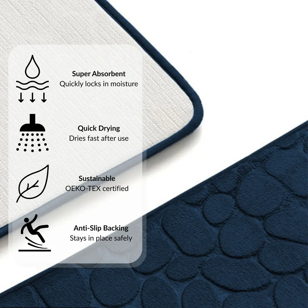 CONTOUR SHAPE FIT: Specifically designed to to wrap neatly around toilet bases, this bathroom floor mat measures 18x20 inches and offers full coverage while enhancing comfort and cleanlinessULTRA-SOFT TOILET MAT: Cushioned for maximum comfort and gently conforming to the shape of your feet, our memory foam mat delivers a plush feel every timeSTONE TEXTURED DESIGN: With its modern 3D pebble pattern, this bathroom mat adds visual depth and a spa-like vibe to your spaceANTI-SLIP BACKING: This small rug features a non-slip bottom that holds it firmly in place on tile or smooth flooring, for added stability and confidenceEASY TO WASH FABRIC: Machine washable at 30°C with no bleach, tumble dry or ironing to preserve shape and softness, this bathmat is ideal for frequent refreshingStart your daily routine in comfort with this Ultra-Soft Memory Foam Toilet Rug, designed to fit perfectly around the base of the toilet. Then, enjoy the memory foam that cushions your feet and helps reduce pressure. Next, the stylish 3D pebble texture adds a modern spa-inspired look to any space. In addition, the compact 18x20 shape of this contour bath rug is perfect for small bathrooms or powder rooms. Also, this small bathroom rug features a durable anti-slip backing to keep it firmly in place on smooth floor. Furthermore, this non slip bath mat is machine washable at 30°C, making it easy to clean. However, avoid bleach, tumble-drying or ironing to preserve texture and color. Moreover, this small bath mat is OEKO-TEX certified, which means it has been tested for potentially harmful substances. Pair it with our matching bathroom rugs to create a coordinated and functional bathroom layout. So, whether you're updating your bathroom space or replacing an old toilet mat, this one offers both comfort and style.