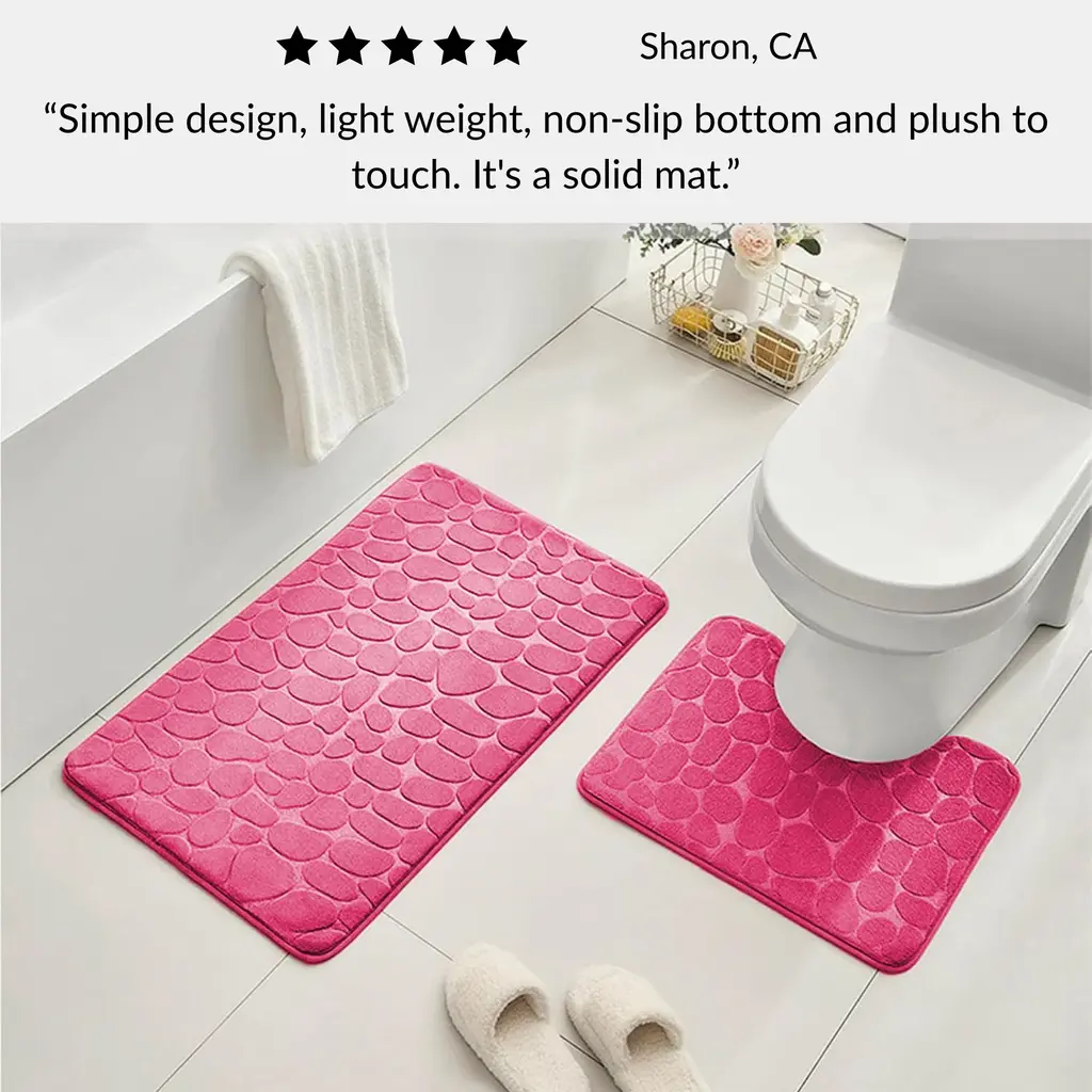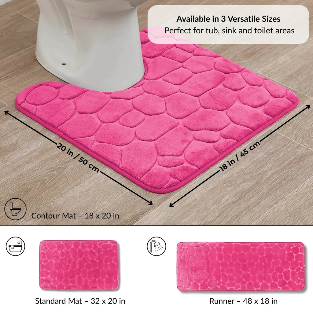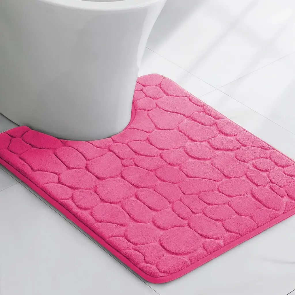 CONTOUR SHAPE FIT: Specifically designed to to wrap neatly around toilet bases, this bathroom floor mat measures 18x20 inches and offers full coverage while enhancing comfort and cleanlinessULTRA-SOFT TOILET MAT: Cushioned for maximum comfort and gently conforming to the shape of your feet, our memory foam mat delivers a plush feel every timeSTONE TEXTURED DESIGN: With its modern 3D pebble pattern, this bathroom mat adds visual depth and a spa-like vibe to your spaceANTI-SLIP BACKING: This small rug features a non-slip bottom that holds it firmly in place on tile or smooth flooring, for added stability and confidenceEASY TO WASH FABRIC: Machine washable at 30°C with no bleach, tumble dry or ironing to preserve shape and softness, this bathmat is ideal for frequent refreshingStart your daily routine in comfort with this Ultra-Soft Memory Foam Toilet Rug, designed to fit perfectly around the base of the toilet. Then, enjoy the memory foam that cushions your feet and helps reduce pressure. Next, the stylish 3D pebble texture adds a modern spa-inspired look to any space. In addition, the compact 18x20 shape of this contour bath rug is perfect for small bathrooms or powder rooms. Also, this small bathroom rug features a durable anti-slip backing to keep it firmly in place on smooth floor. Furthermore, this non slip bath mat is machine washable at 30°C, making it easy to clean. However, avoid bleach, tumble-drying or ironing to preserve texture and color. Moreover, this small bath mat is OEKO-TEX certified, which means it has been tested for potentially harmful substances. Pair it with our matching bathroom rugs to create a coordinated and functional bathroom layout. So, whether you're updating your bathroom space or replacing an old toilet mat, this one offers both comfort and style.