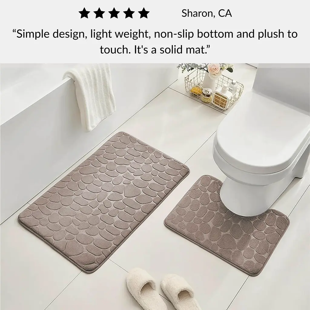 CONTOUR SHAPE FIT: Specifically designed to to wrap neatly around toilet bases, this bathroom floor mat measures 18x20 inches and offers full coverage while enhancing comfort and cleanlinessULTRA-SOFT TOILET MAT: Cushioned for maximum comfort and gently conforming to the shape of your feet, our memory foam mat delivers a plush feel every timeSTONE TEXTURED DESIGN: With its modern 3D pebble pattern, this bathroom mat adds visual depth and a spa-like vibe to your spaceANTI-SLIP BACKING: This small rug features a non-slip bottom that holds it firmly in place on tile or smooth flooring, for added stability and confidenceEASY TO WASH FABRIC: Machine washable at 30°C with no bleach, tumble dry or ironing to preserve shape and softness, this bathmat is ideal for frequent refreshingStart your daily routine in comfort with this Ultra-Soft Memory Foam Toilet Rug, designed to fit perfectly around the base of the toilet. Then, enjoy the memory foam that cushions your feet and helps reduce pressure. Next, the stylish 3D pebble texture adds a modern spa-inspired look to any space. In addition, the compact 18x20 shape of this contour bath rug is perfect for small bathrooms or powder rooms. Also, this small bathroom rug features a durable anti-slip backing to keep it firmly in place on smooth floor. Furthermore, this non slip bath mat is machine washable at 30°C, making it easy to clean. However, avoid bleach, tumble-drying or ironing to preserve texture and color. Moreover, this small bath mat is OEKO-TEX certified, which means it has been tested for potentially harmful substances. Pair it with our matching bathroom rugs to create a coordinated and functional bathroom layout. So, whether you're updating your bathroom space or replacing an old toilet mat, this one offers both comfort and style.