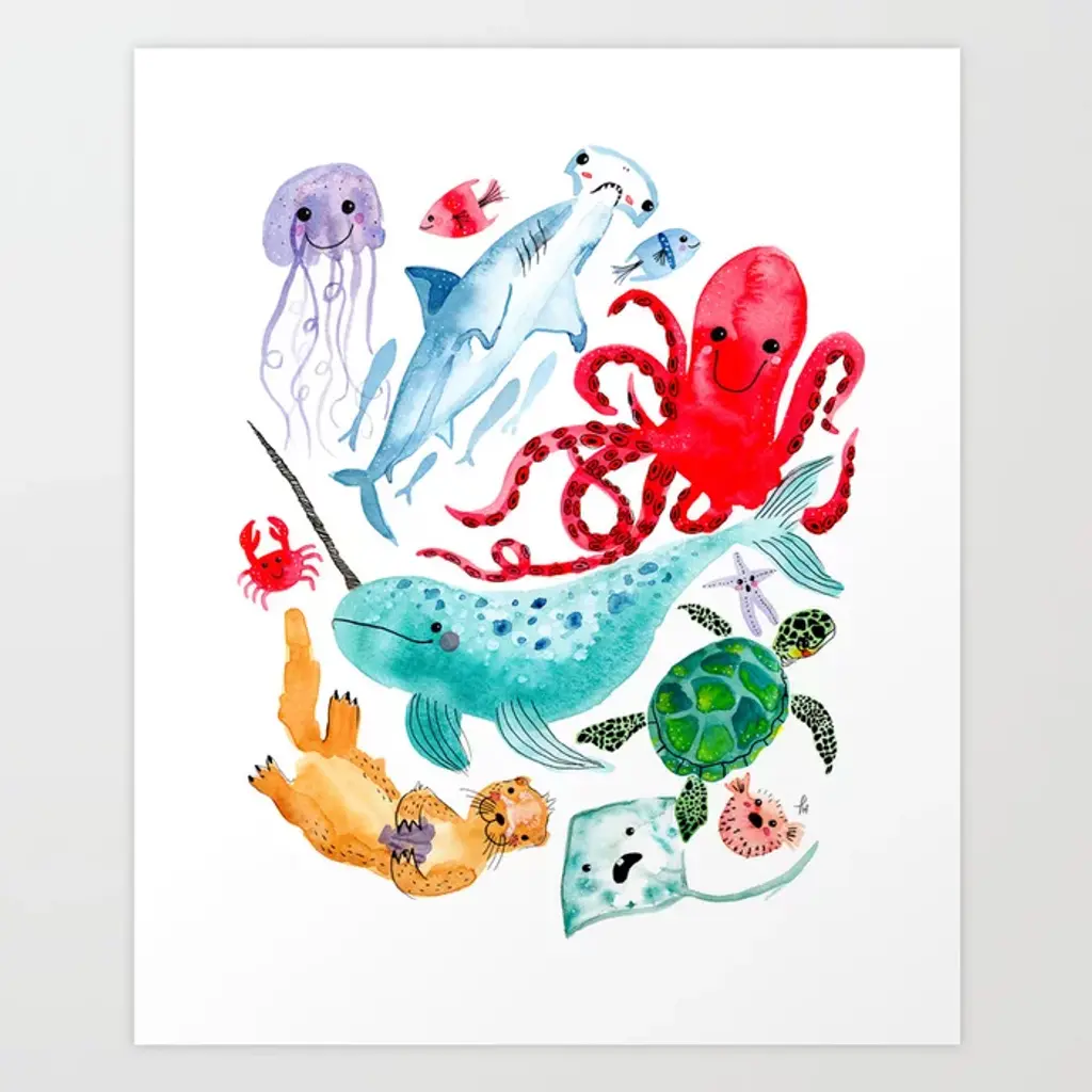 Ocean Creatures - Sea Animals Characters - Watercolor Bath Mat